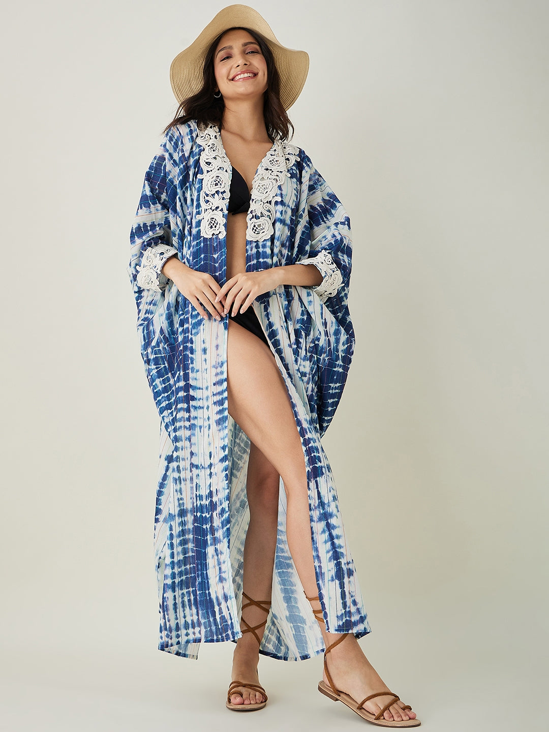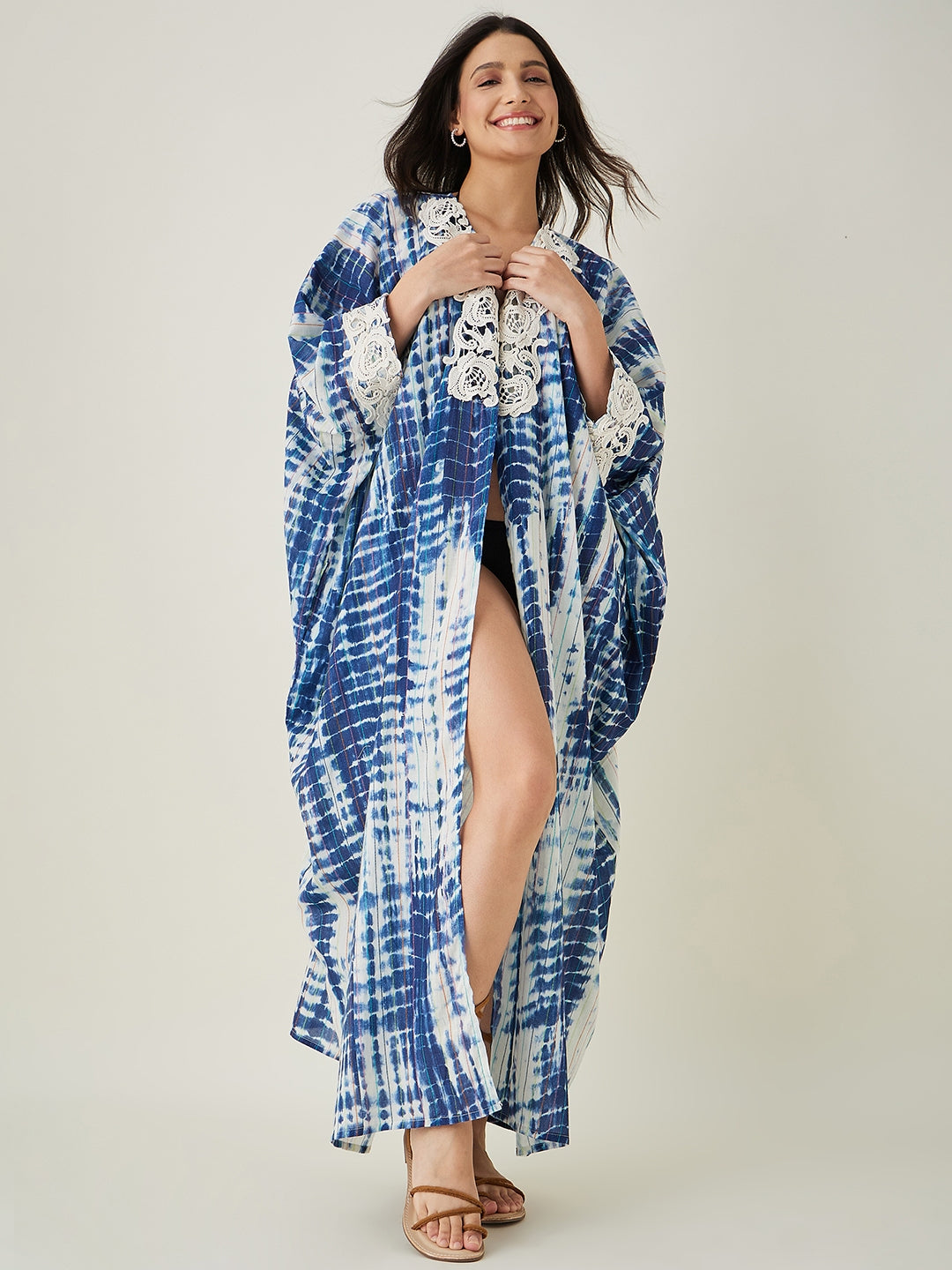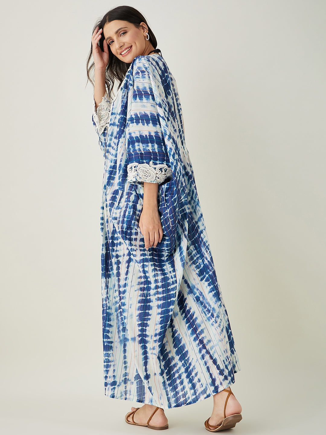 Blue Tie Dye Printed Free size Gown with complimenting lace on the neck and Sleeve Round