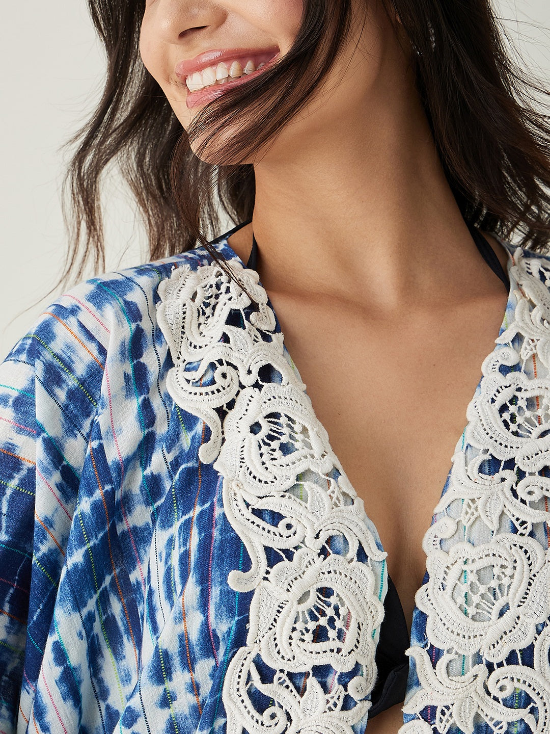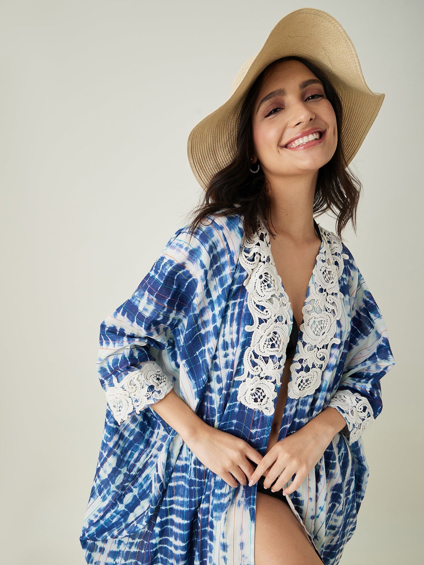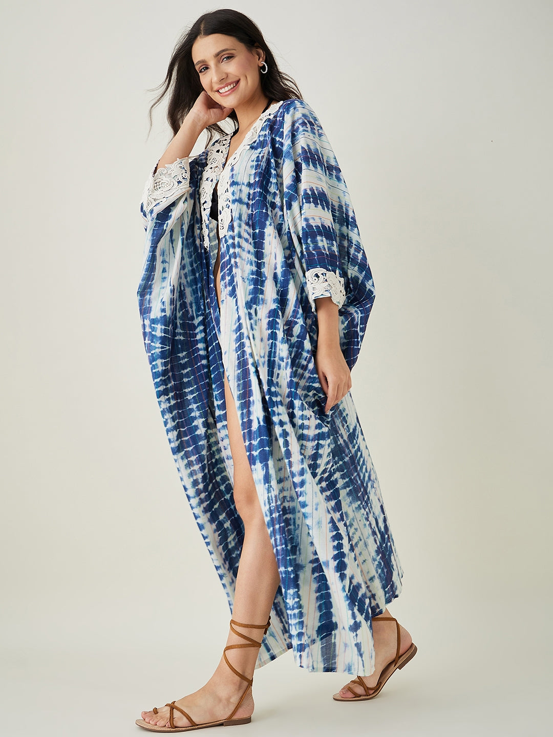 Blue Tie Dye Printed Free size Gown with complimenting lace on the neck and Sleeve Round