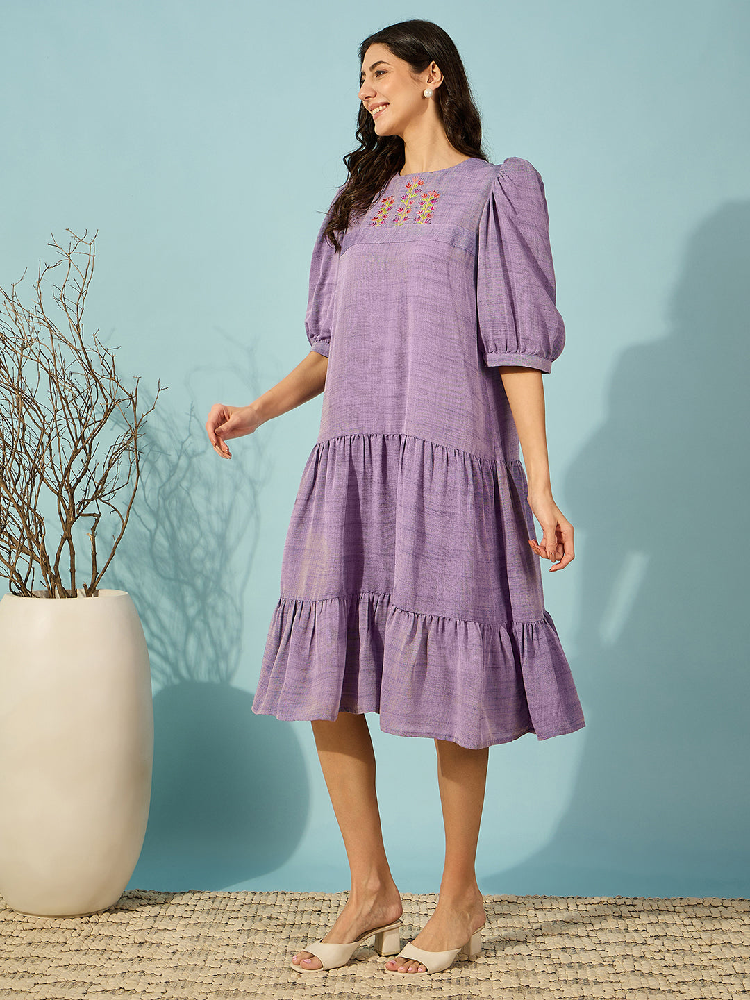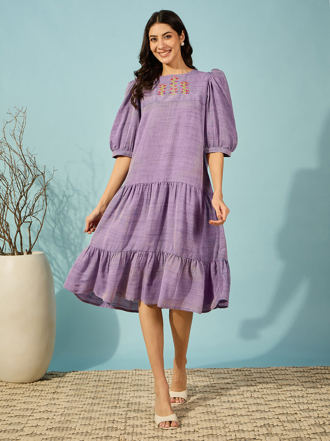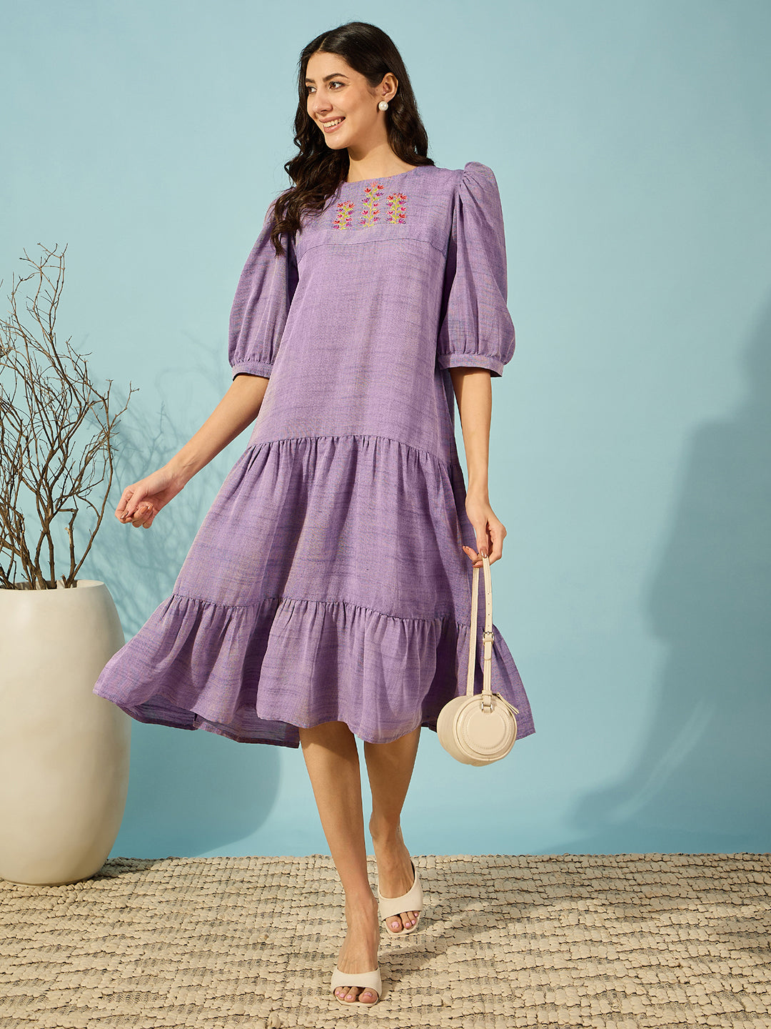 Elevate Your Style With Our Purple Hand Embroidered Viscose Linen Tier Dress. Featuring Intricate Hand Embroidery, A Tiered Design, And Three-Quarter Puffed Sleeves, This Elegant Piece Combines Luxurious Fabric With Artisanal Craftsmanship For A Truly Distinctive Look.