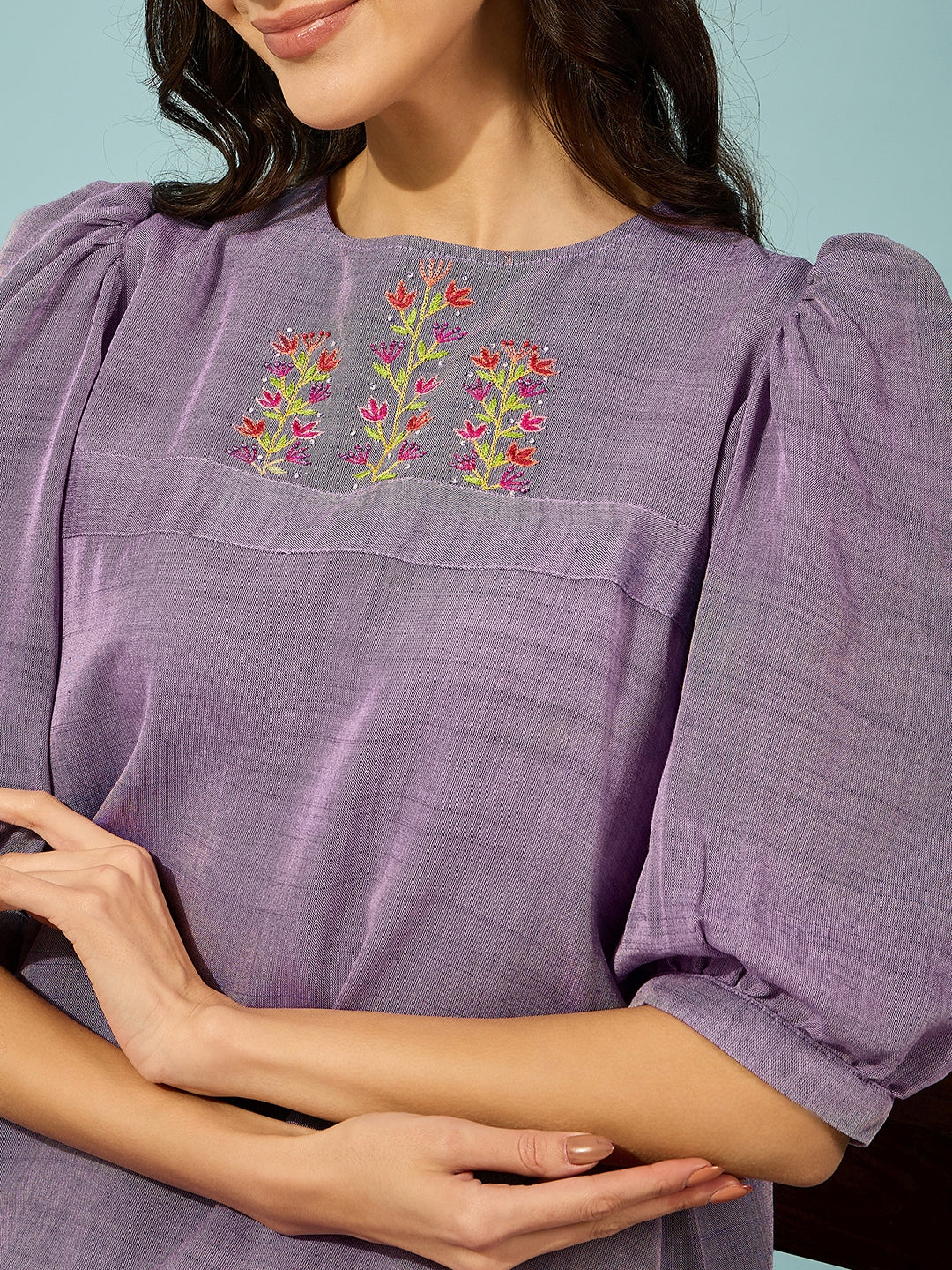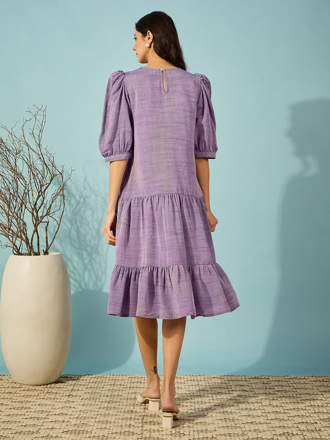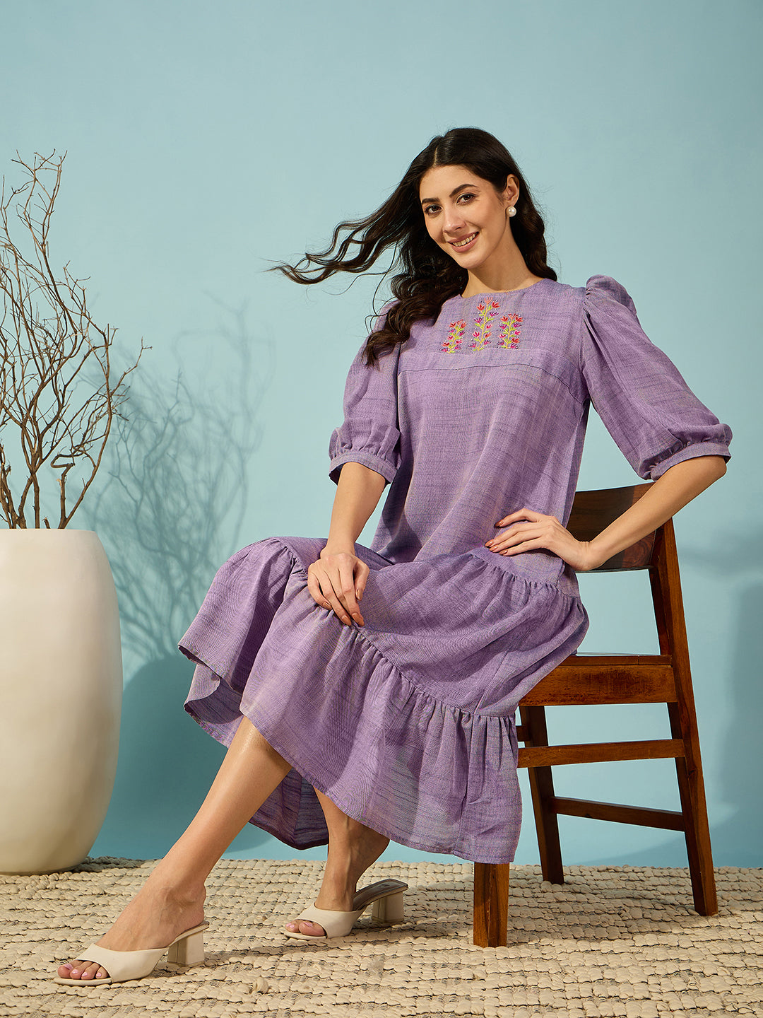 Elevate Your Style With Our Purple Hand Embroidered Viscose Linen Tier Dress. Featuring Intricate Hand Embroidery, A Tiered Design, And Three-Quarter Puffed Sleeves, This Elegant Piece Combines Luxurious Fabric With Artisanal Craftsmanship For A Truly Distinctive Look.