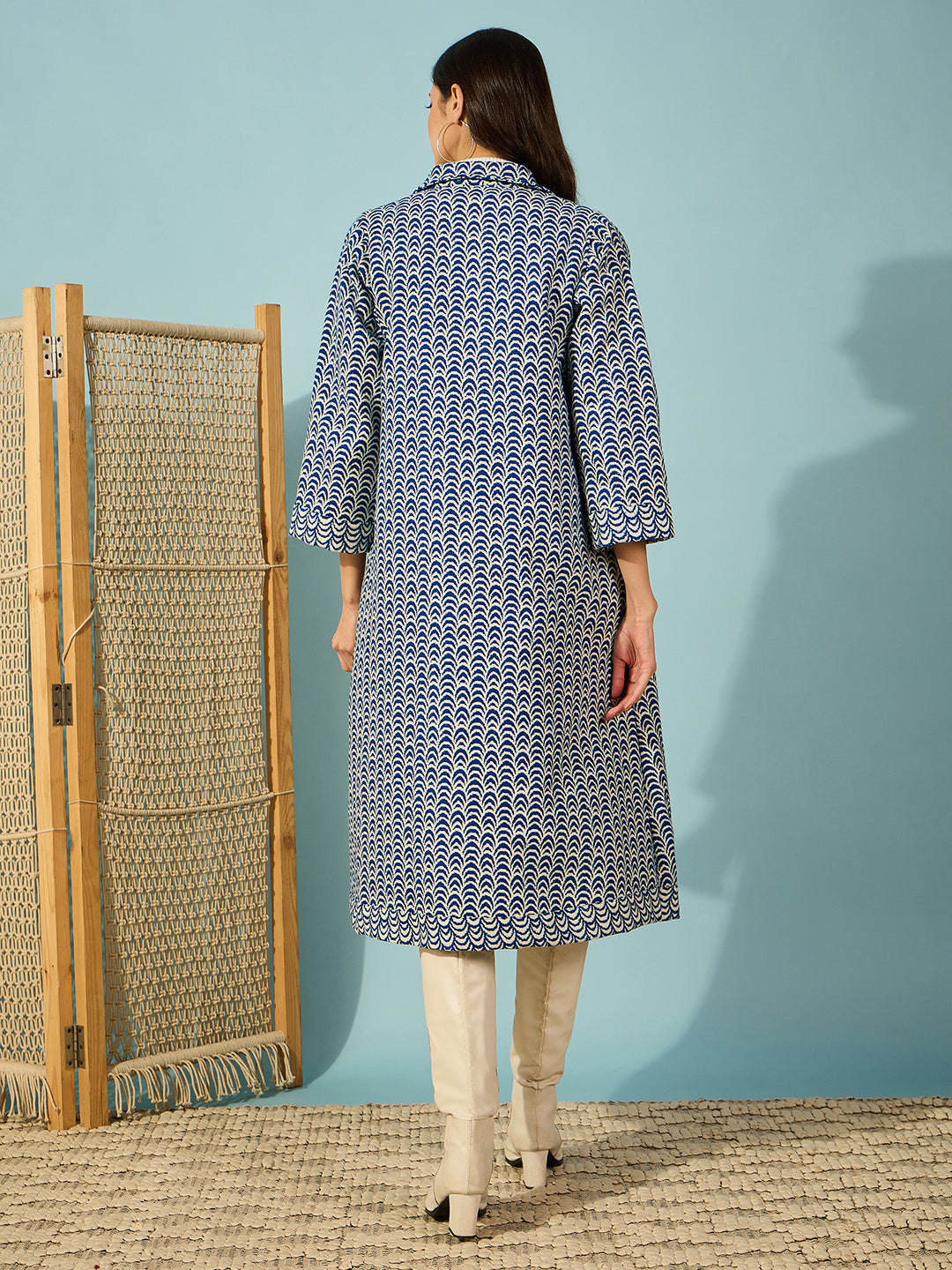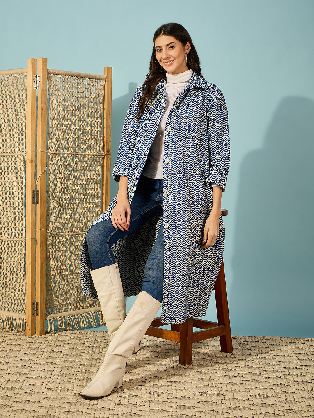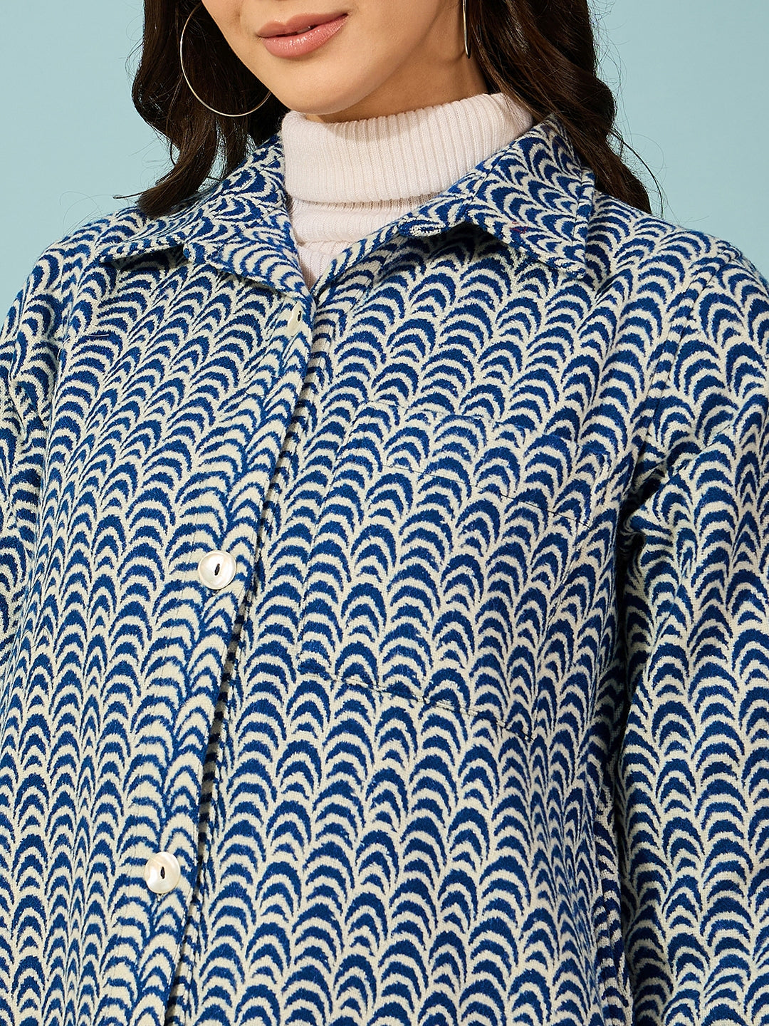 Elevate Your Daywear With Our Blue Abstract Printed Woollen Jacket. Featuring Elegant Shell Buttons, It'S The Perfect Blend Of Style And Comfort For Any Casual Outing