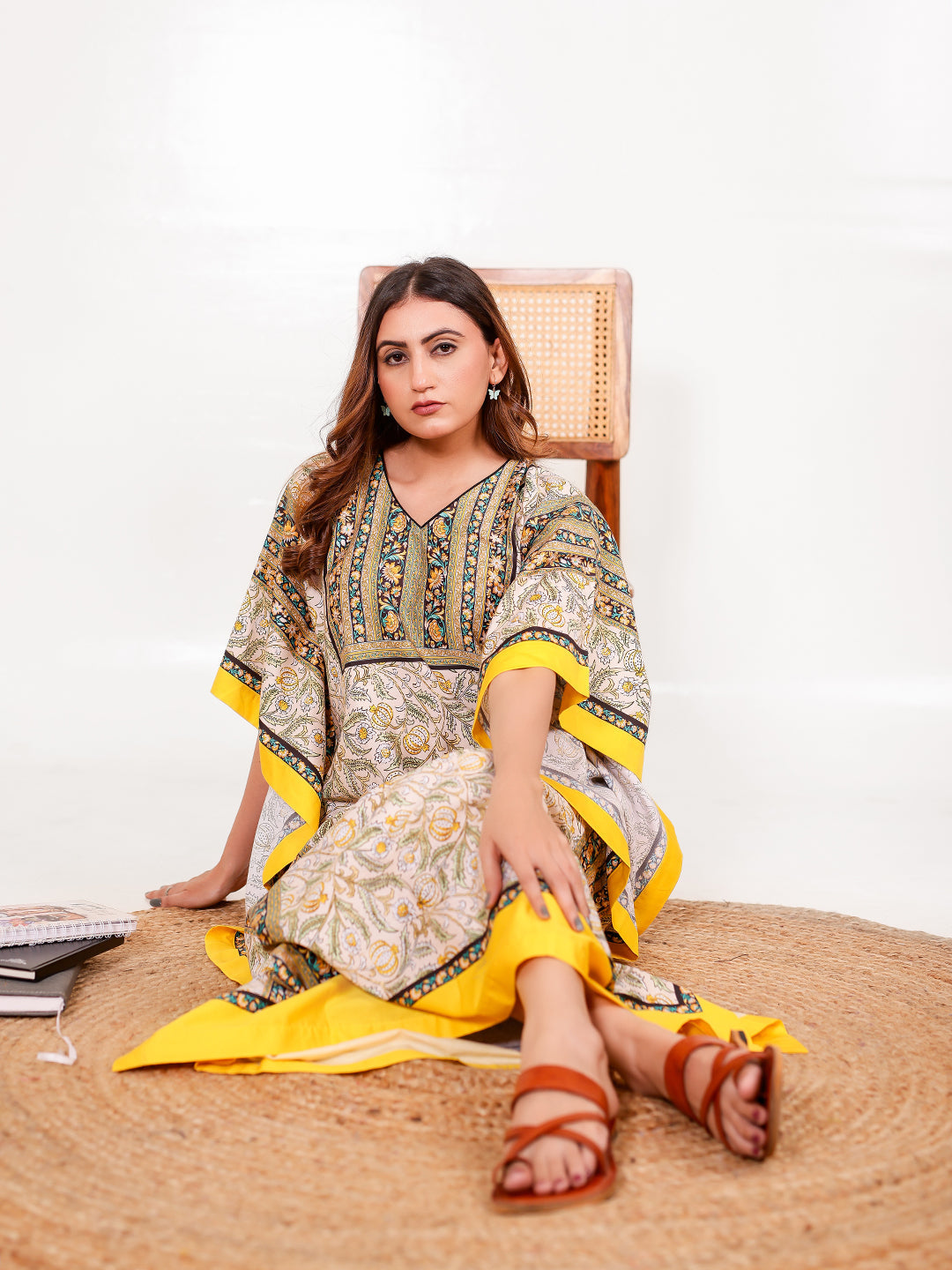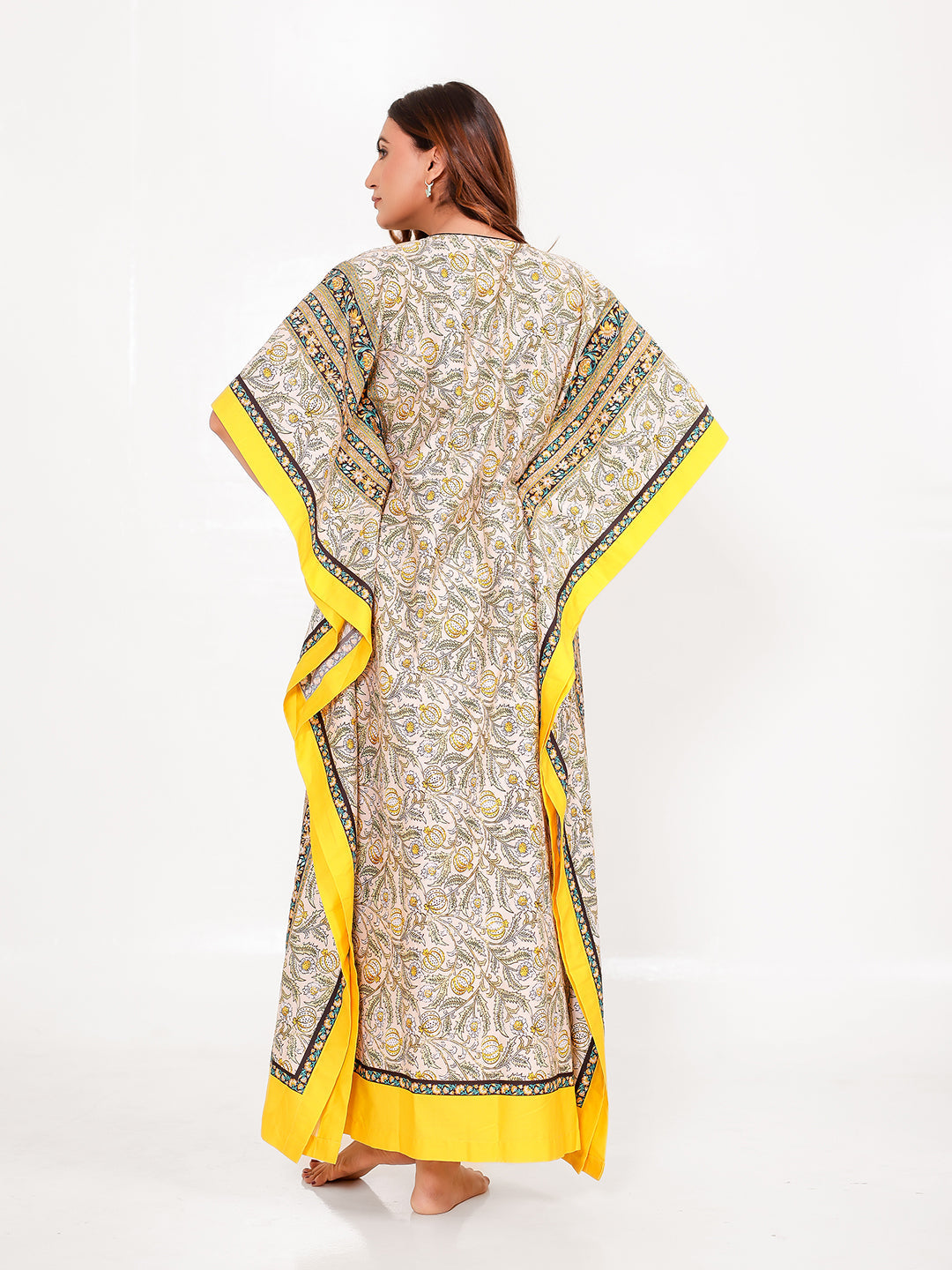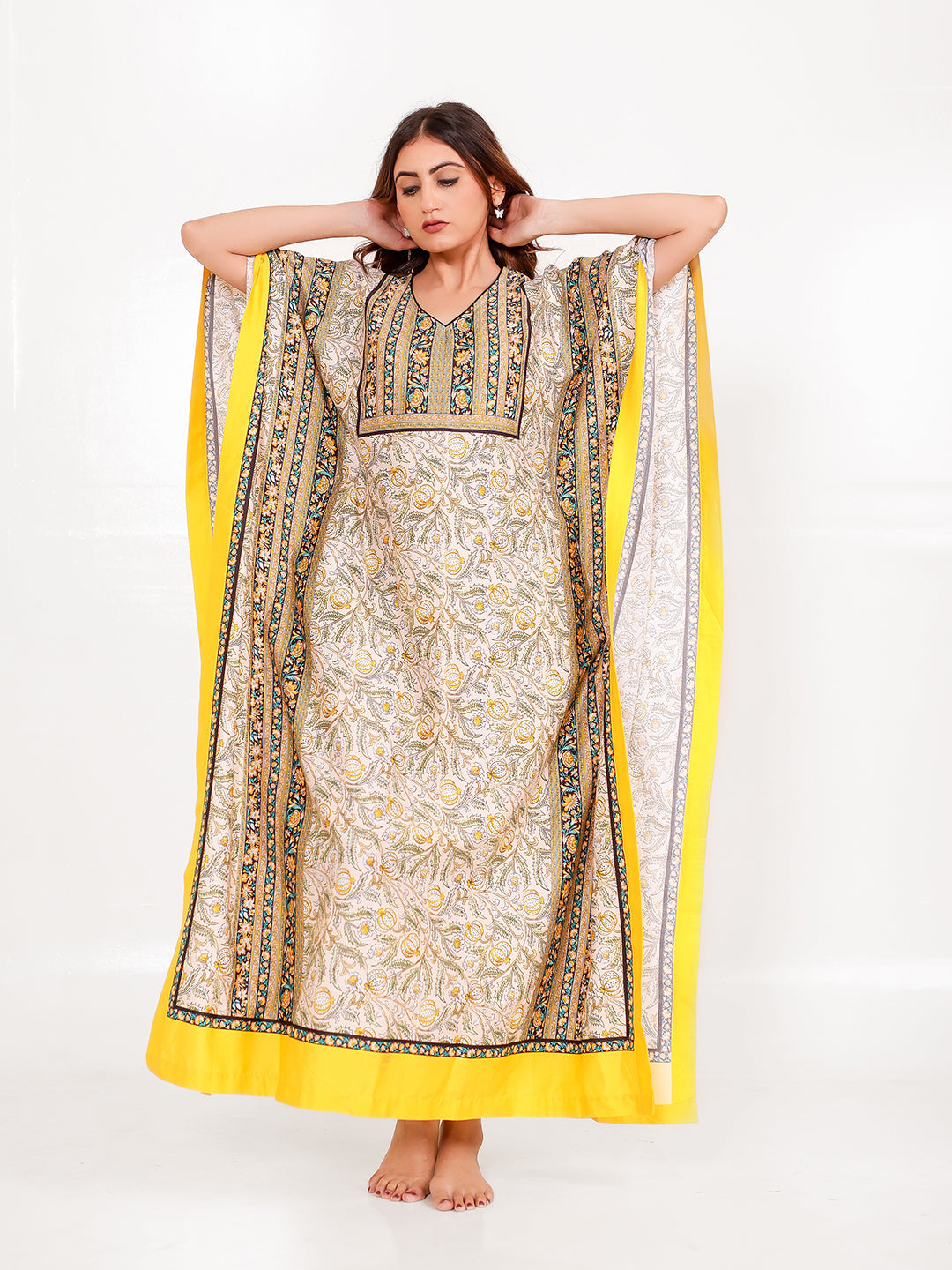 Transform Your Lounging Experience With This Radiant Cream Kaftan That Perfectly Balances Comfort And Style. Framed With A Sunshine-Yellow Border And Artful Floral Panels, Its Flowing Silhouette Makes Every At-Home Moment Feel Luxurious. Crafted From A Breathable Cotton-Viscose Blend, This Maxi Kaftan Drapes Beautifully While Keeping You Cool And Effortlessly Chic—Whether Relaxing At Home, Traveling, Or Stepping Out For A Casual Brunch.