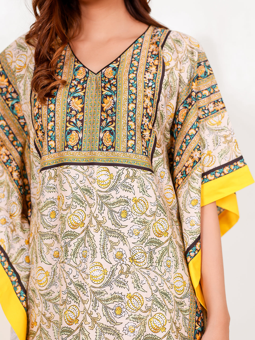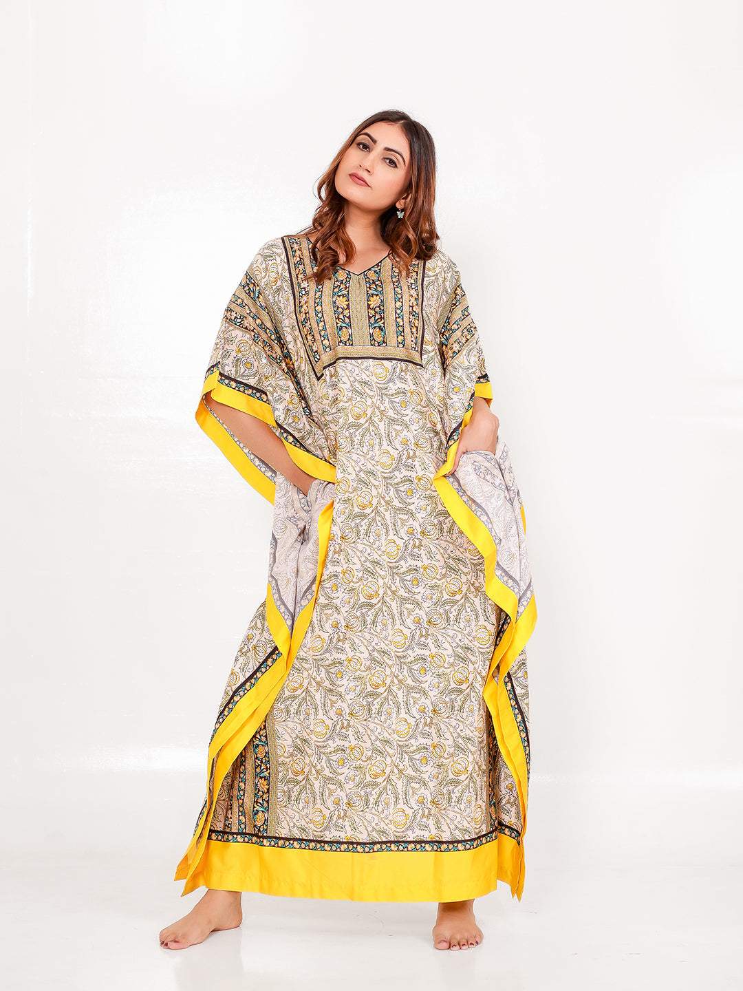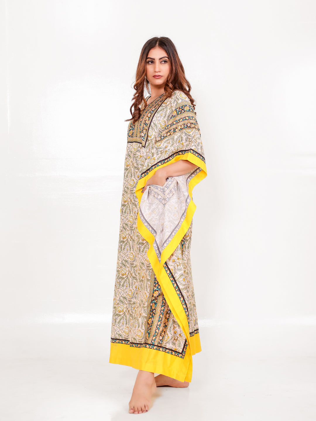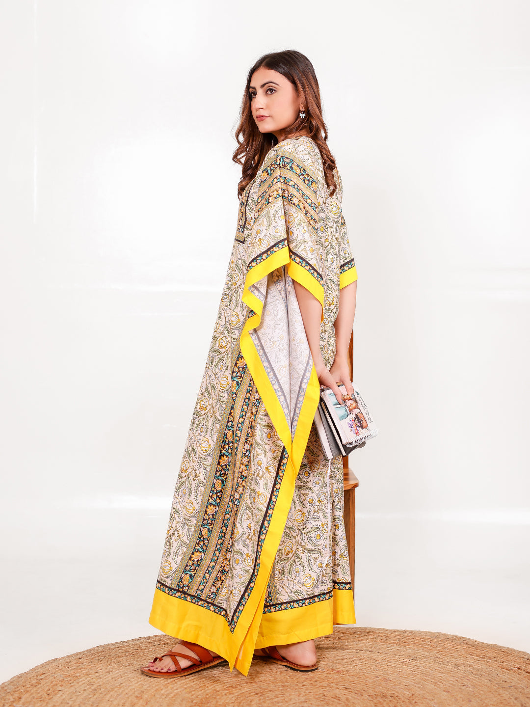 Transform Your Lounging Experience With This Radiant Cream Kaftan That Perfectly Balances Comfort And Style. Framed With A Sunshine-Yellow Border And Artful Floral Panels, Its Flowing Silhouette Makes Every At-Home Moment Feel Luxurious. Crafted From A Breathable Cotton-Viscose Blend, This Maxi Kaftan Drapes Beautifully While Keeping You Cool And Effortlessly Chic—Whether Relaxing At Home, Traveling, Or Stepping Out For A Casual Brunch.