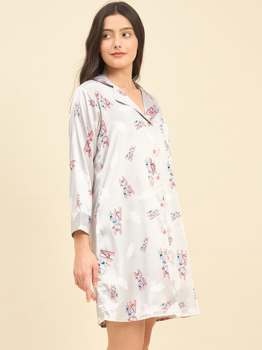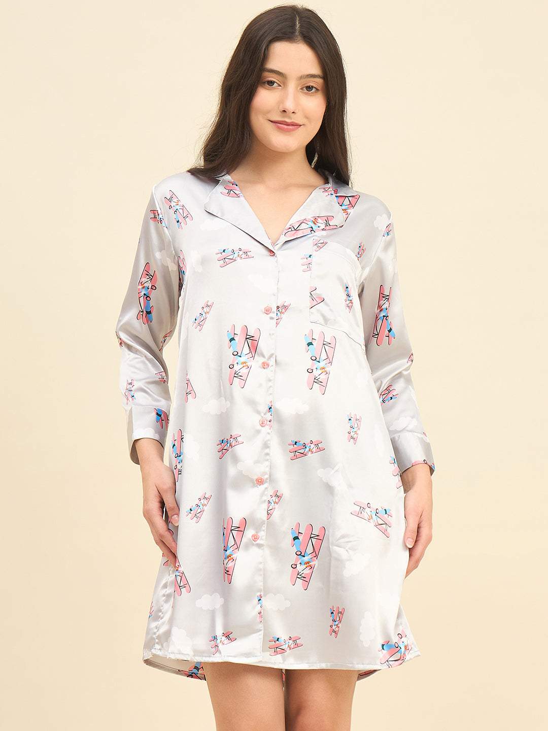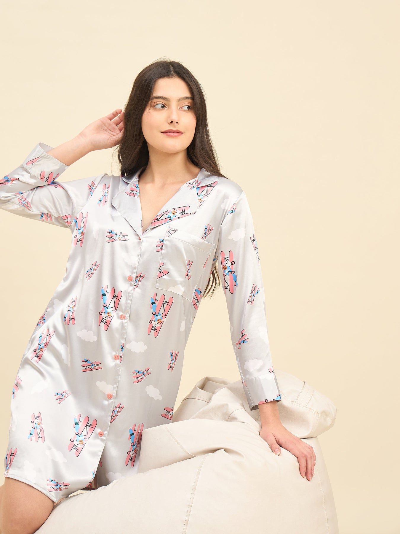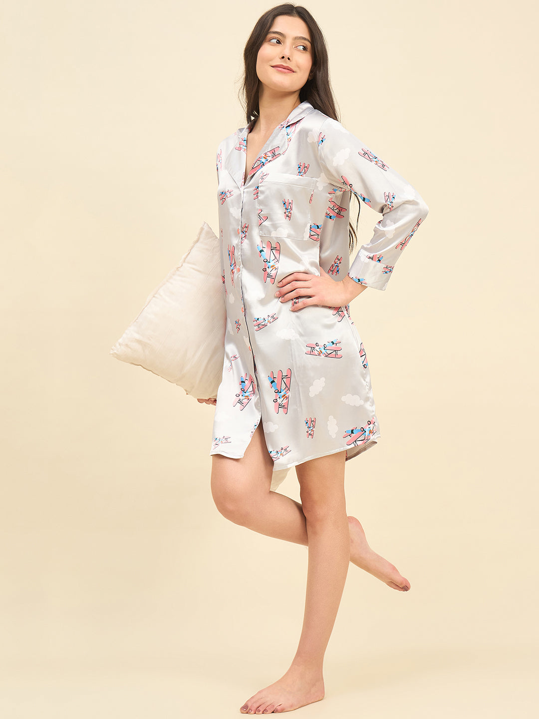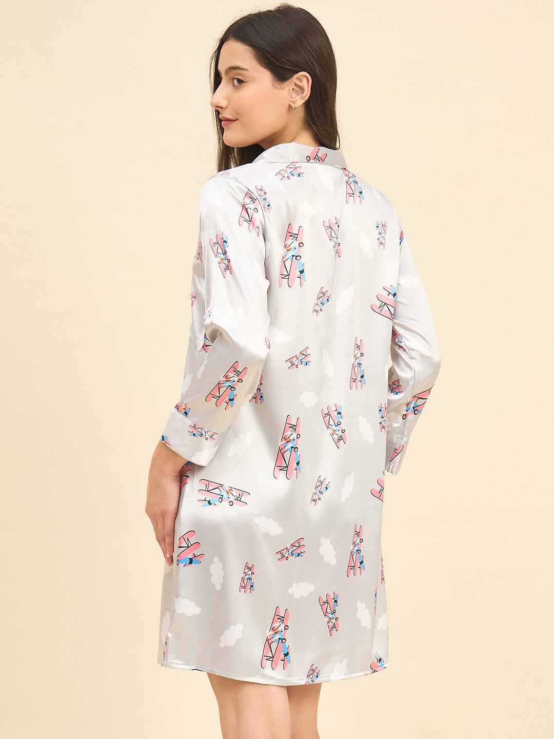 Grey Aeroplane Printed Nightdress, Featuring A Button-Down Front And Smart Convertible Collar For A Playful Yet Relaxed Sleepwear Look.