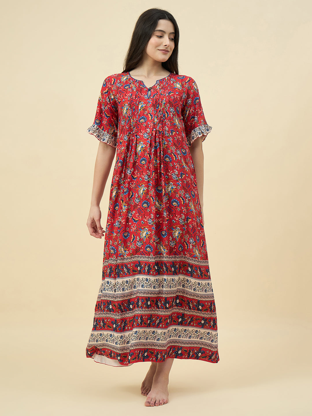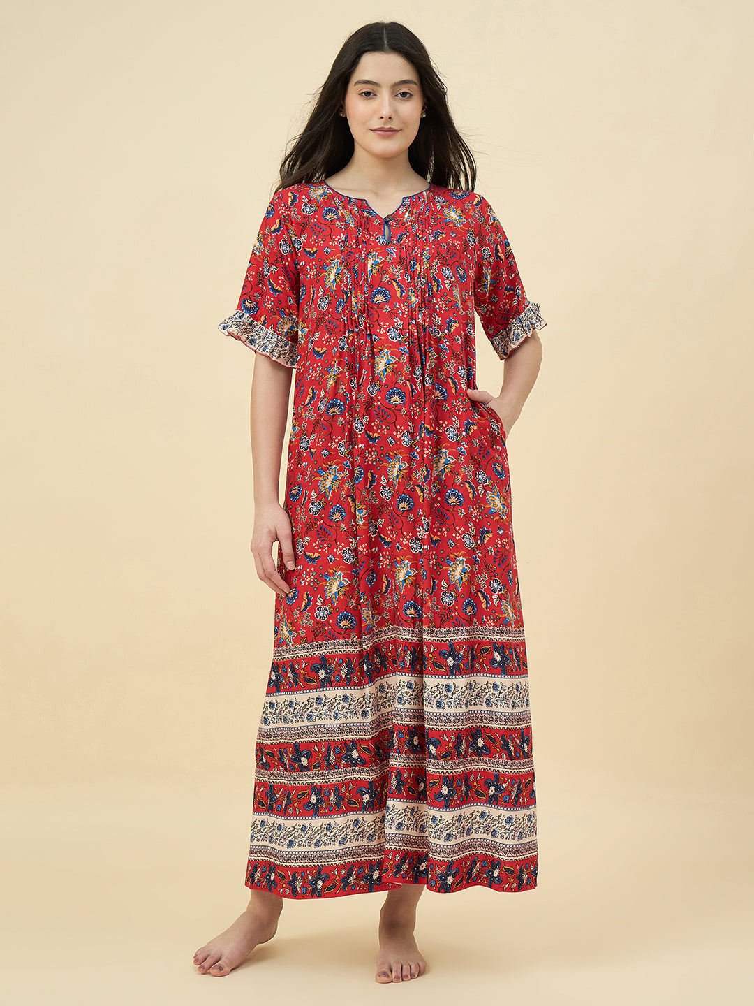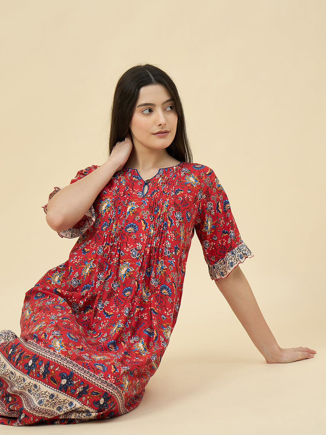 Red Floral Cotton Viscose Nightdress – Pintuck Front & Pockets