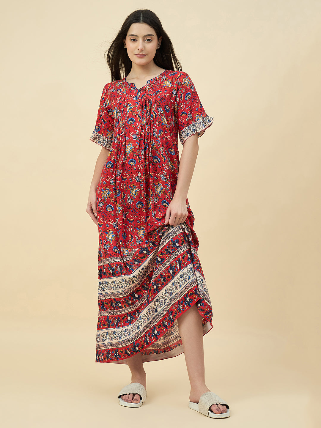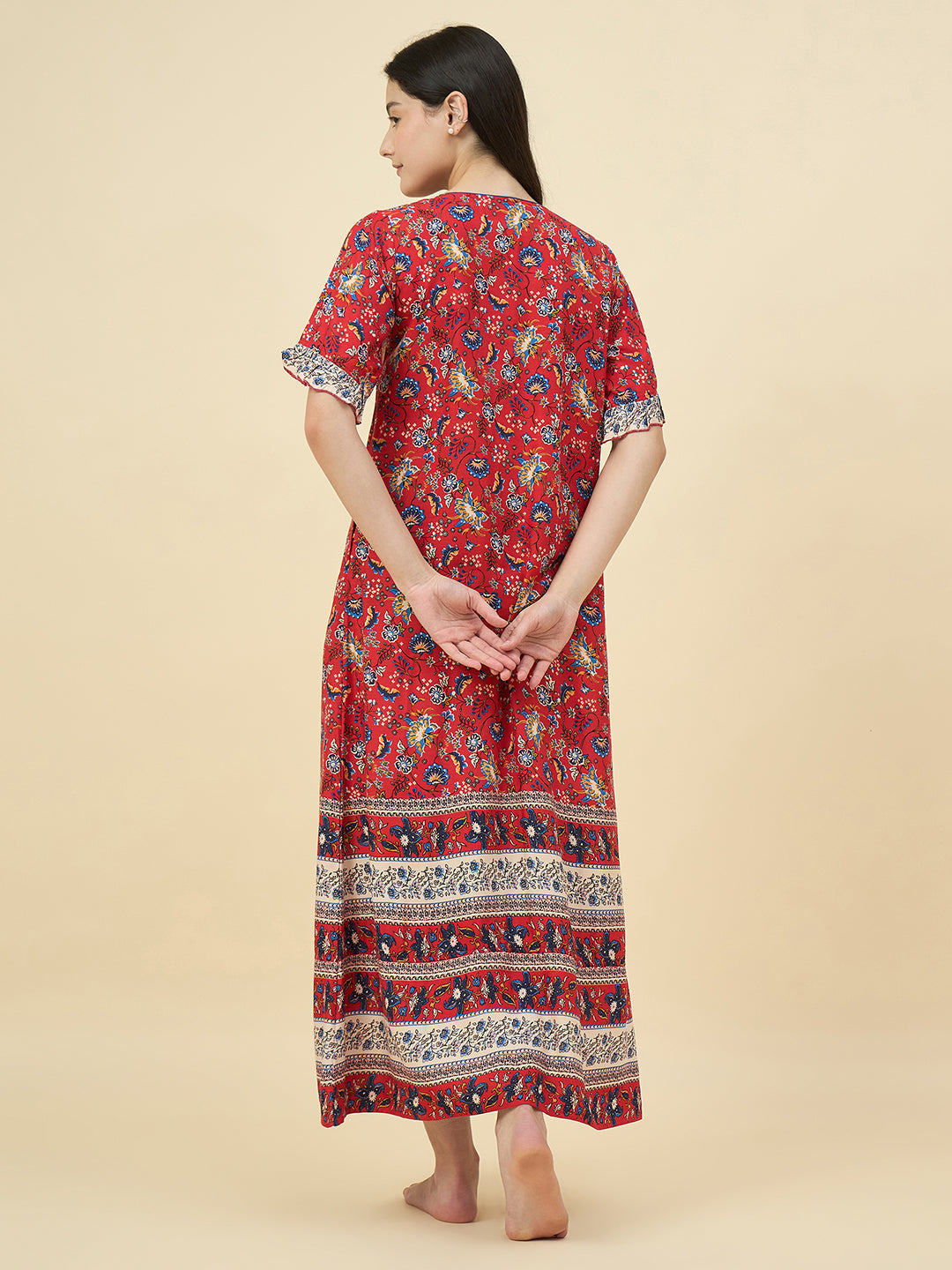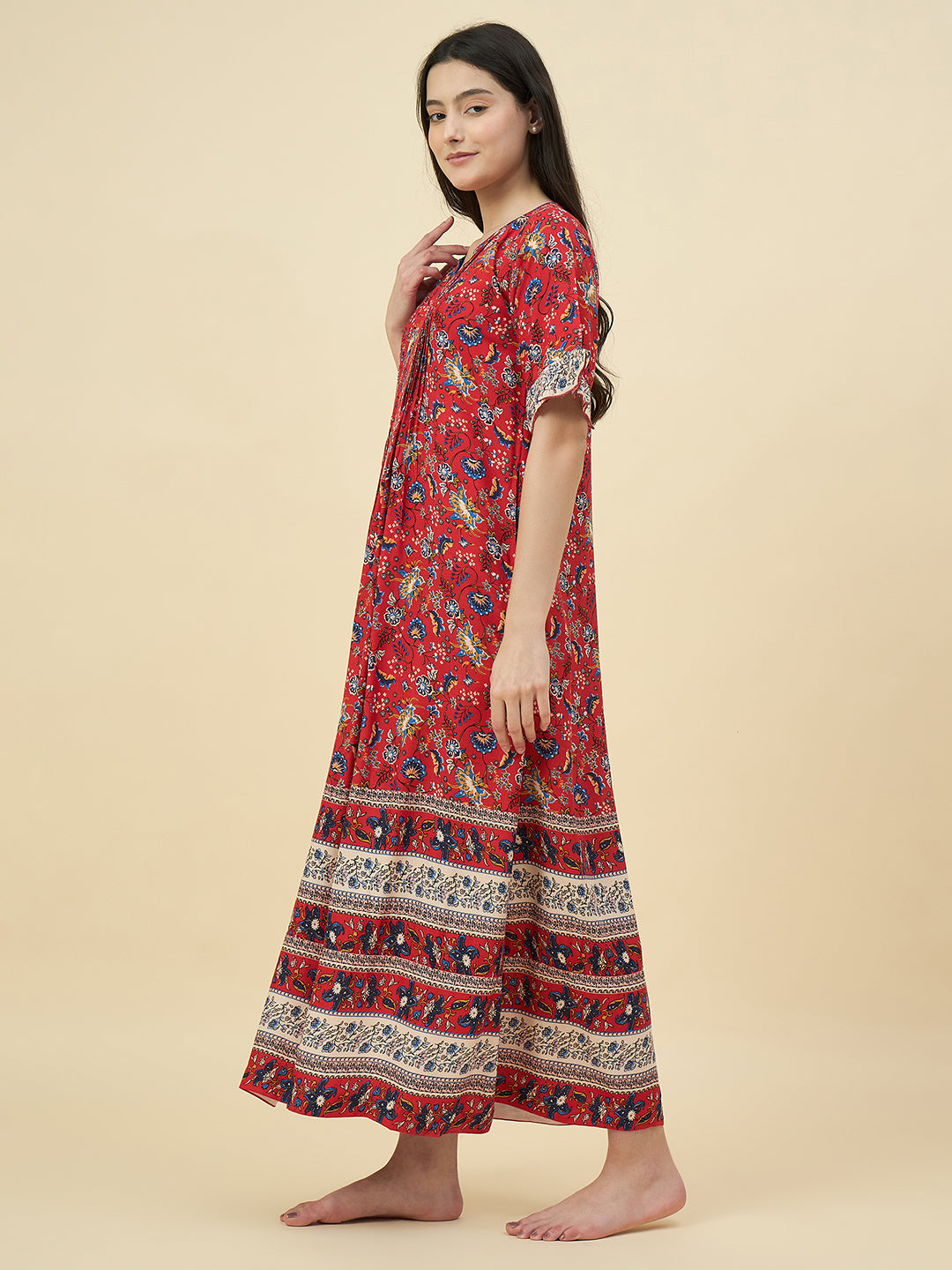Red Floral Cotton Viscose Nightdress – Pintuck Front & Pockets