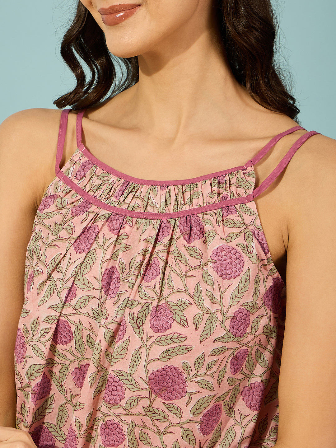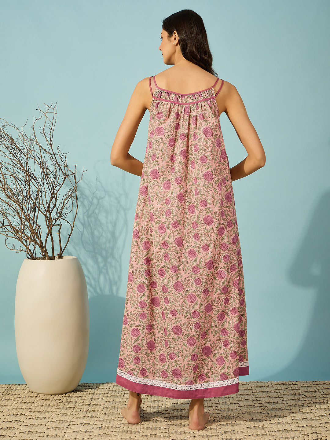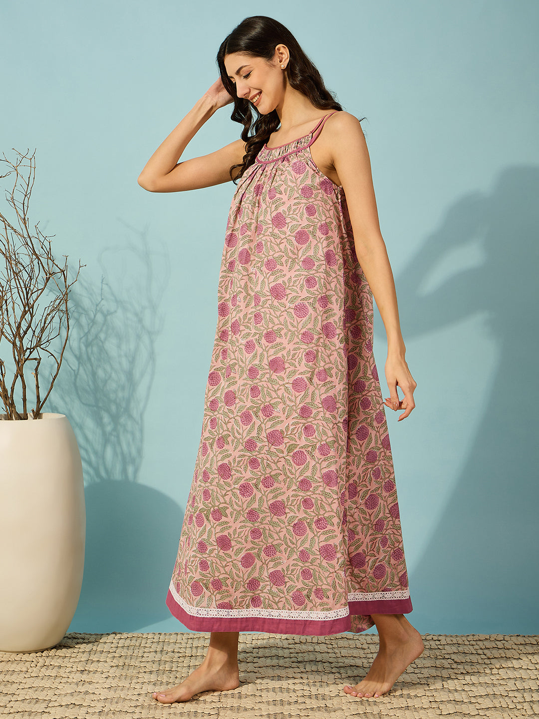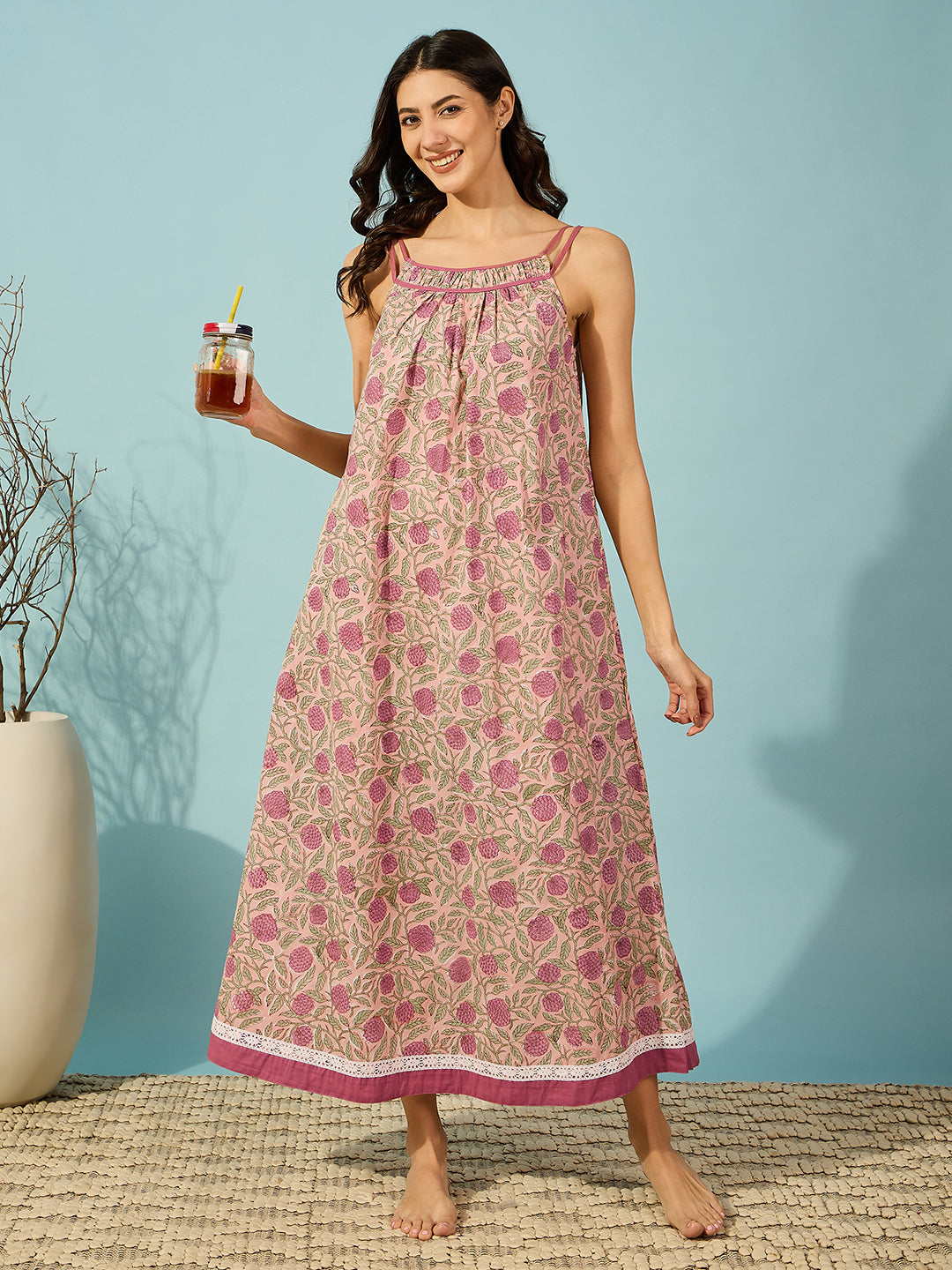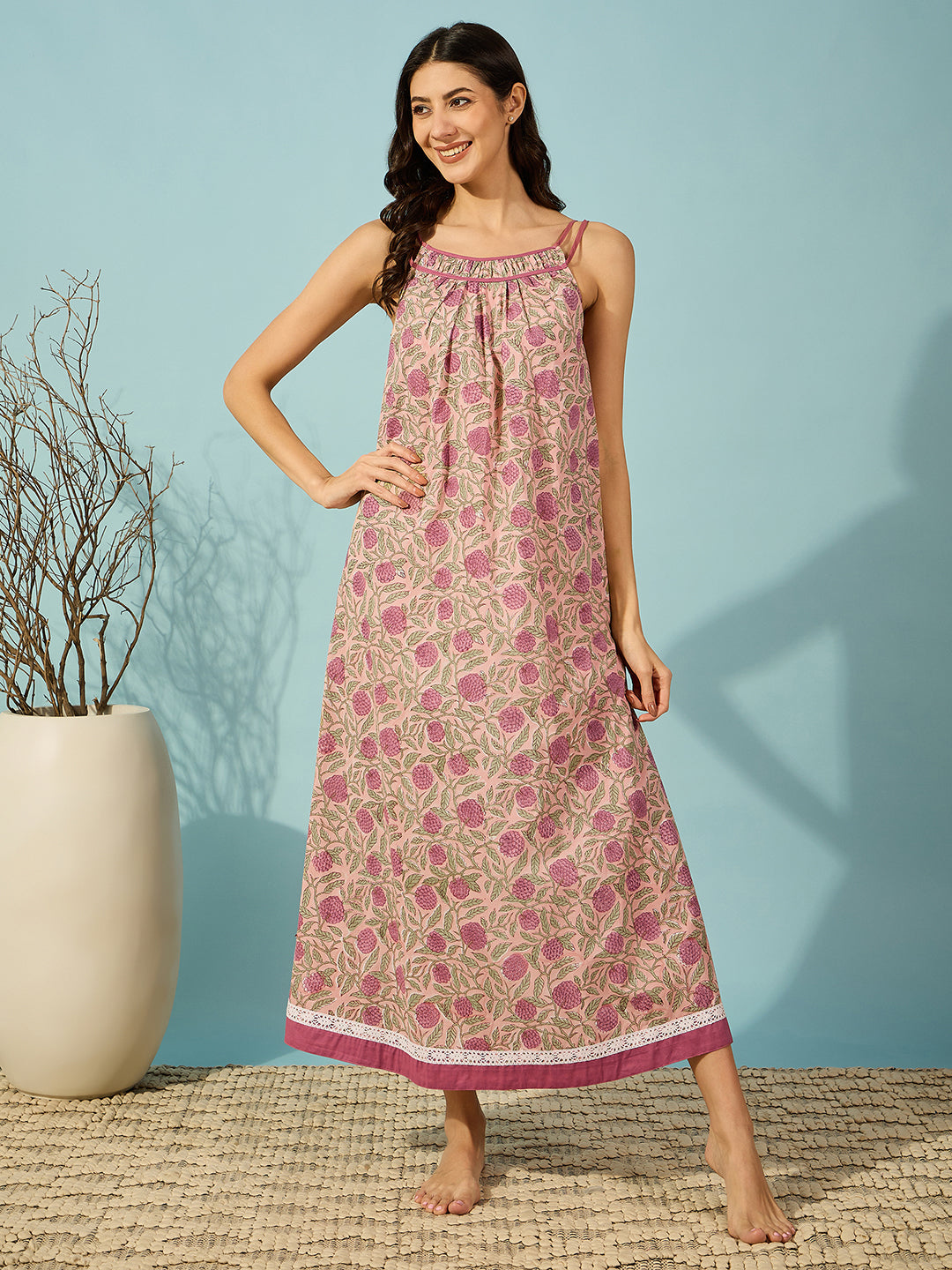 Unwind In Style With Our Pink Floral Block Print Cotton Negligee. This Charming Piece Features A Beautiful Floral Design On Soft Cotton Fabric, Offering Both Comfort And Elegance For Your Nighttime Routine