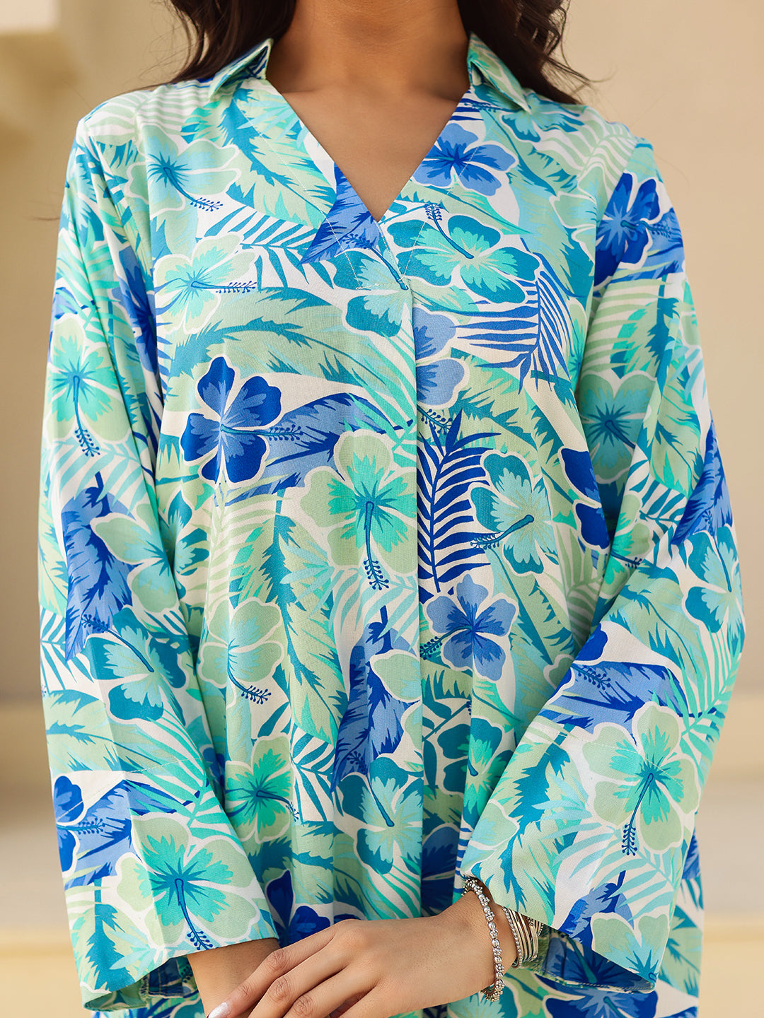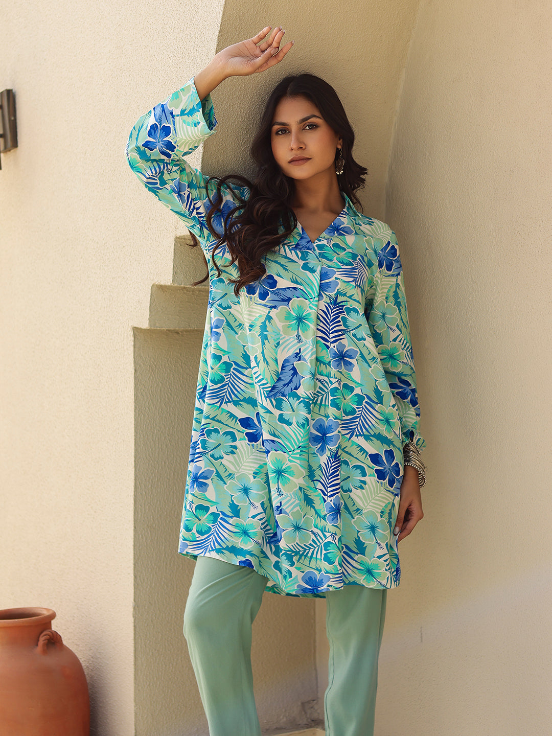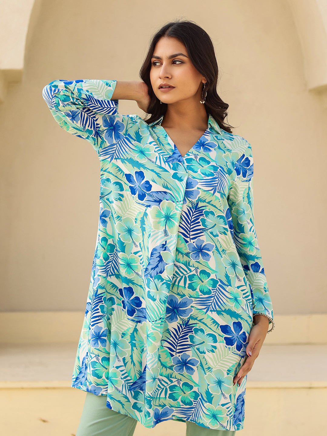 Shop The Blue & Green Tropical Print Viscose Kurta. Features A Fluid Drape, V-Neck, And Summer-Ready Floral Print. Perfect For Casual Vacation Wear.