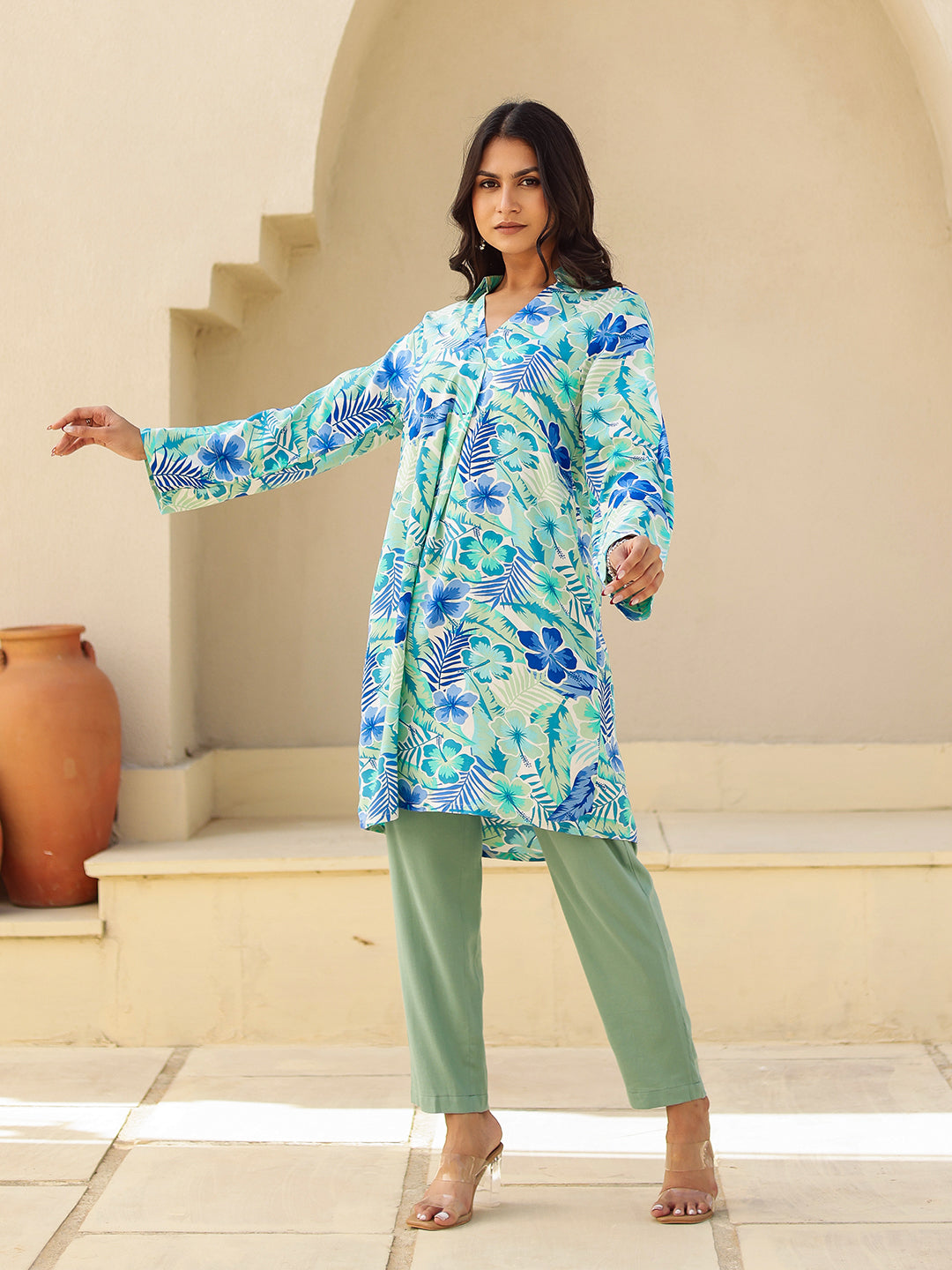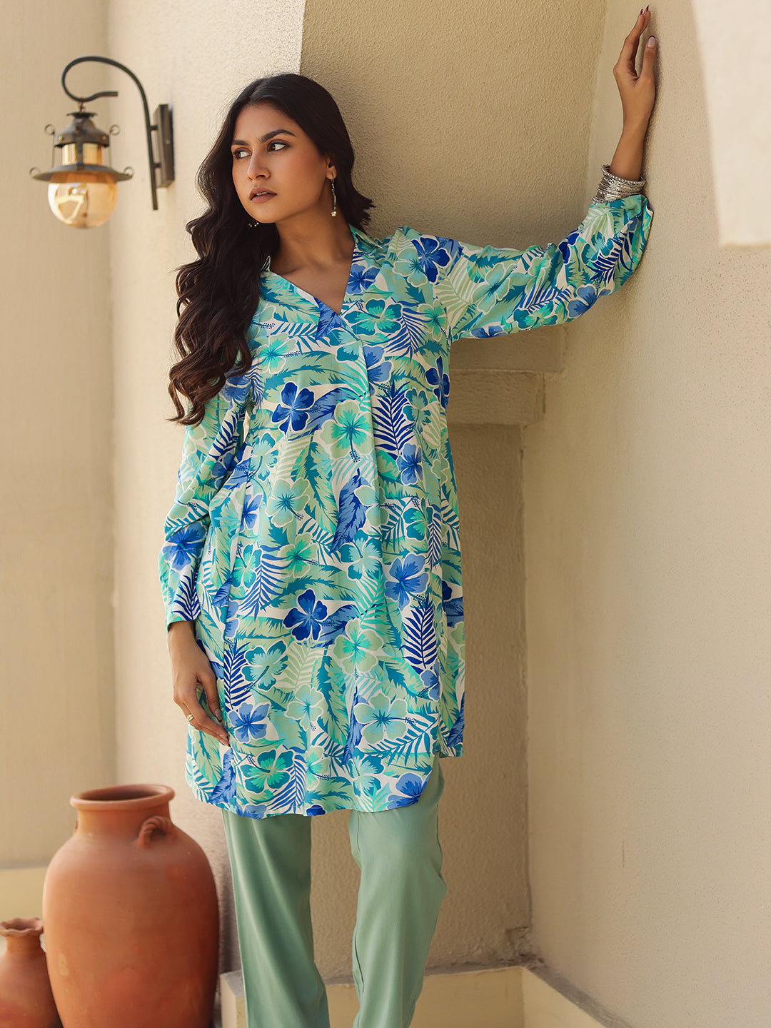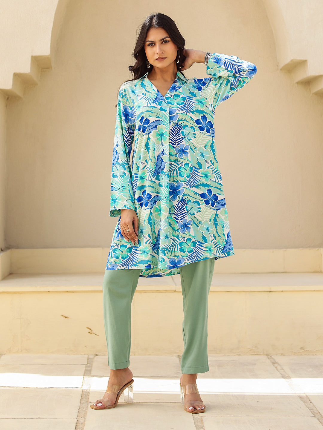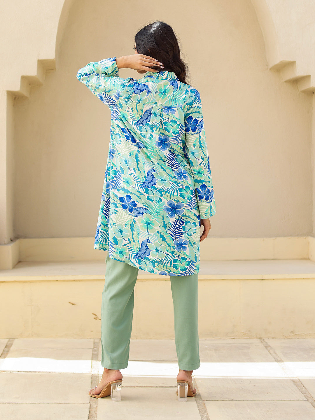 Shop The Blue & Green Tropical Print Viscose Kurta. Features A Fluid Drape, V-Neck, And Summer-Ready Floral Print. Perfect For Casual Vacation Wear.