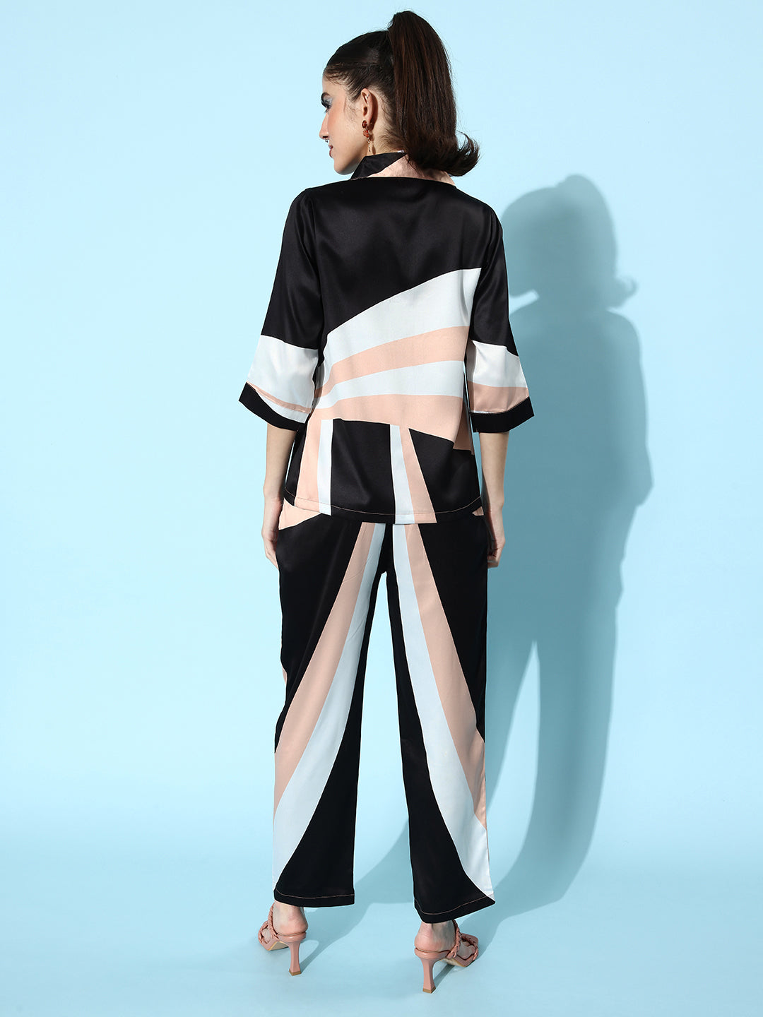 Women's Black & Beige Satin Shirt And Trousers Co-Ord Set - StyleStone