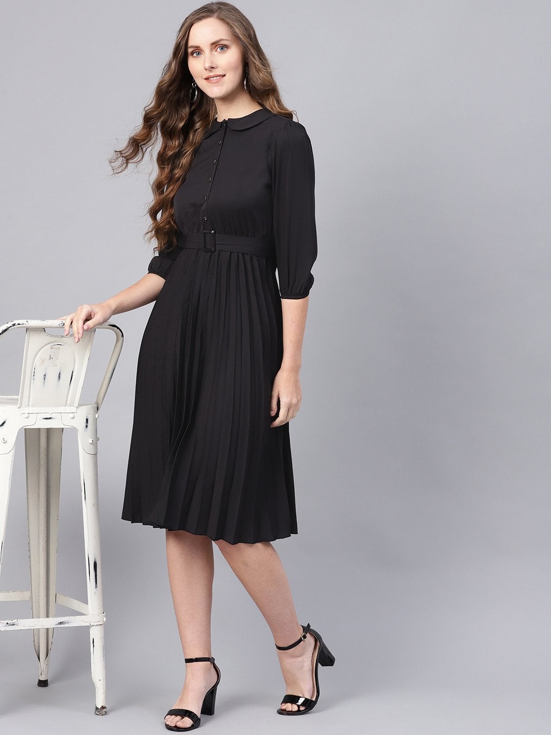 Black Peterpan Belted Pleated Midi Dress, in Crepe fabric, Polyester Lining, Below Knee, Fit And Flare, Button Closure, Flared Hemline and features Pleated Skirt with DTM Buckle Belt On waist