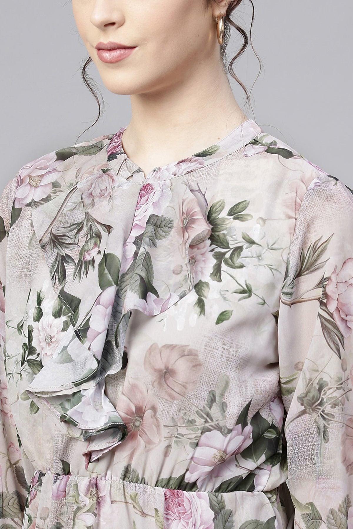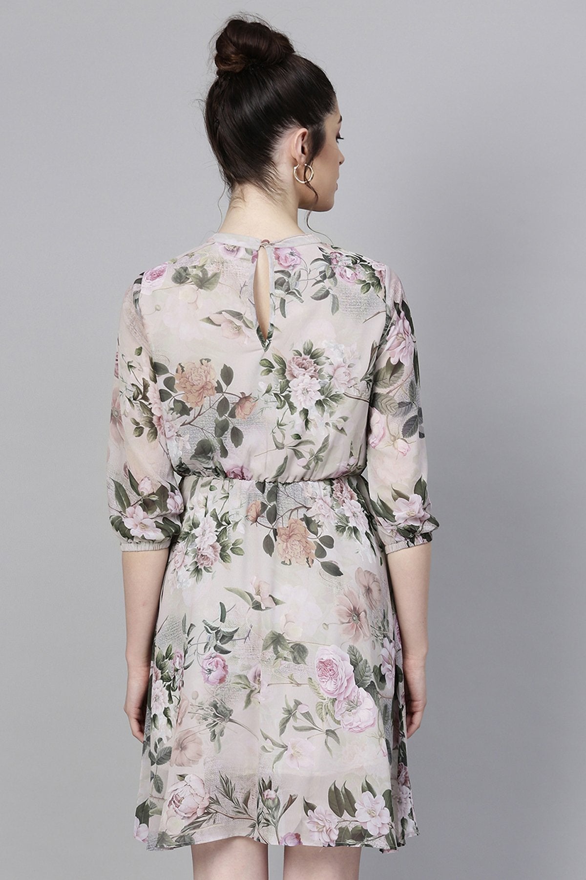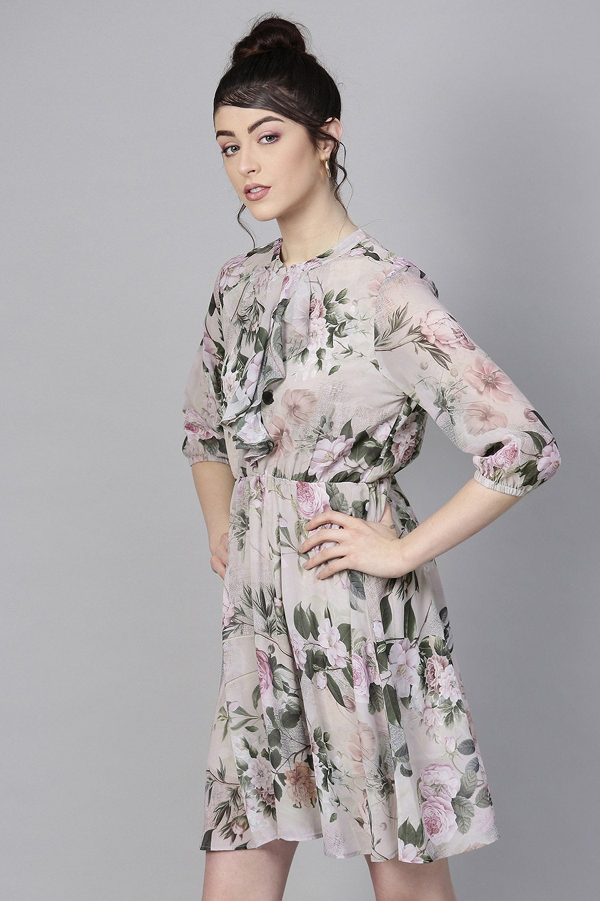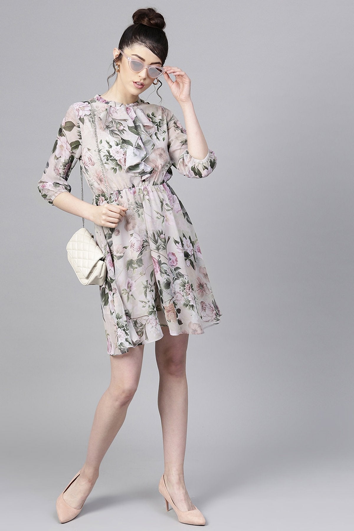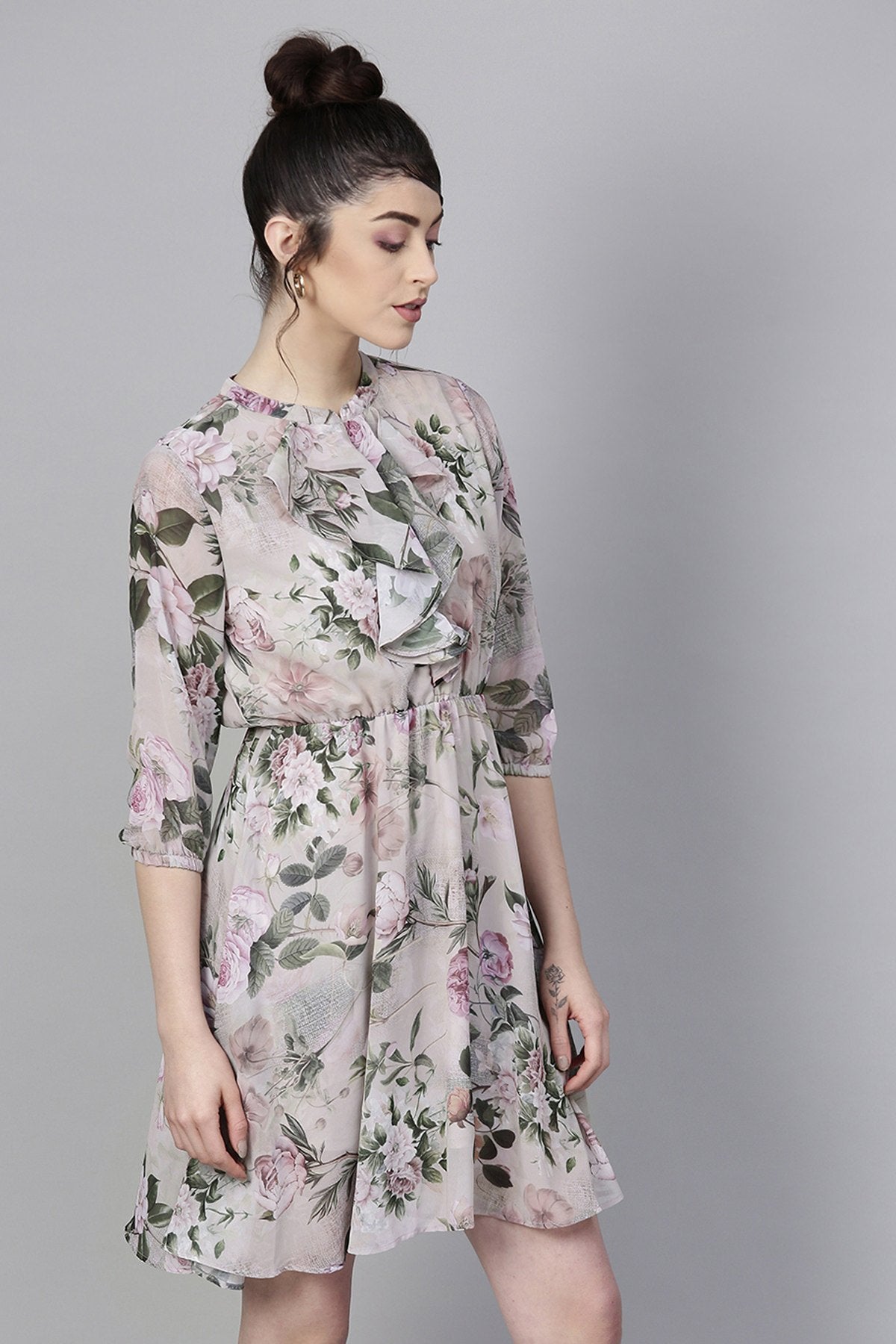 Pista Green Floral Skater Dress, In Georgette Fabric, Polyester, Knee Length, Fit & Flare, Button Closure, Straight Hemline And Features Cascading Frill At Front