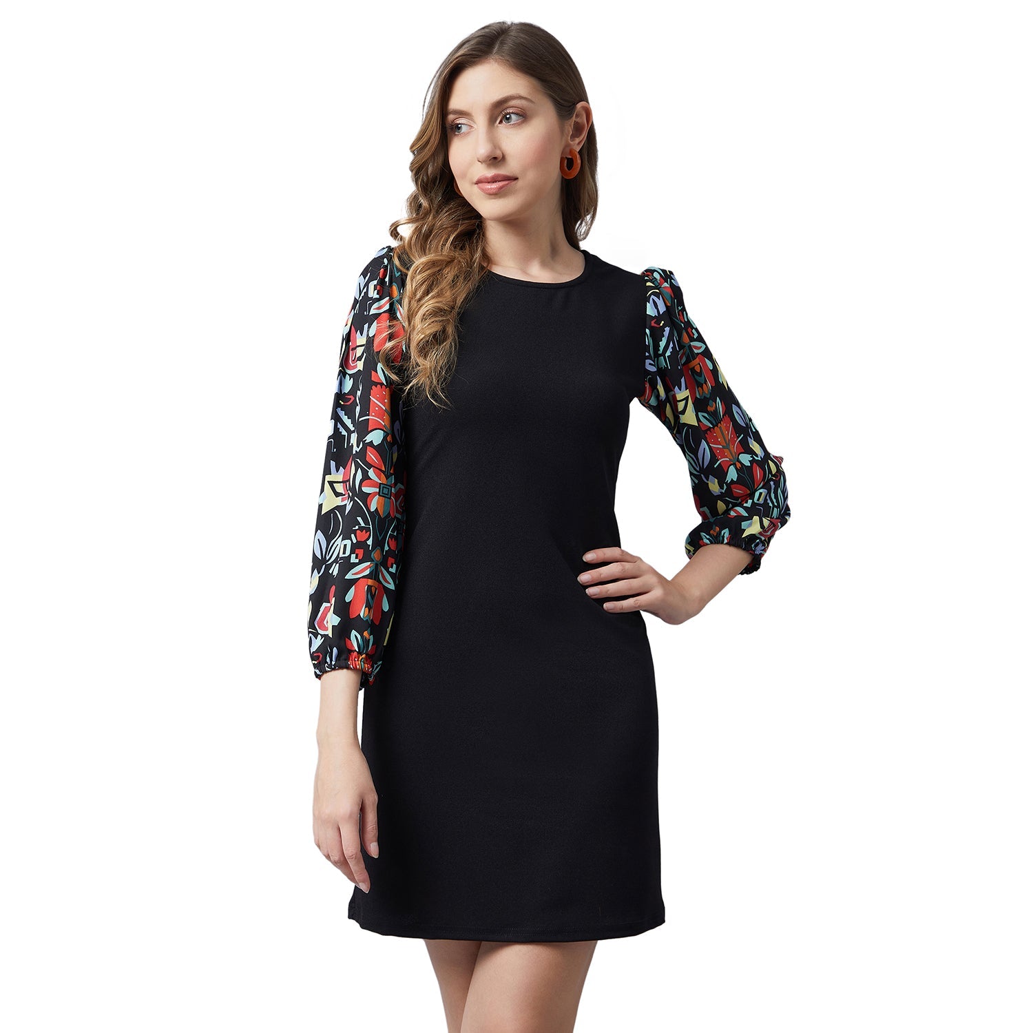 Women's Black Dress with Printed Balloon Sleeves - StyleStone