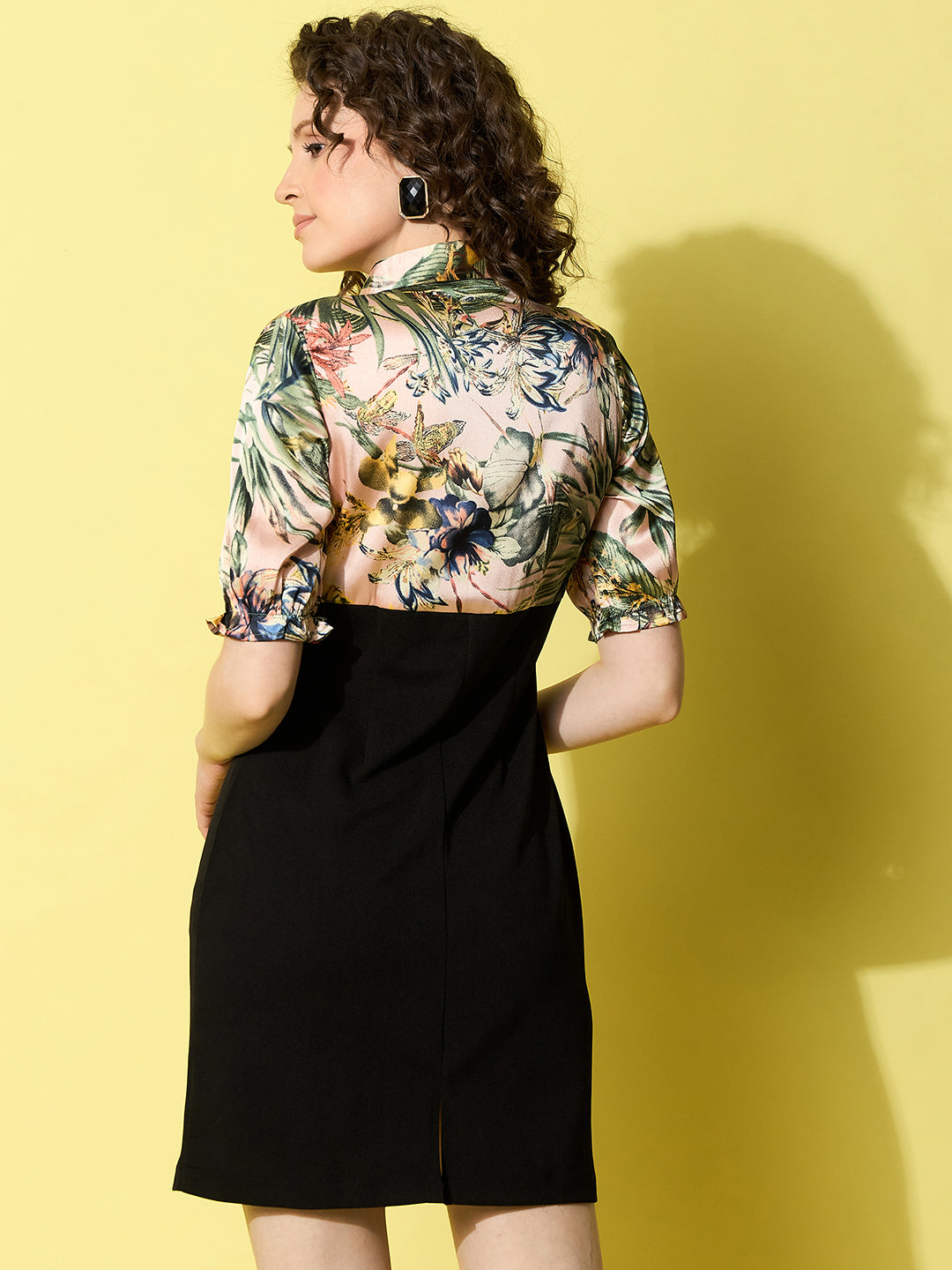Women's Peach & Black Satin & Polyester Lycra Floral Print Dress - Stylestone