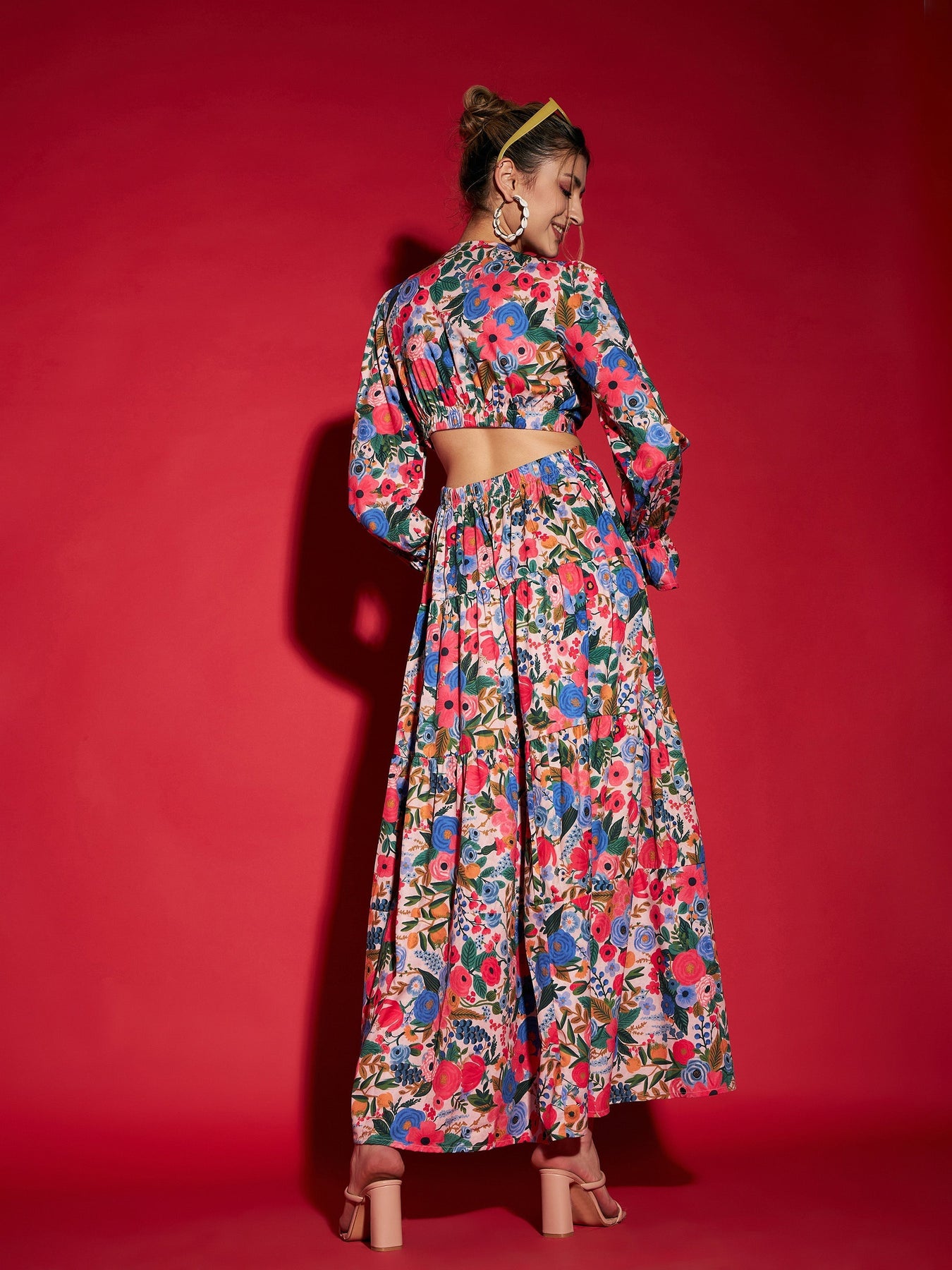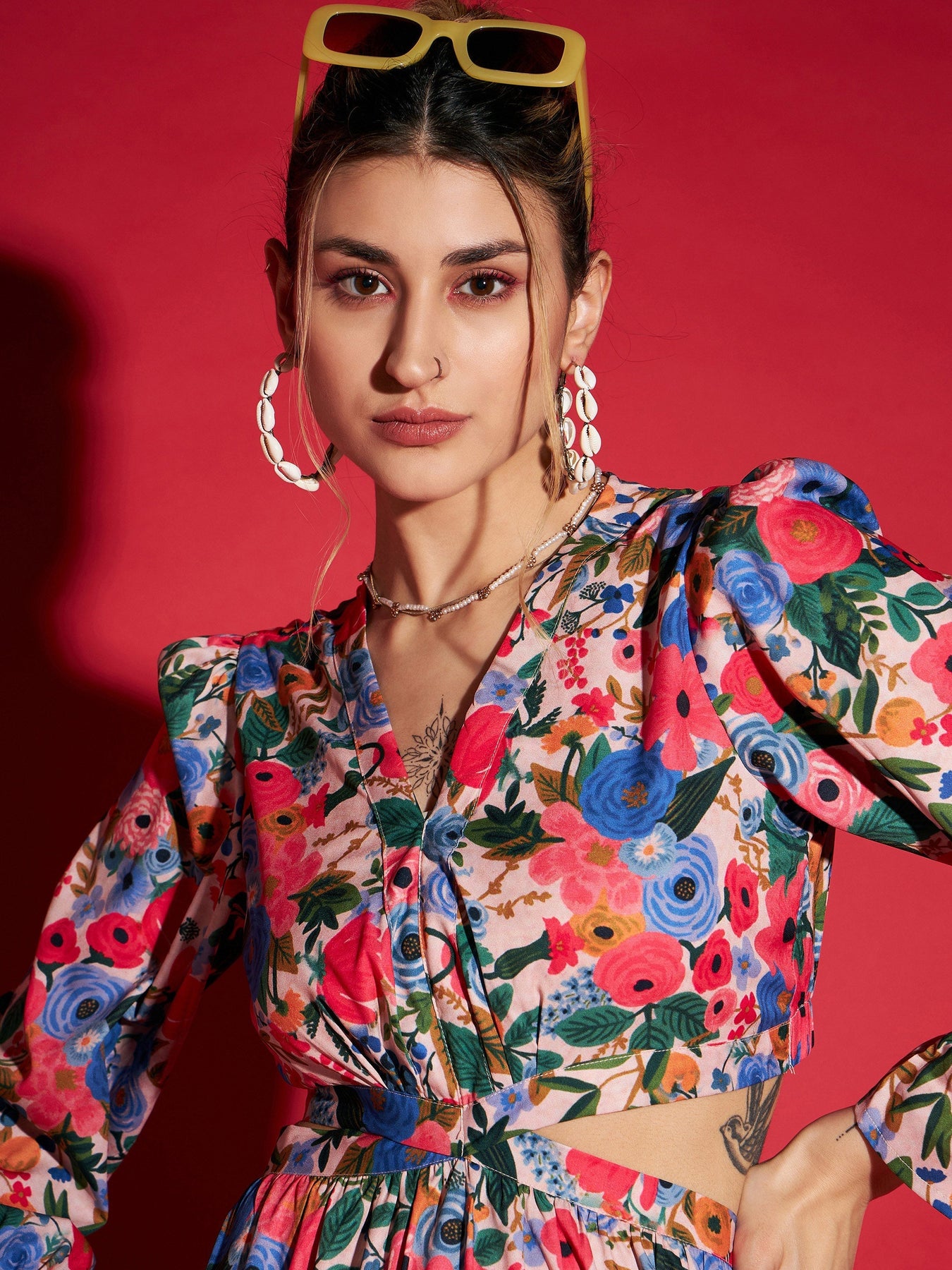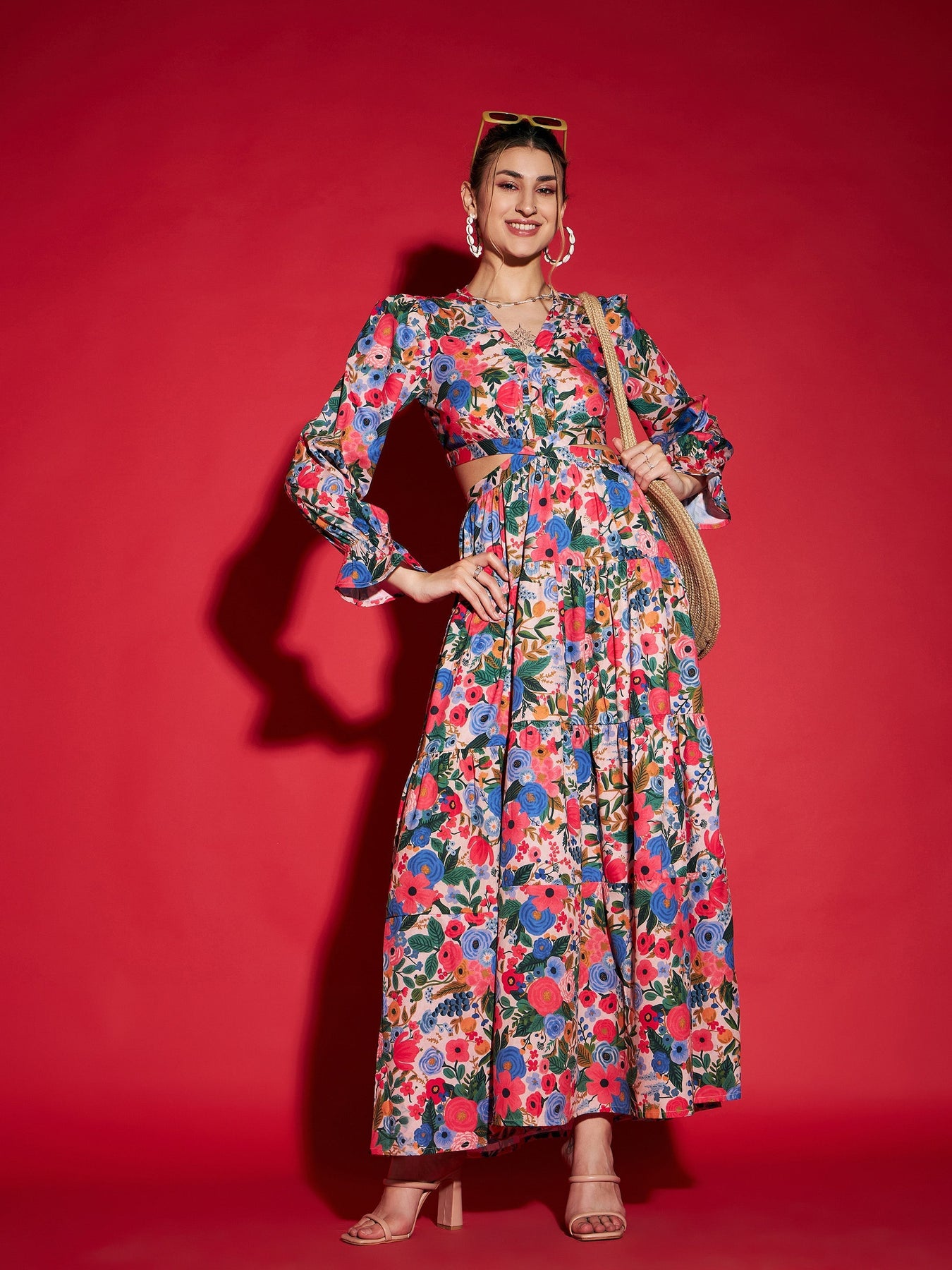 Multi Floral Waist Cut-Out Maxi Dress, in Poly Crepe fabric, Unlined, Ankle Length , Fit & Flare, No Closure, Flared Hemline and features Cut-Out Detail