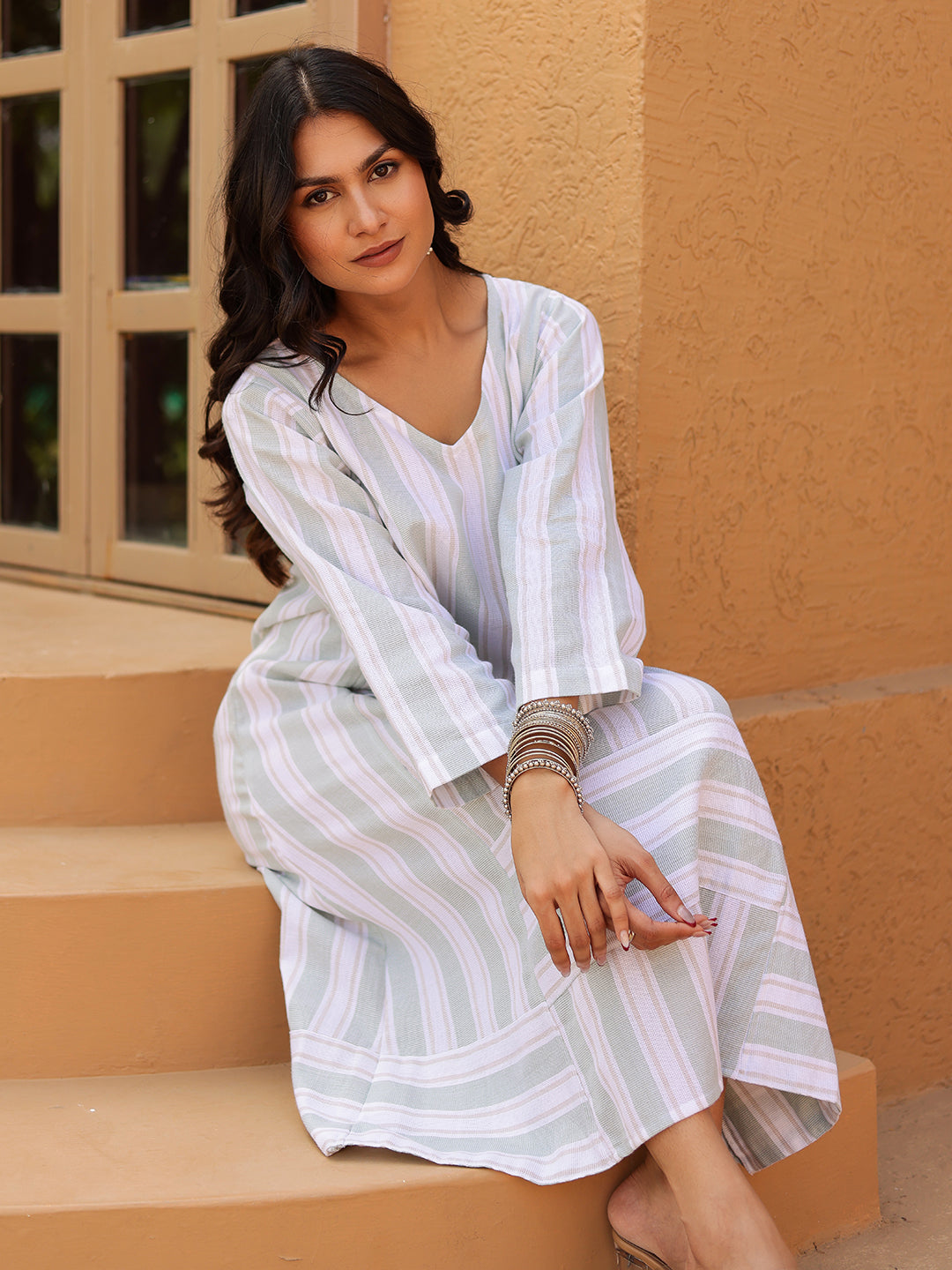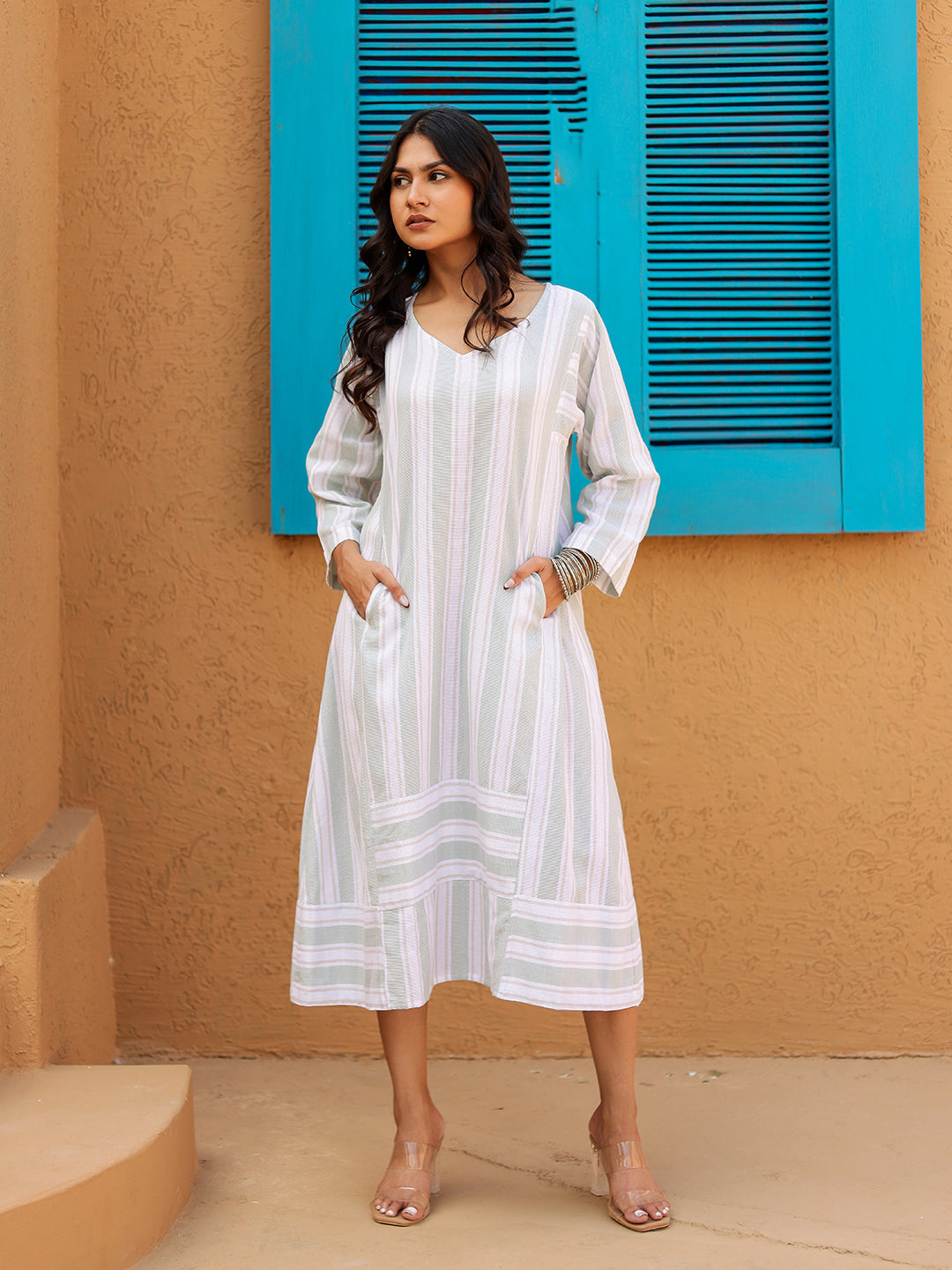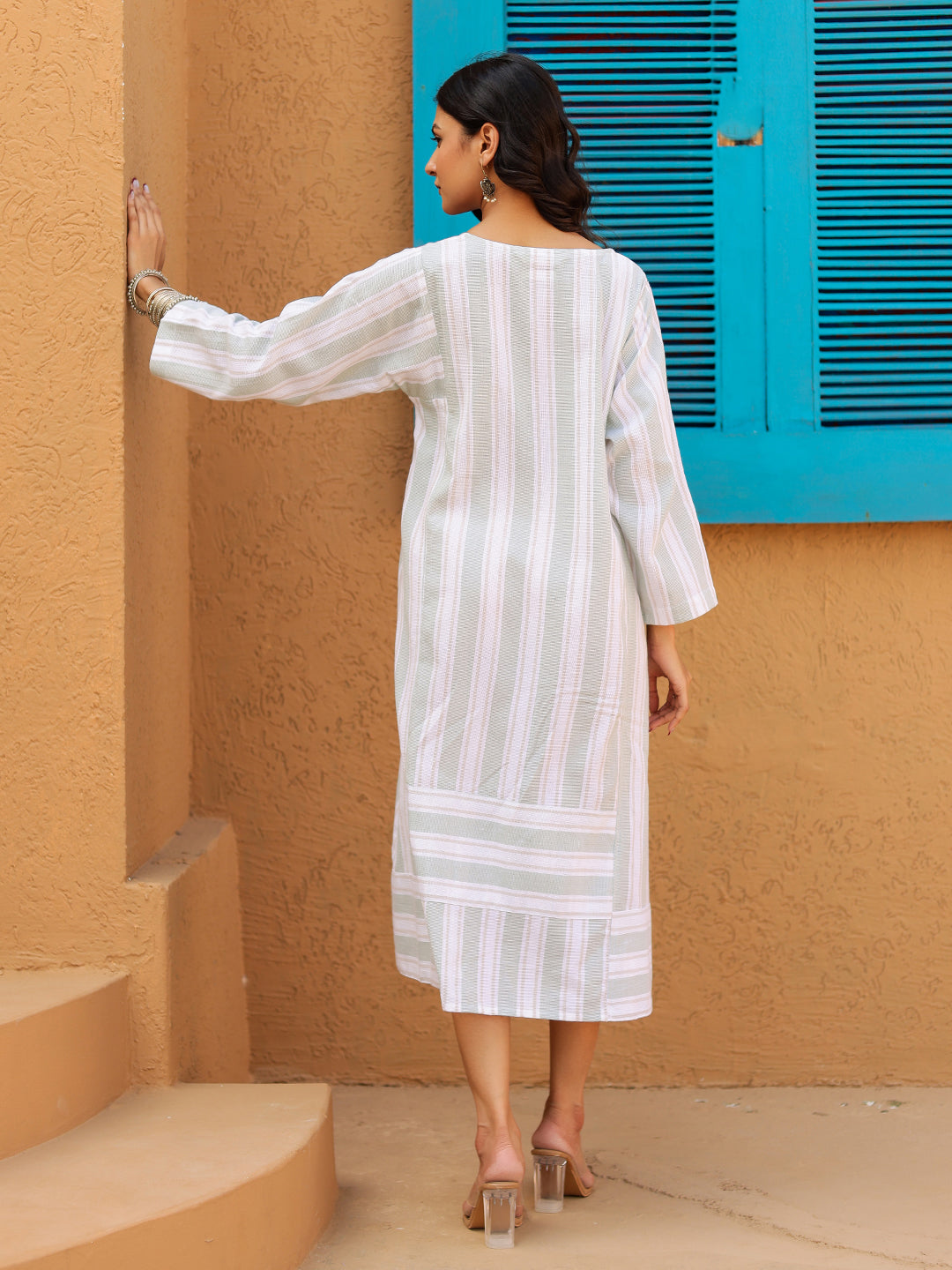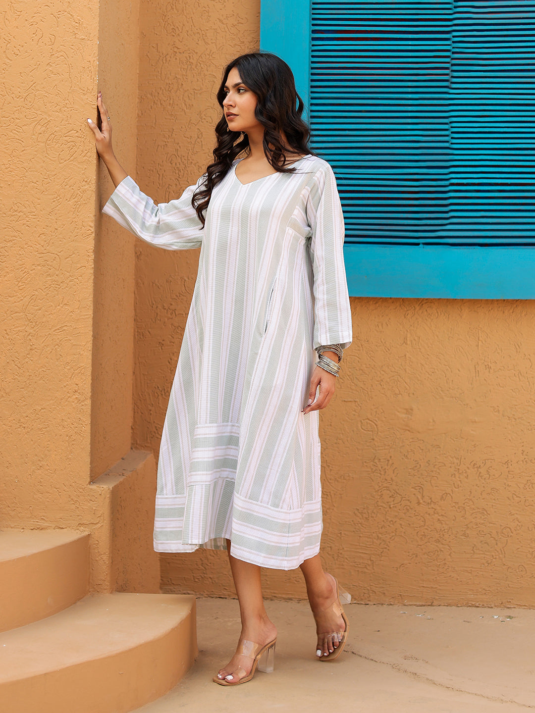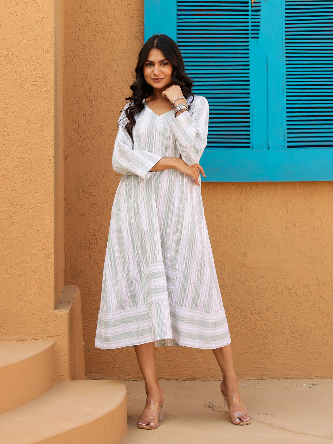 Shop The White & Green Striped Cotton Midi Dress. Features A Comfortable Fit, V-Neck, Full Sleeves, And Practical Large Side Patch Pockets.