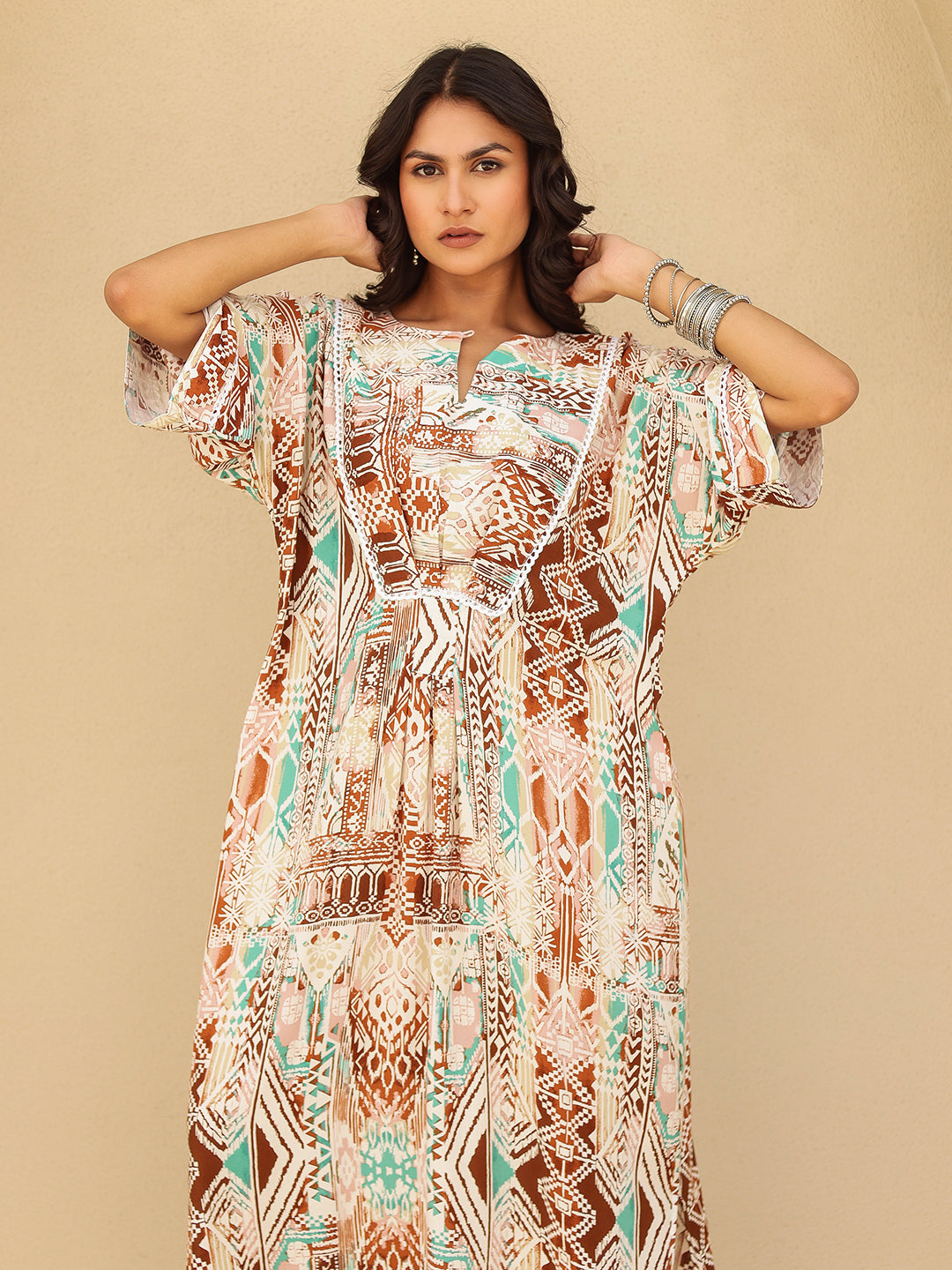 Shop The Brown & Beige Geometric Viscose Maxi Dress. Features A Striking Print, V-Neck, And A Comfortable, Fluid Drape. Perfect For Resort And Daywear.