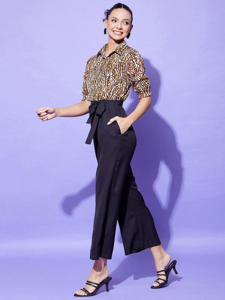 Animal Print Jumpsuit Length :Ankle Length Shape :Jumpsuit Fabric :Polyester Color :Orange & Black Work :Animal Print Fabric Composition :Polyester Neck Line :Shirt Collar Wash Care :Machine Wash Weight :0.35