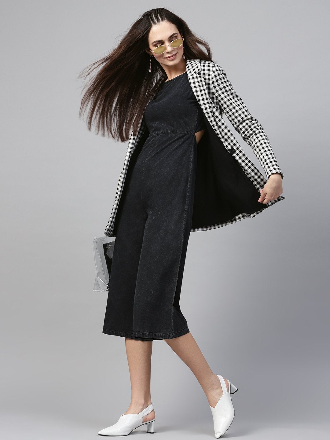 Back Denim Wrap Culottes Jumpsuit, in Tencel fabric, Unlined, Crop length, Comfort Fit, Zipper Closure, Straight Hemline and features Wrap Back Detail with Snap Buttons