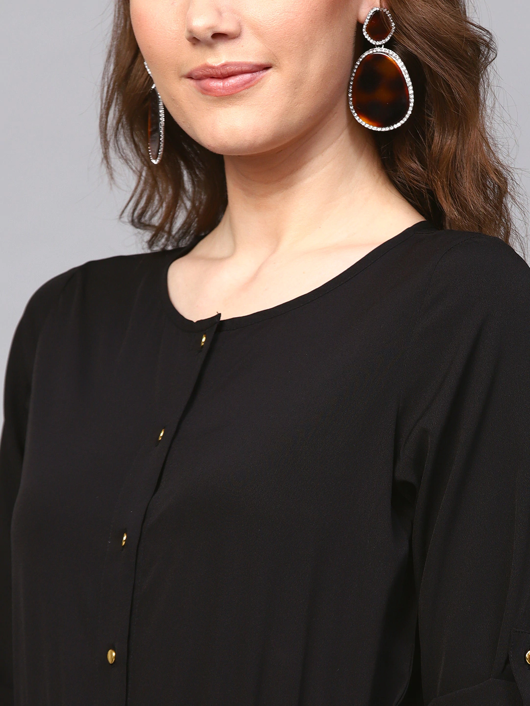 Black Tie Belt Jumpsuit with a Round, in Poly Crepe Fabric, Unlined, Quarter Sleeves, Full Length, Comfort Fit, Button closure at front and Straight hemline