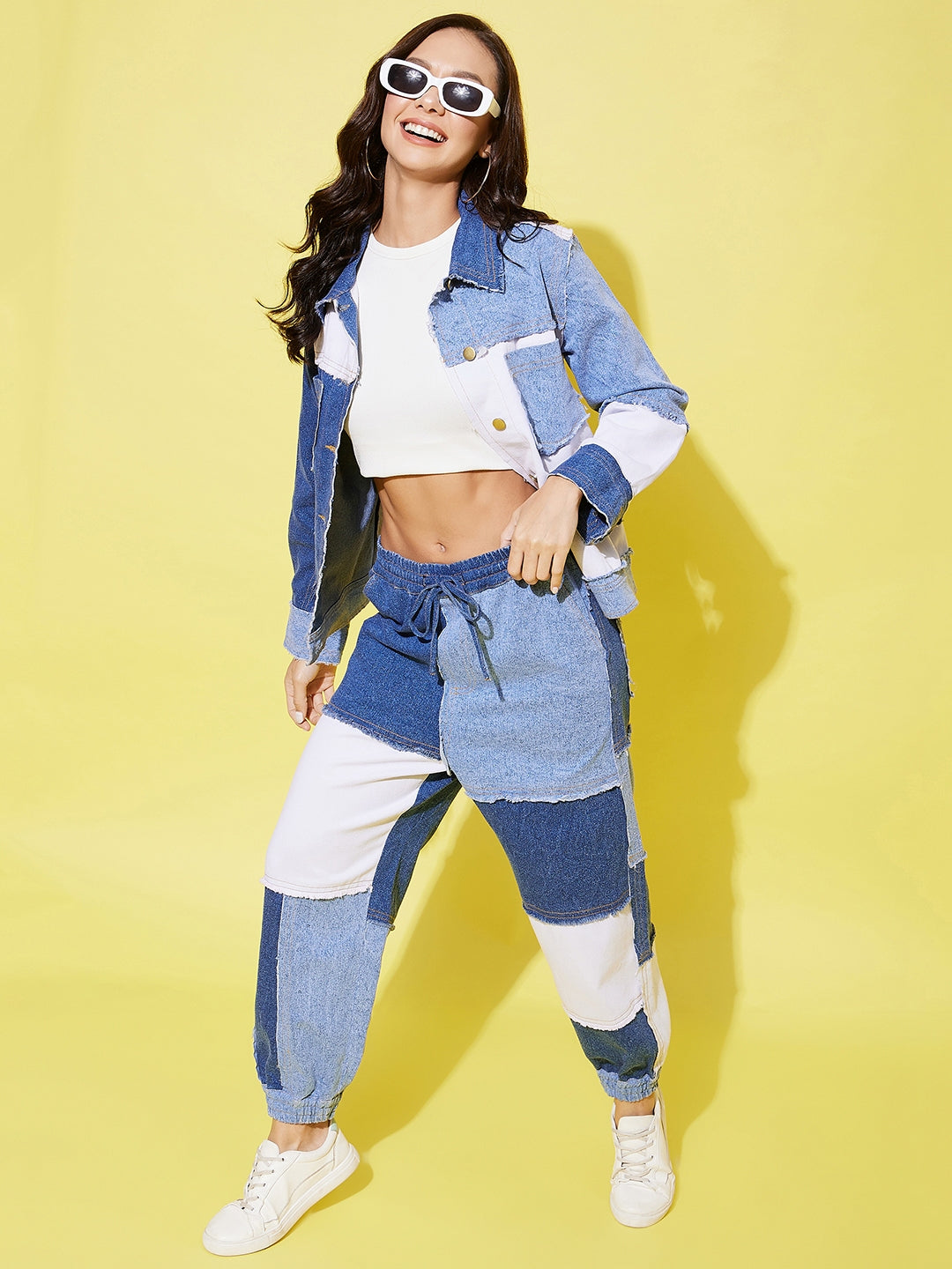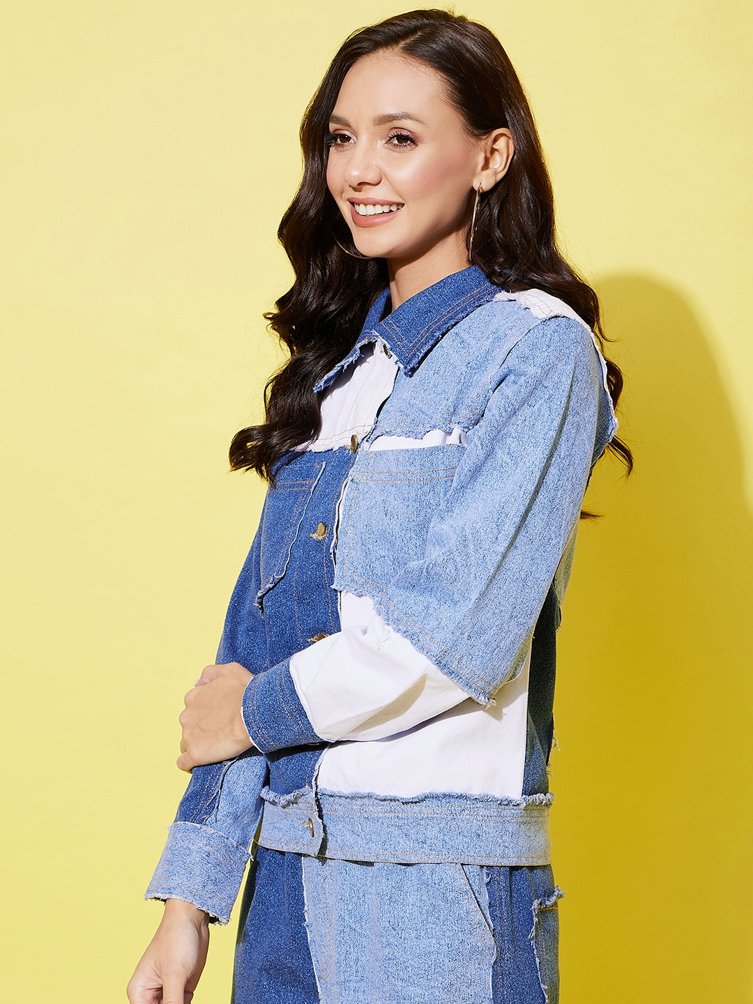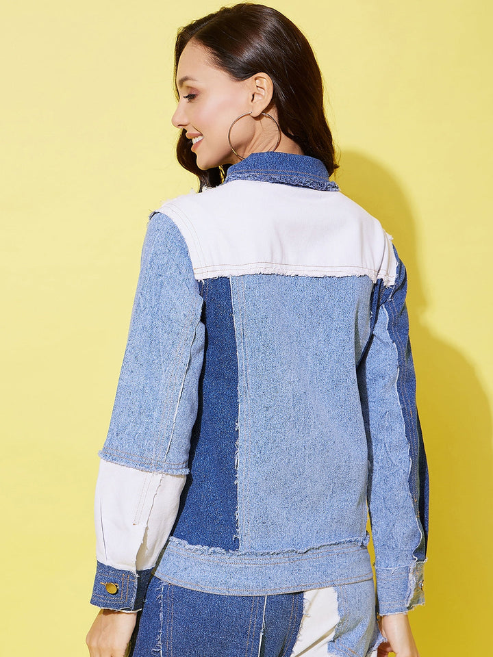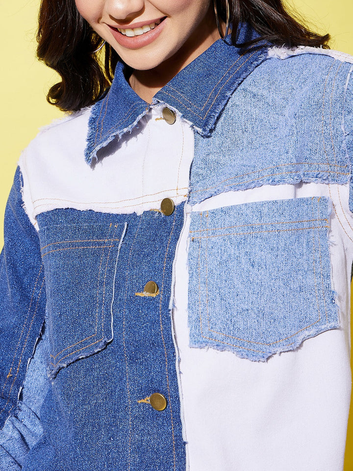Blue Denim Patchwork Jacket Length :Waist Length Shape :Jacket Fabric :Denim Color :Blue Work :Color Block Fabric Composition :Denim Neck Line :Shirt Collar Wash Care :Machine Wash Weight :0.35