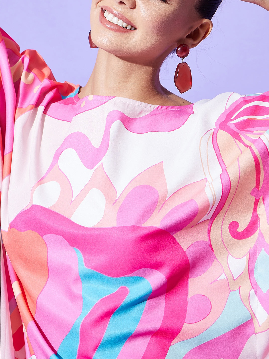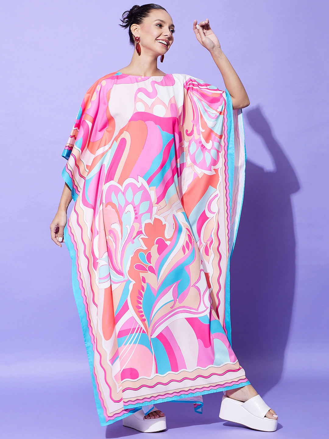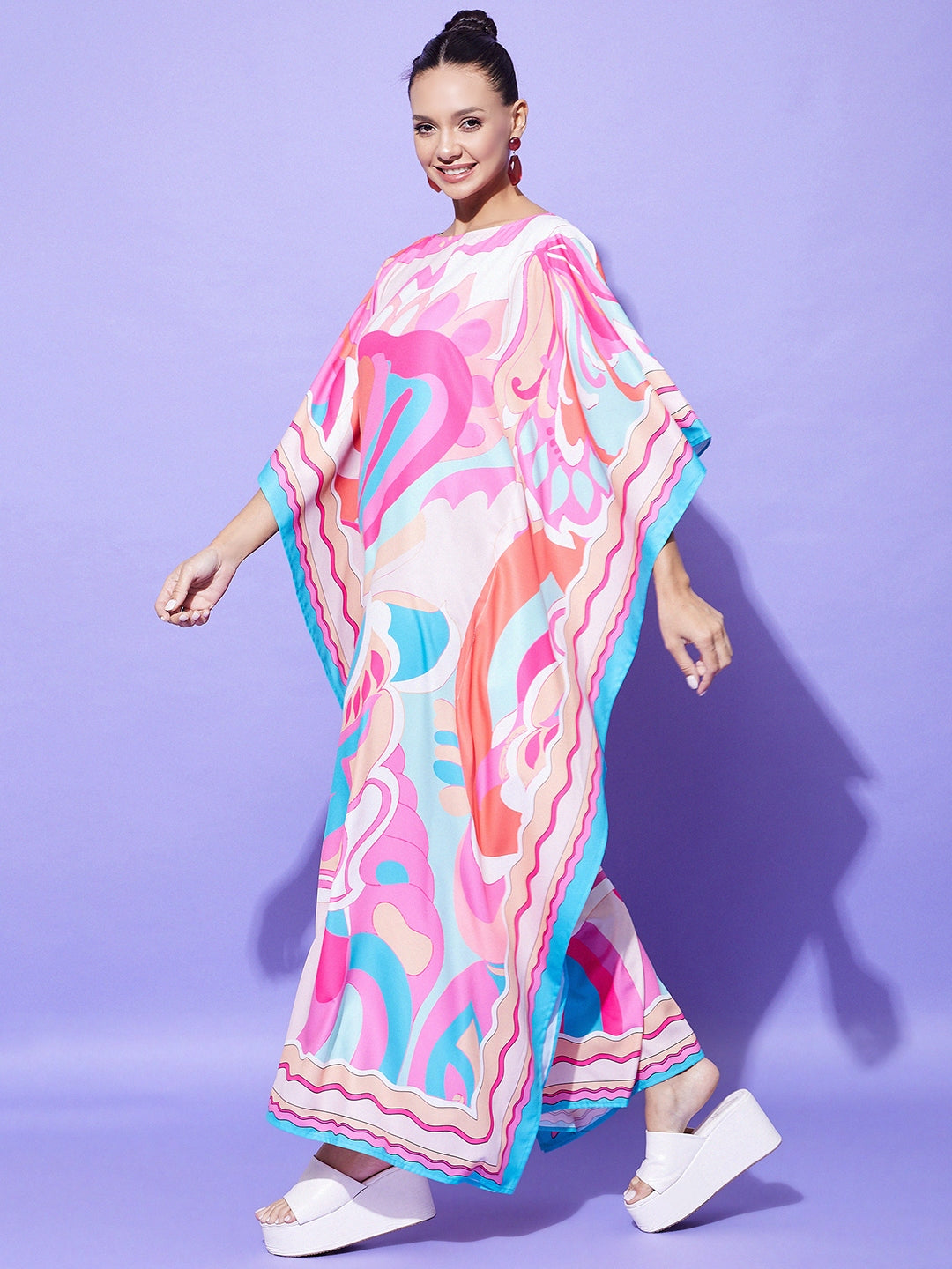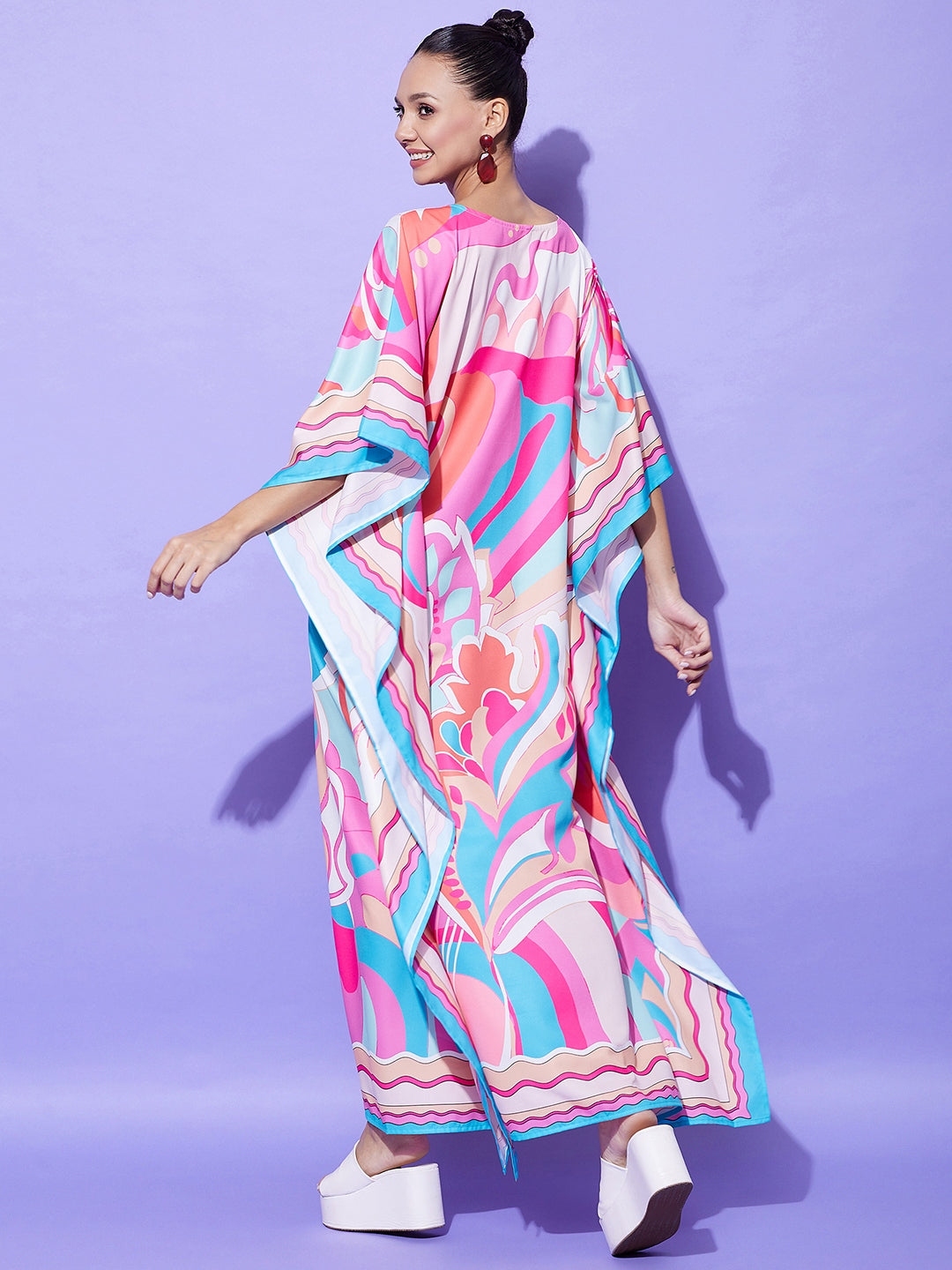 Printed Satin Kaftan Length :Maxi Length Shape :Kaftan Dress Fabric :Satin Color :Multi Work :Color Block Fabric Composition :Satin Neck Line :Round Neck Wash Care :Machine Wash Weight :0.35