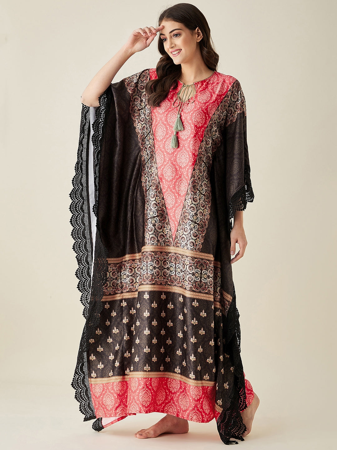 Red and Black Satin Ethnic Motif Kaftan Night Dress with enhancing Kaftan border along the edges and contrast tie up Detailing on the neck
