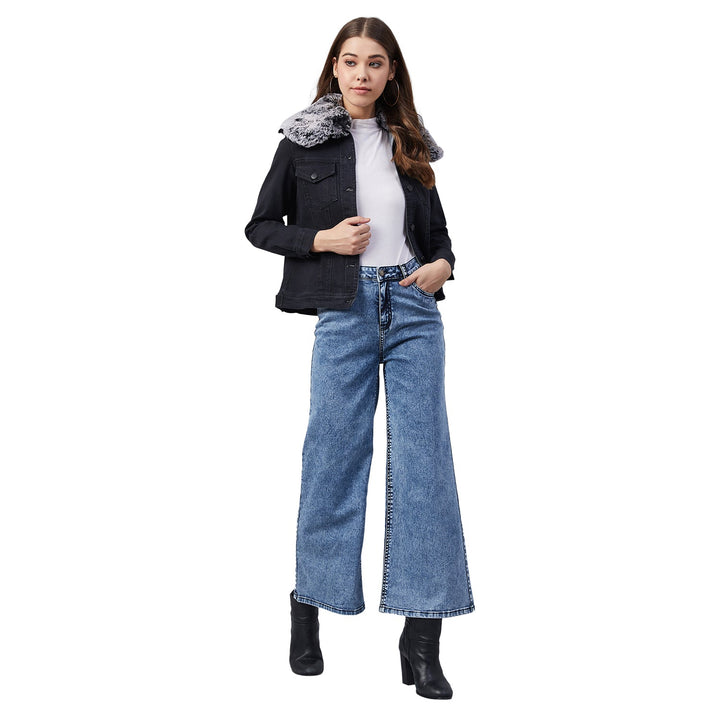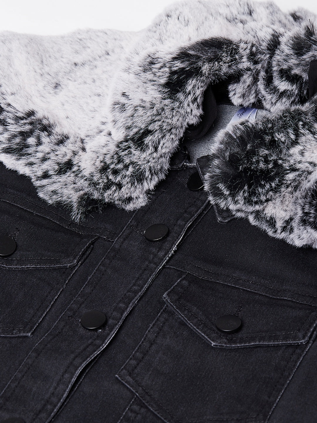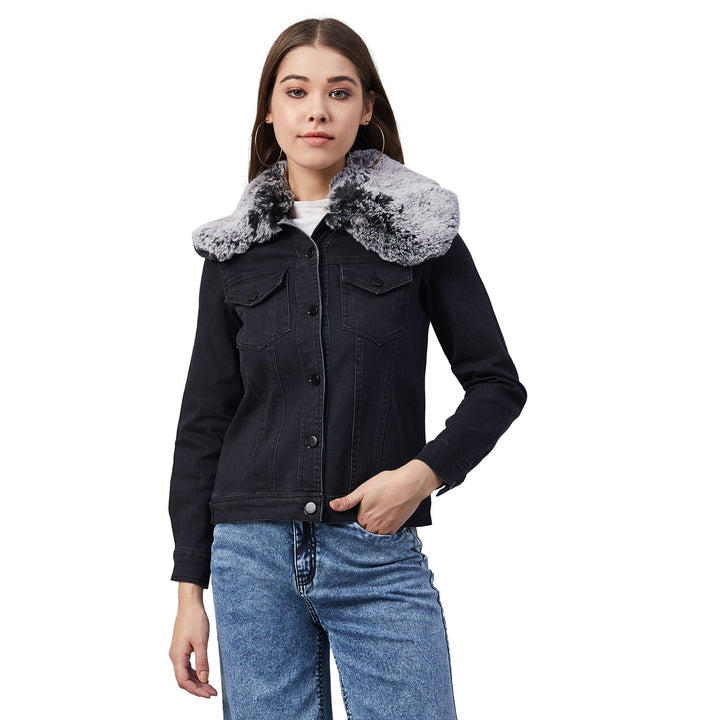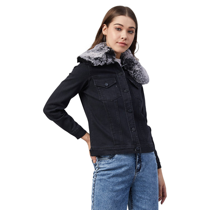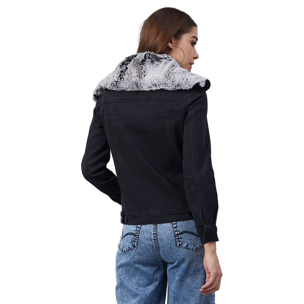 StyleStone Women's Black Denim Jacket with Detachable Grey Collar FABRIC: Denim & Faux Fur COLOUR: Black Wash Care: Machine Wash