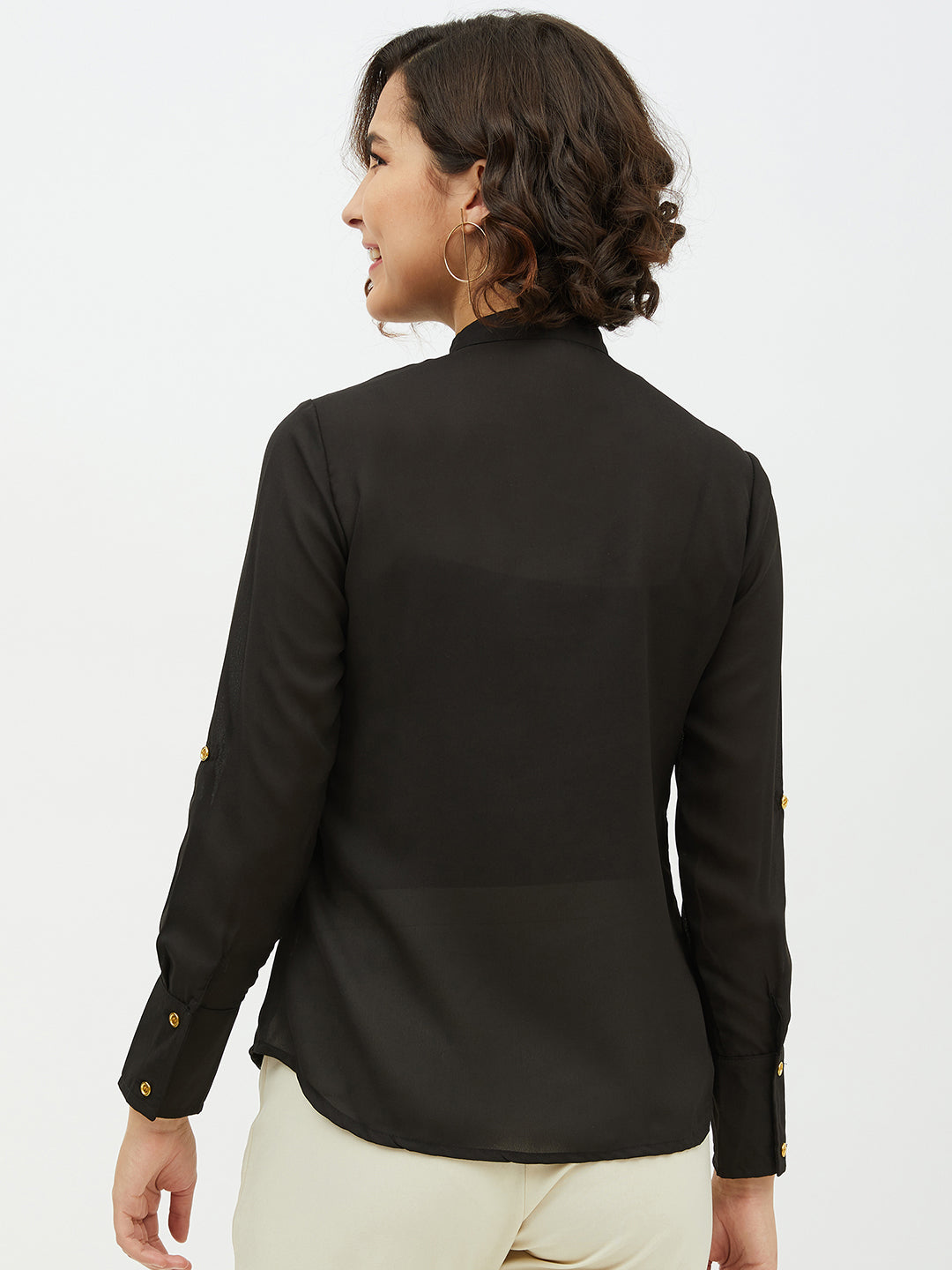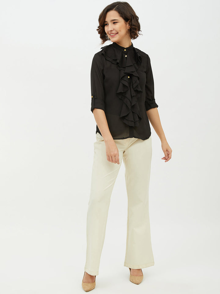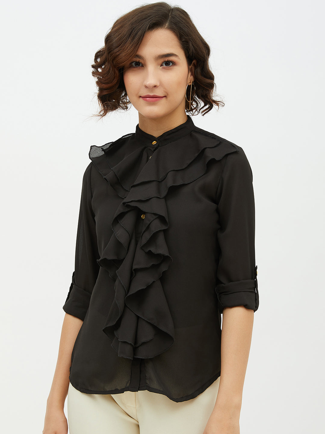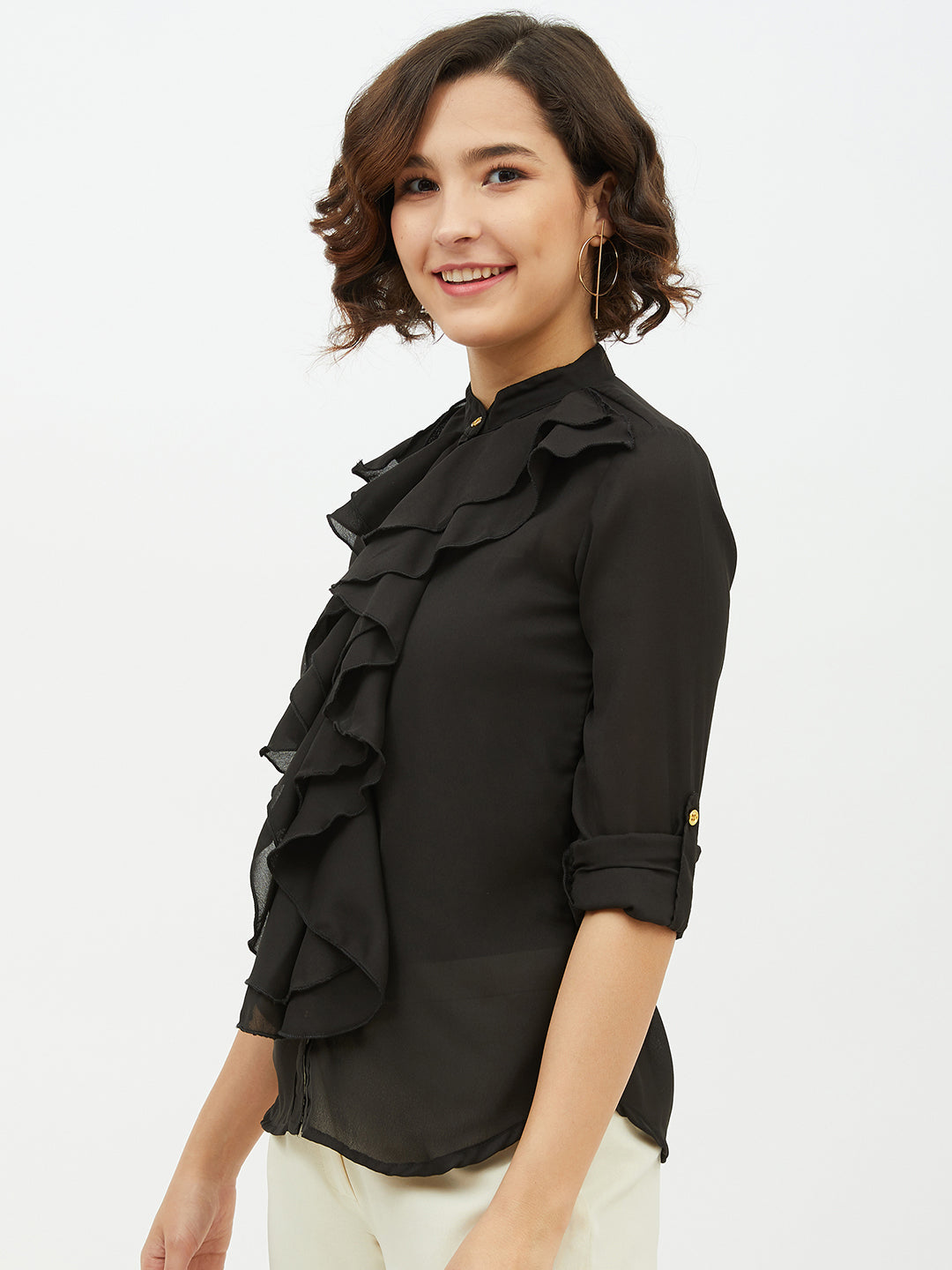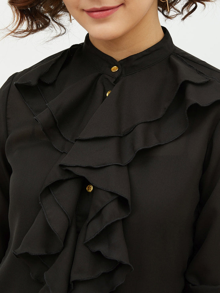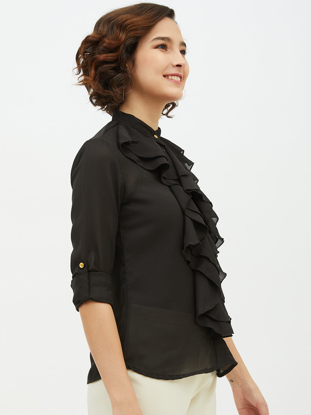 Women's Black Ruffle Polyester Moss Shirt - StyleStone
