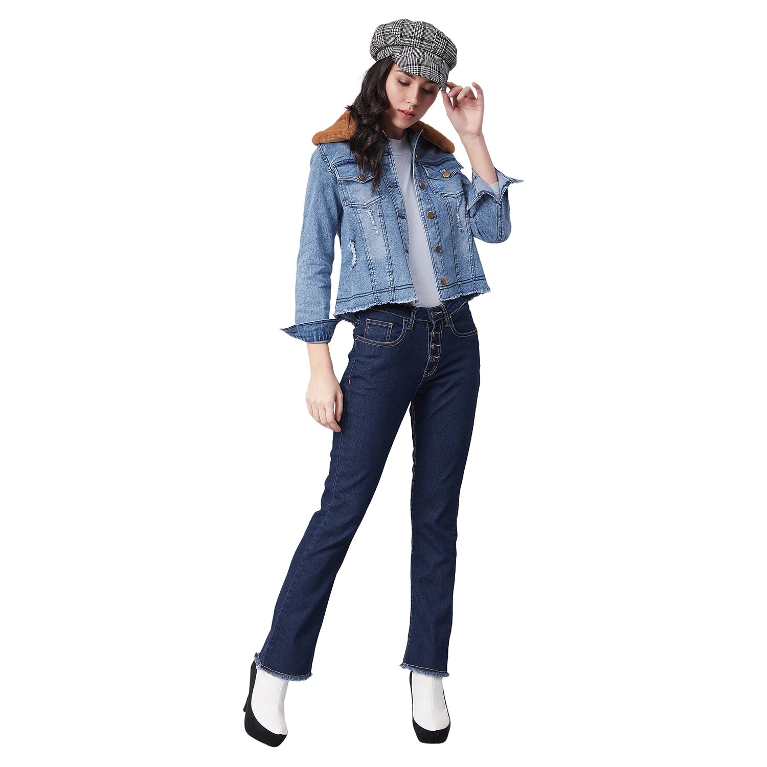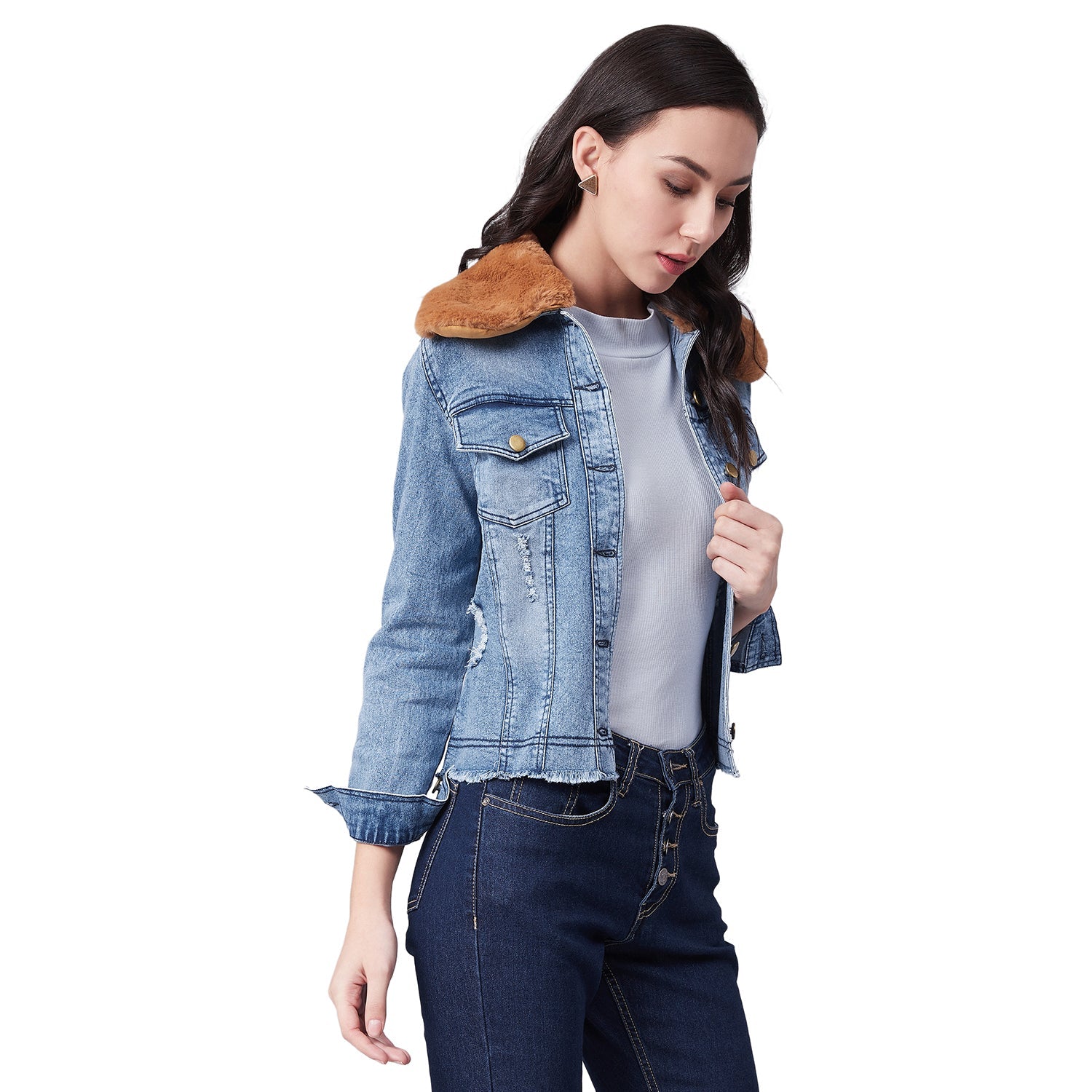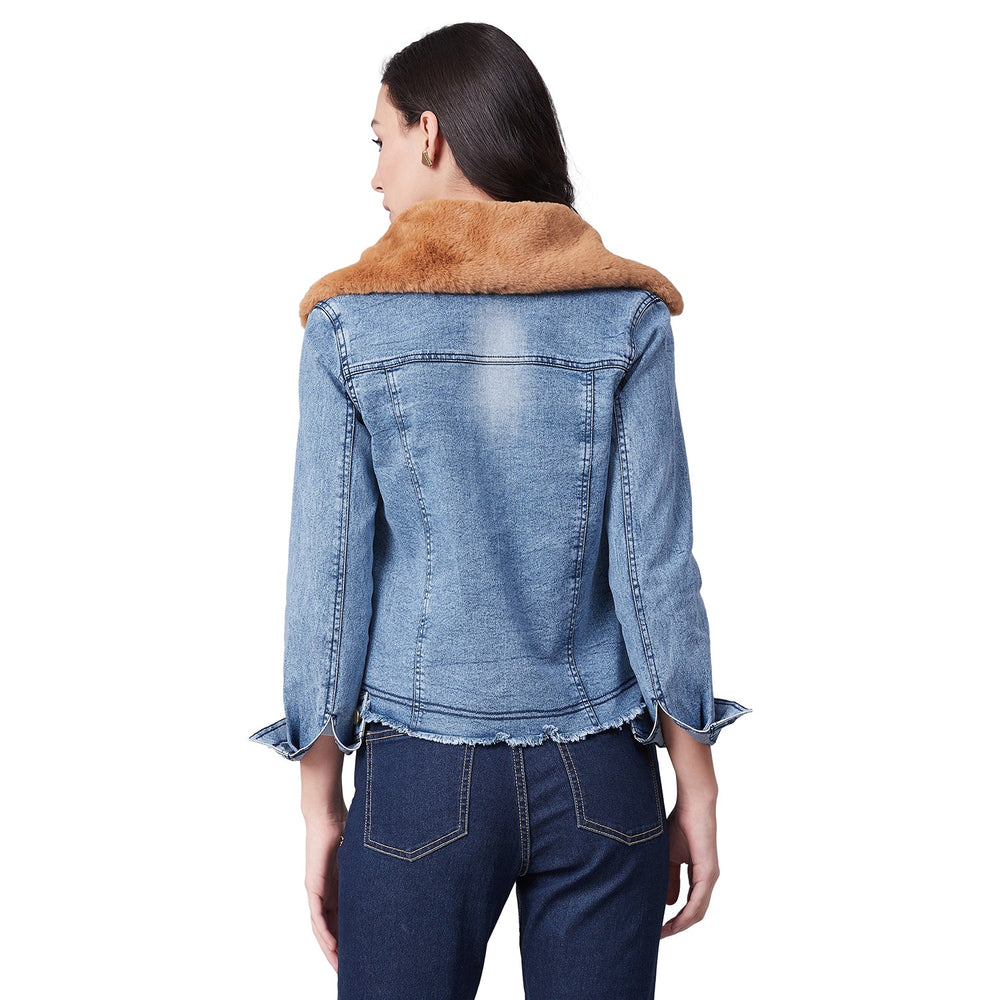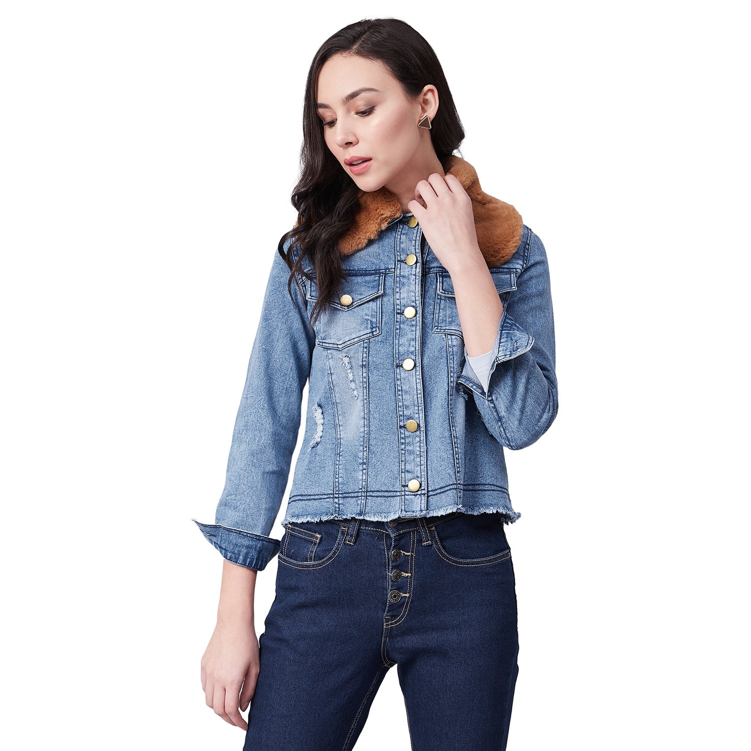 StyleStone Women's Distressed Denim Jacket with Detachable Brown Fur Collar FABRIC: Denim & Faux Fur COLOUR: Blue Wash Care: Machine Wash