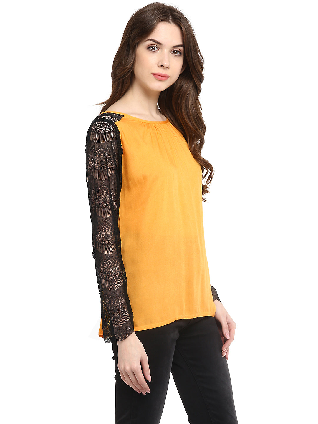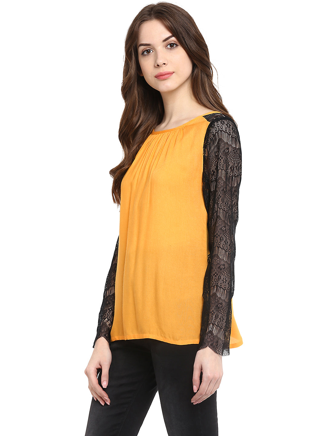 Women's Mustard Yellow Rayon Black Lace Sleeve Top FABRIC: Rayon COLOUR: Mustard Yellow Wash Care: Machine Wash
