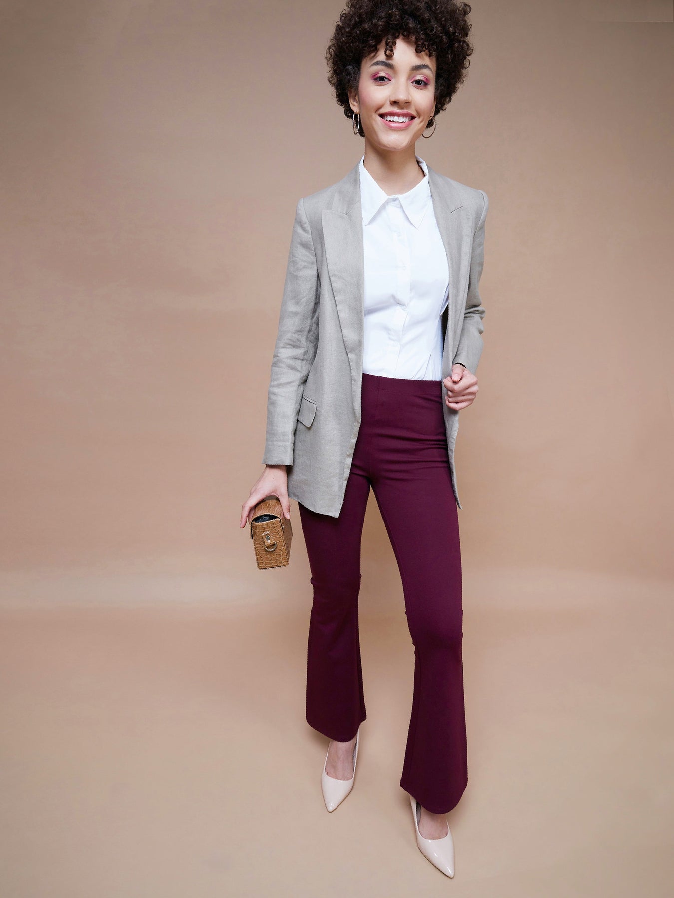 Burgundy Bell Bottom Pants, in Roma fabric, Unlined, Full Length, Slim Fit, Slip On, Straight Hemline and features Bell Bottom Pants