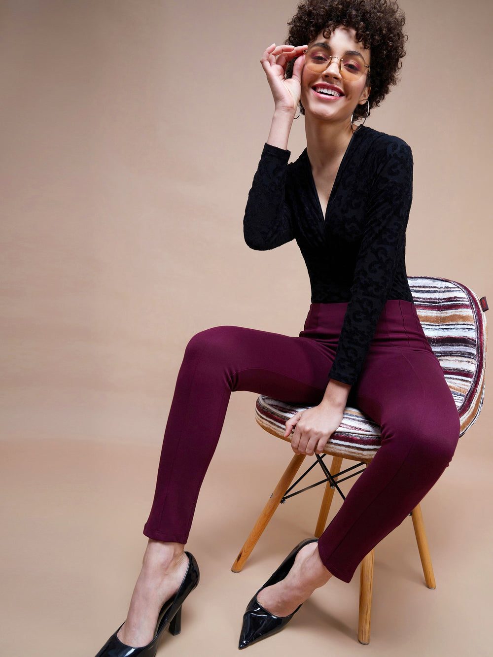 Burgundy Bottom Zipper Jeggings, in Roma fabric, Unlined, Ankle Length, Slim Fit, Slip On, Straight Hemline and features Zipper Detail At Bottom