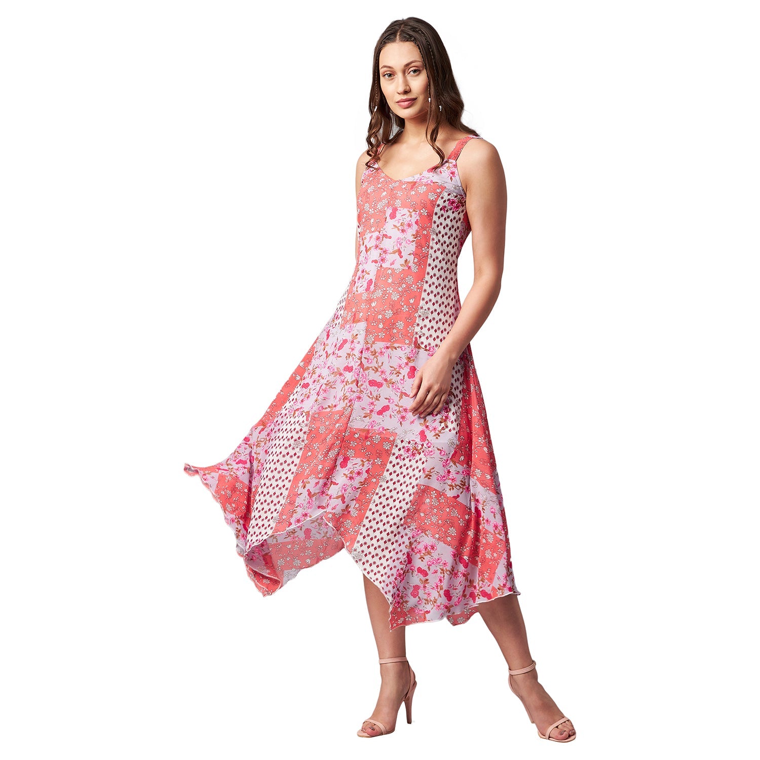 Stylestone Women'S Asymmetric Pink Tile Print Dress Color :Pink Fabric :Georgette Sleeve: Shoulder Straps Pattern: Floral Weight (In Kg) :0.4 Wash Care :Machine Wash