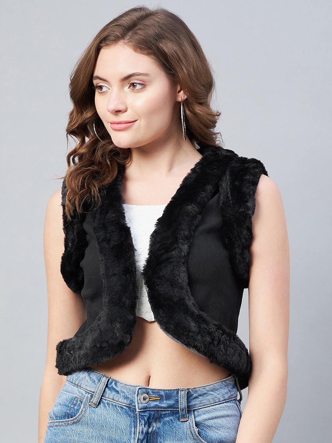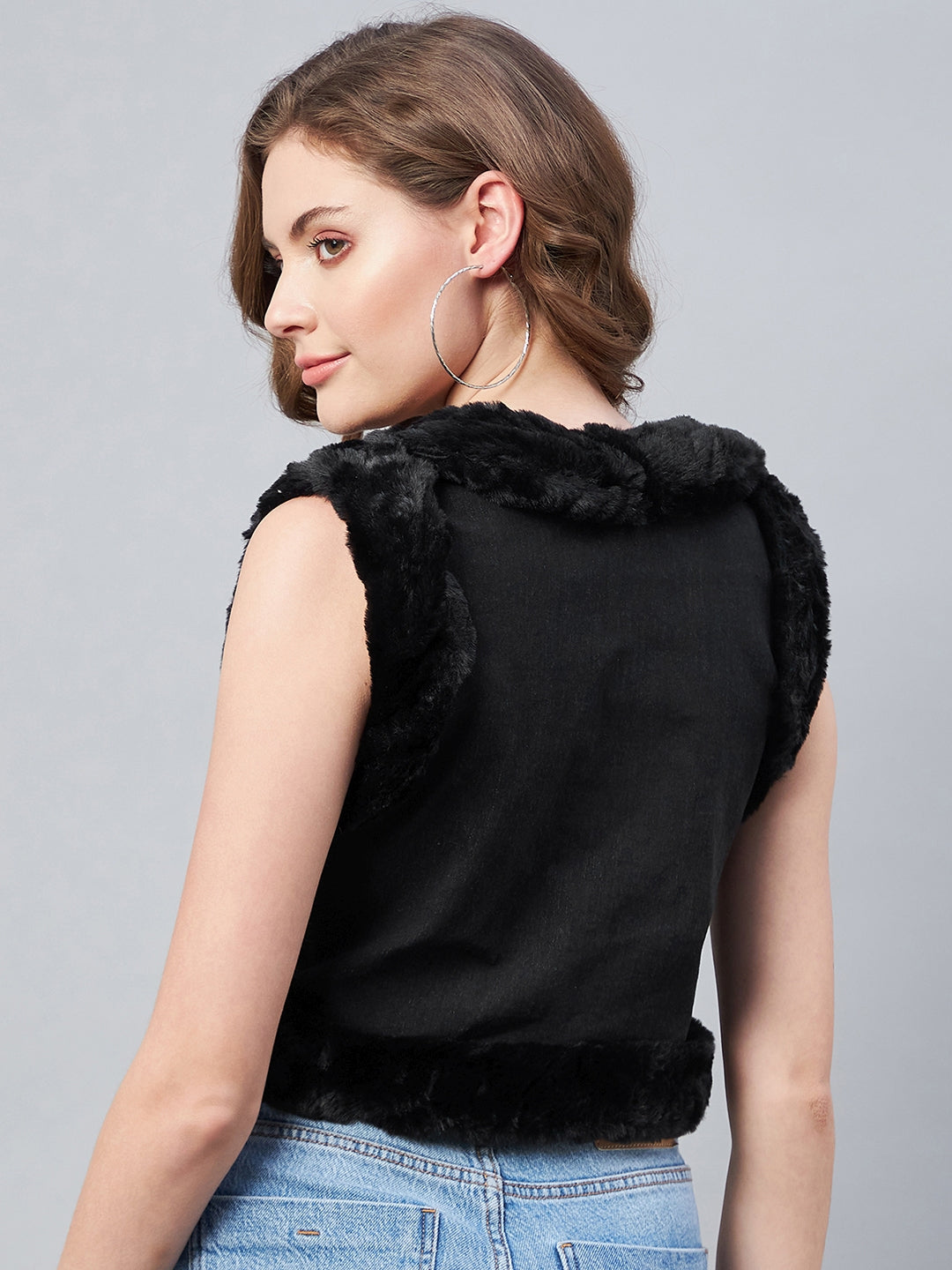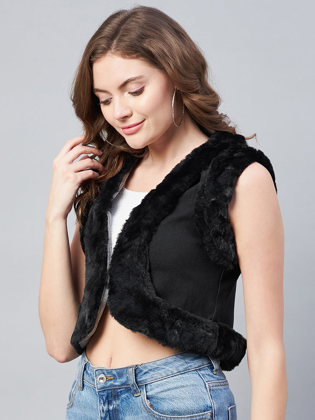 Women's Denim and Fur Trim Bolero Crop Shrug - StyleStone Color :Black Fabric :Denim & Fur Sleeve: Sleeveless Pattern: Solid Wash Care :Machine Wash