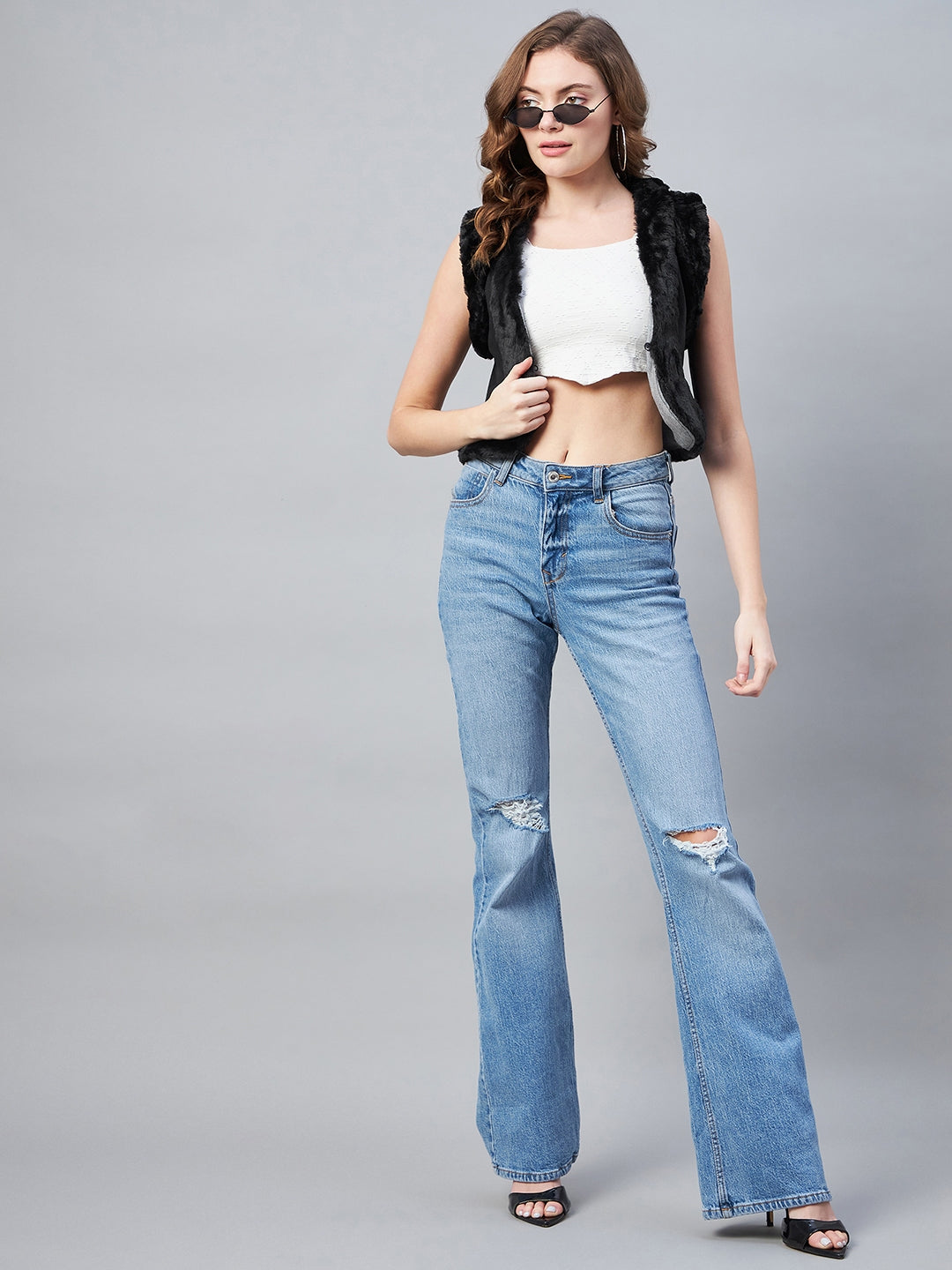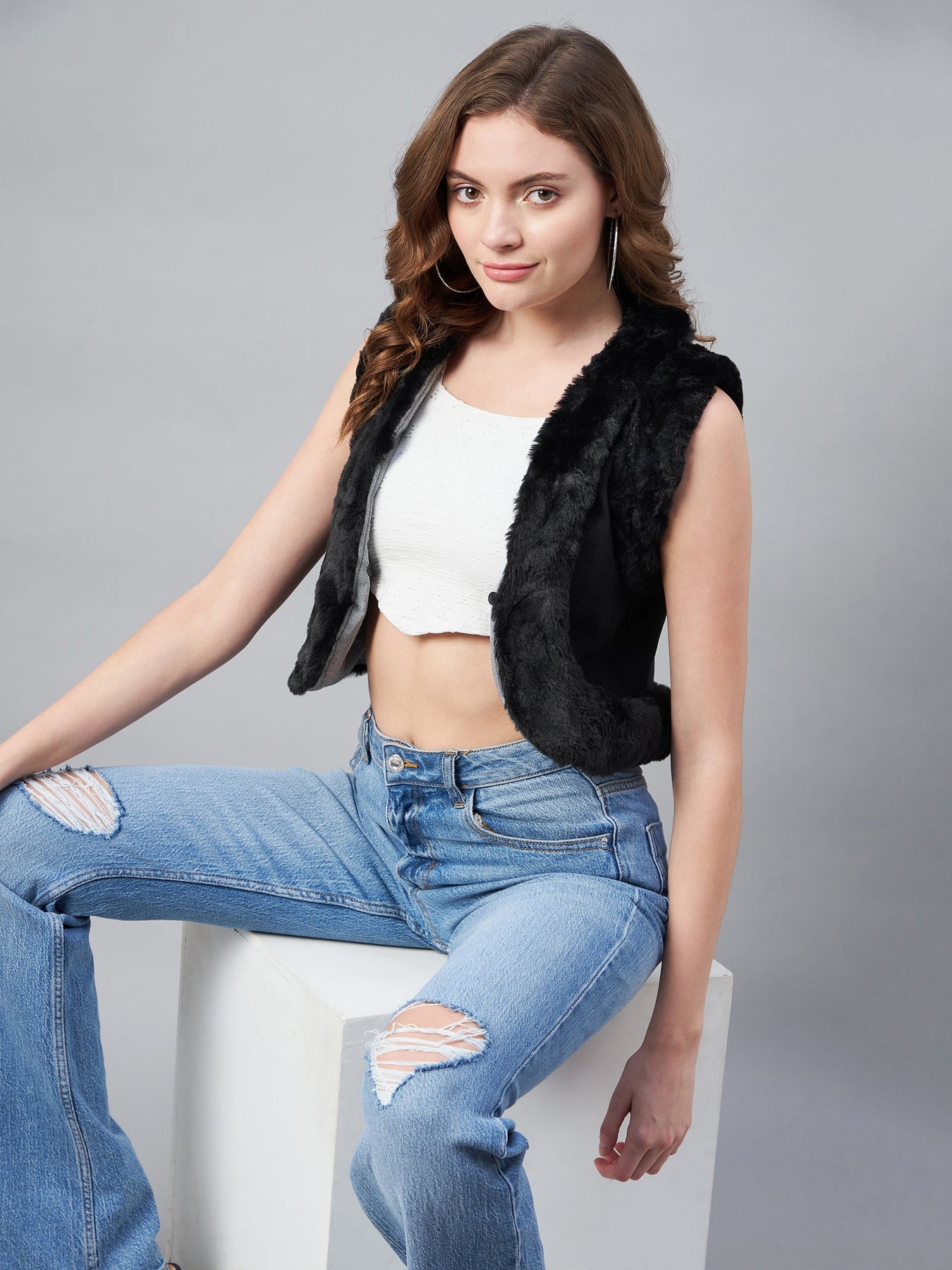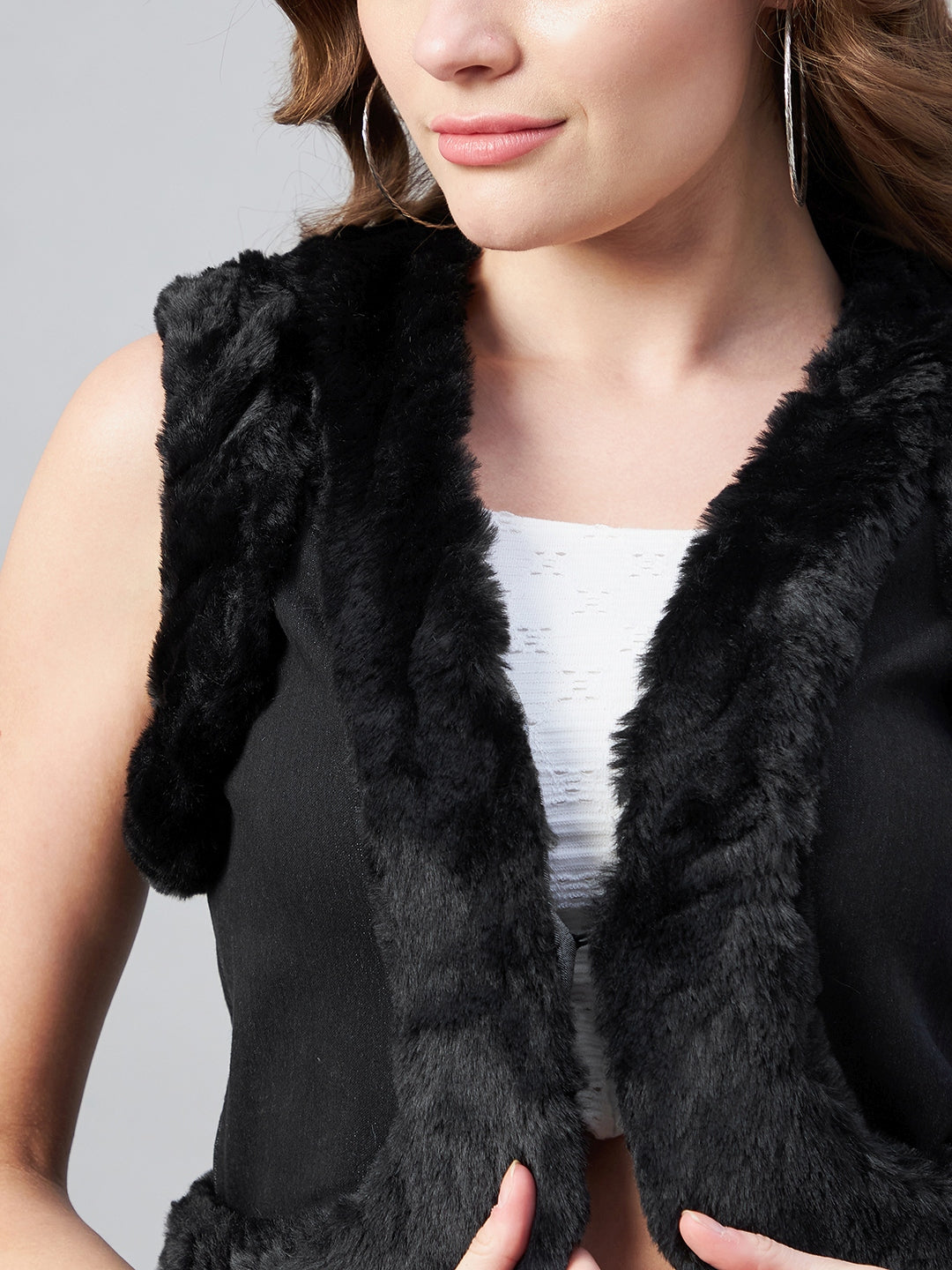 Women's Denim and Fur Trim Bolero Crop Shrug - StyleStone Color :Black Fabric :Denim & Fur Sleeve: Sleeveless Pattern: Solid Wash Care :Machine Wash