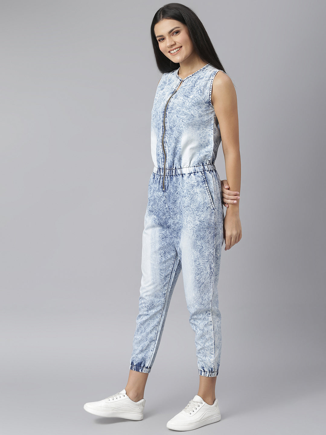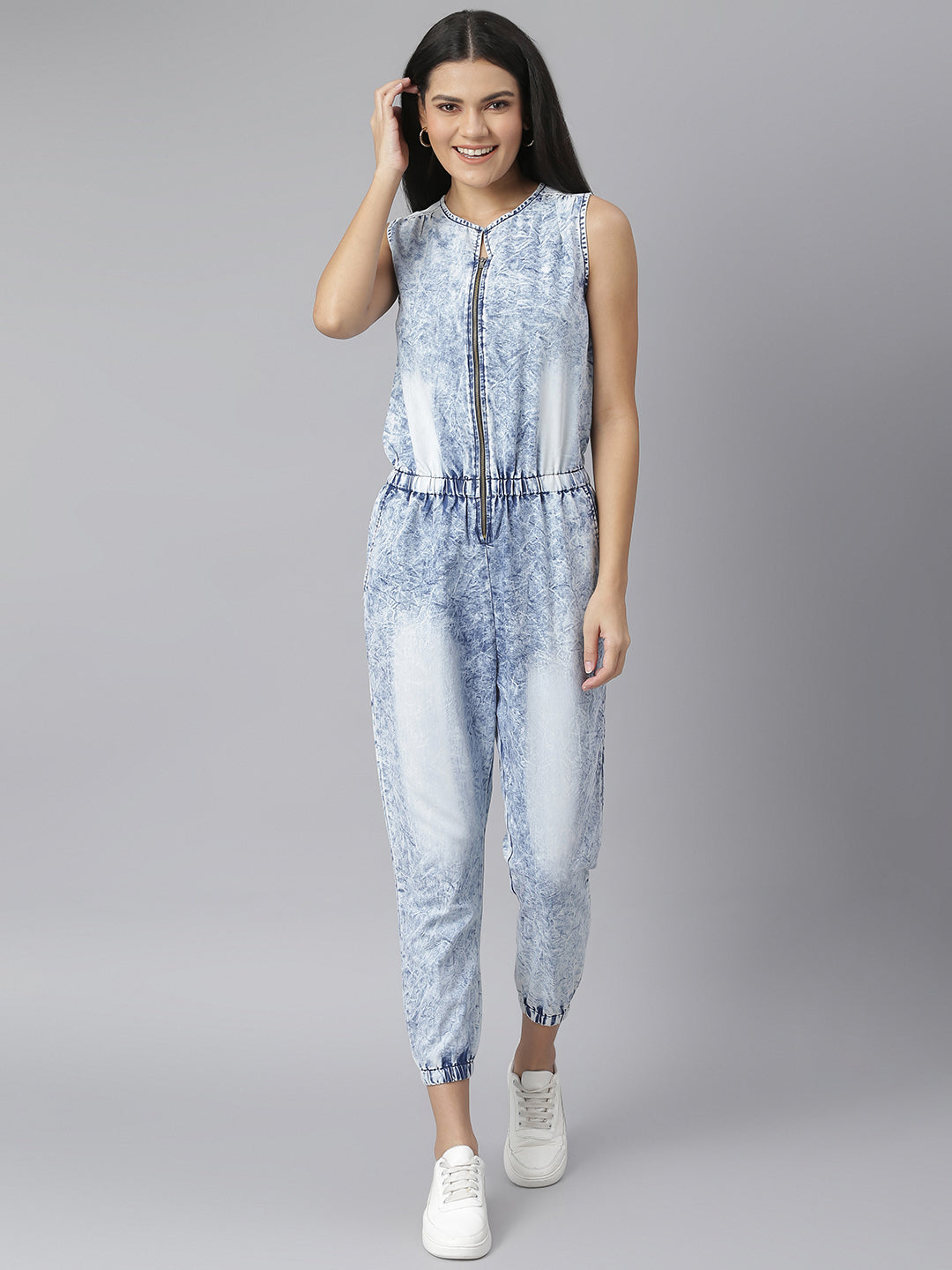 StyleStone Women's Ice Blue Denim Jumpsuit with front Zip Color :Ice Blue Fabric :Denim Sleeve: Sleeveless Pattern: Solid Wash Care :Machine Wash