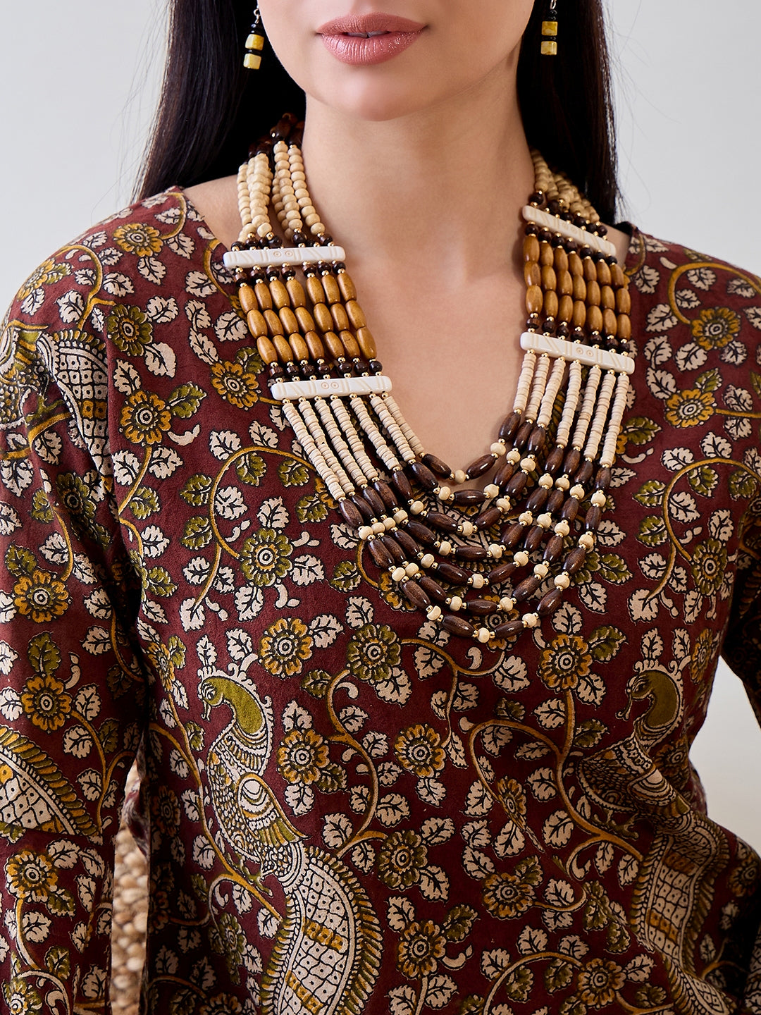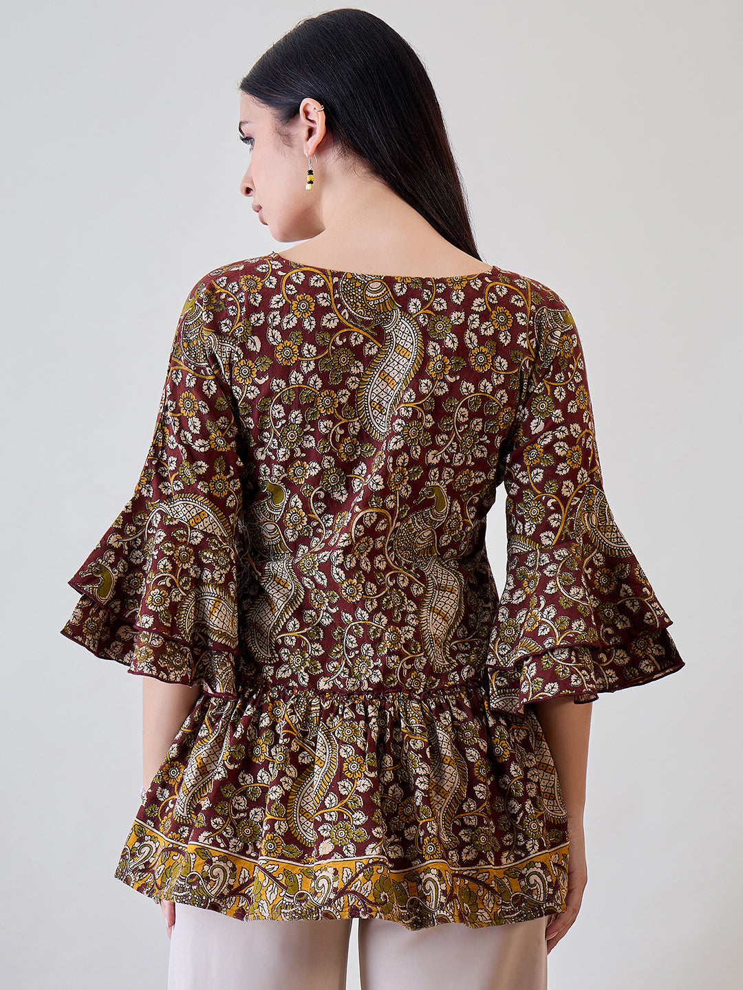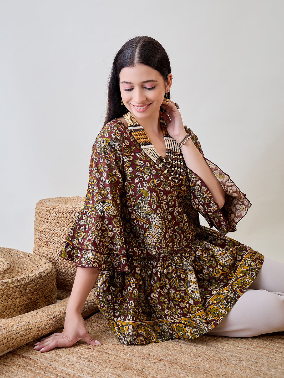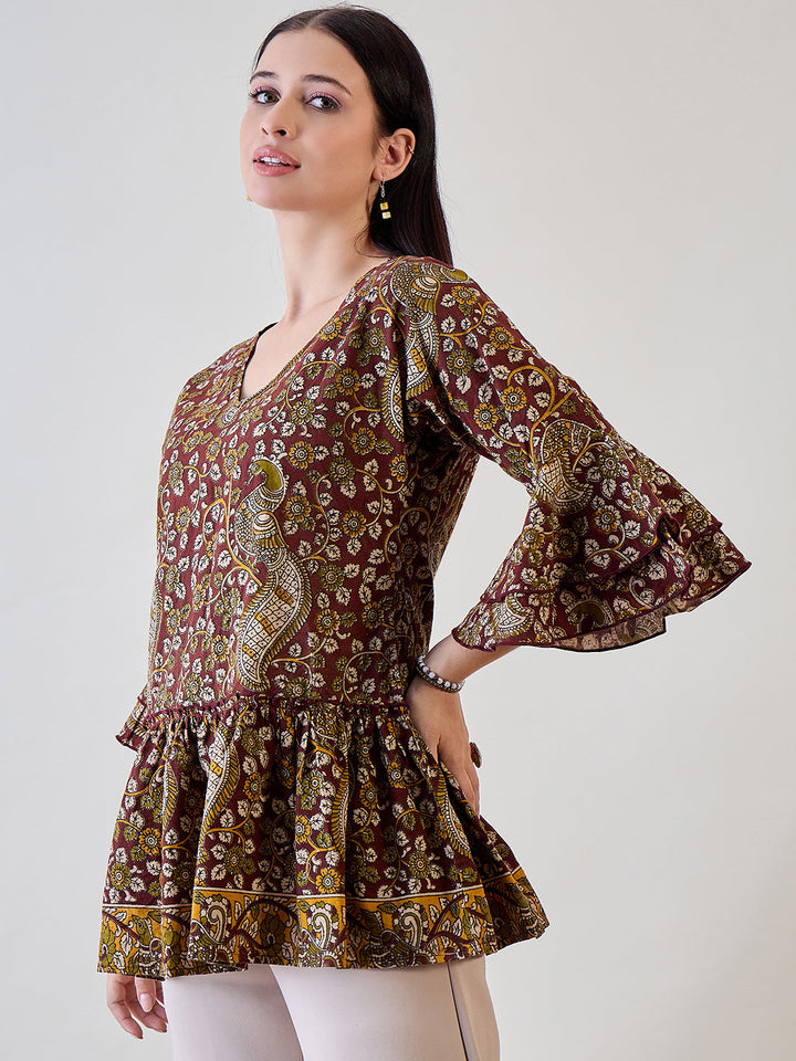 Elegant Kalamkari Printed Cotton Peplum Top Featuring A "V" Neck. Perfect For A Stylish And Trendy Look.