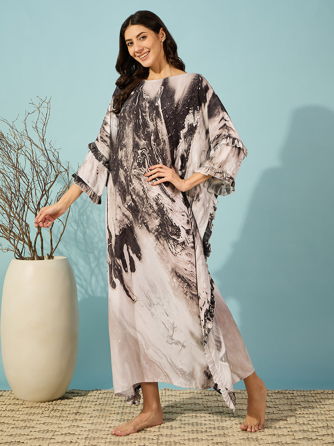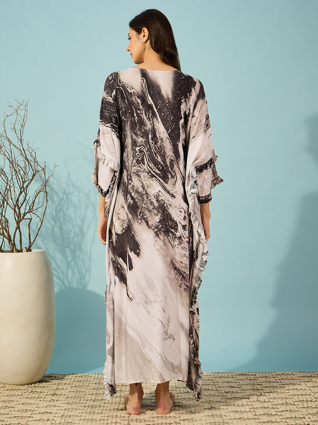 Unveil Timeless Elegance With Our Black Marble Print Super Soft Kaftan. Featuring Double Ruffle Detail, This Piece Combines Luxurious Style With Ultimate Comfort, Making It Perfect For Any Occasion.