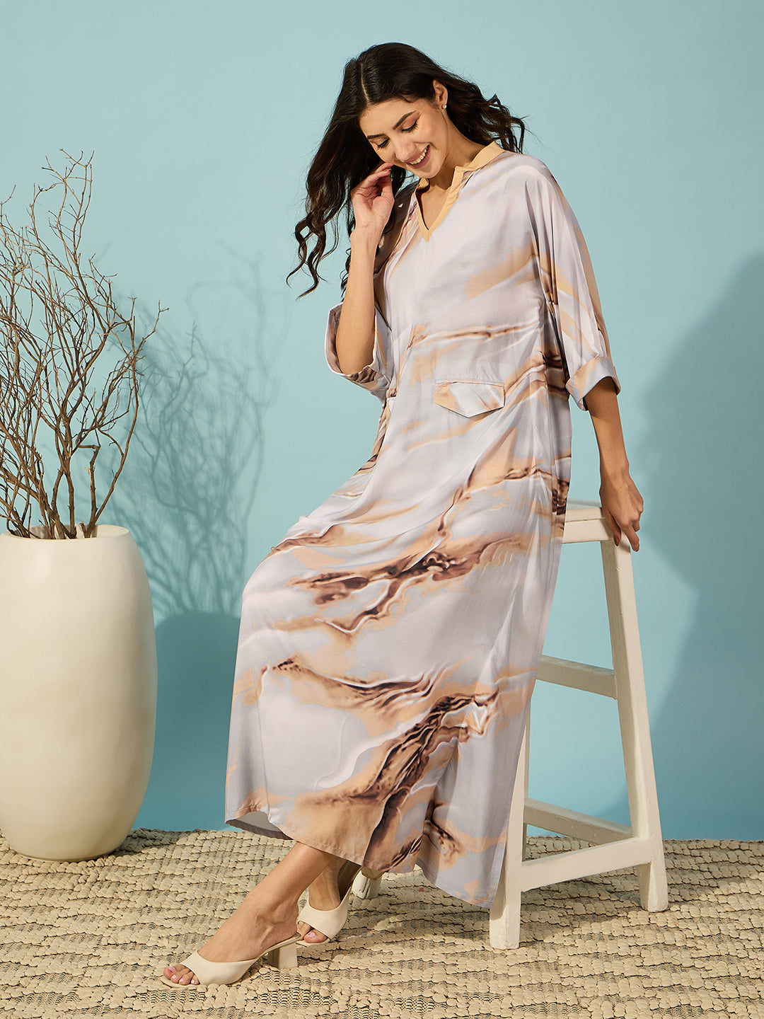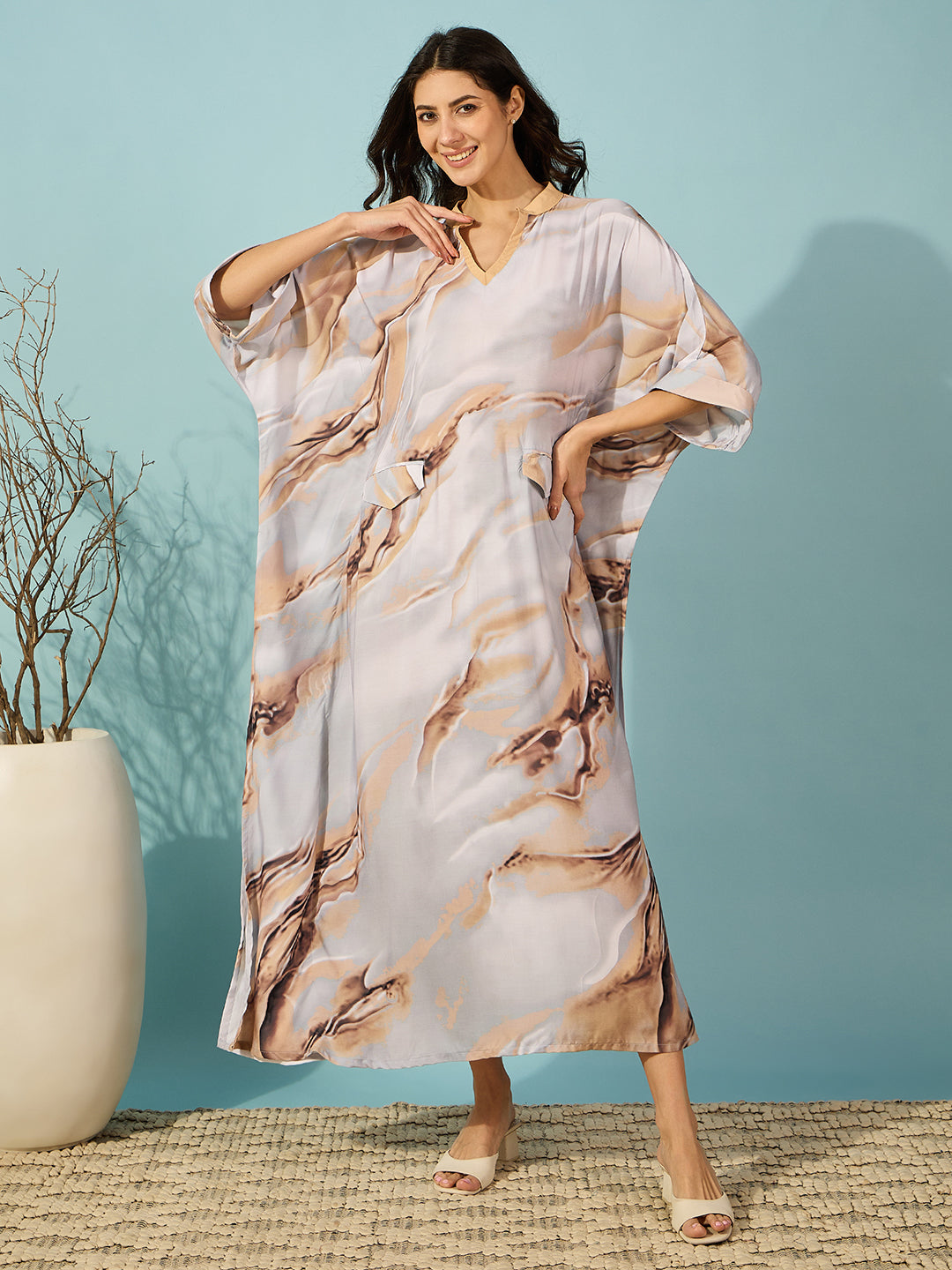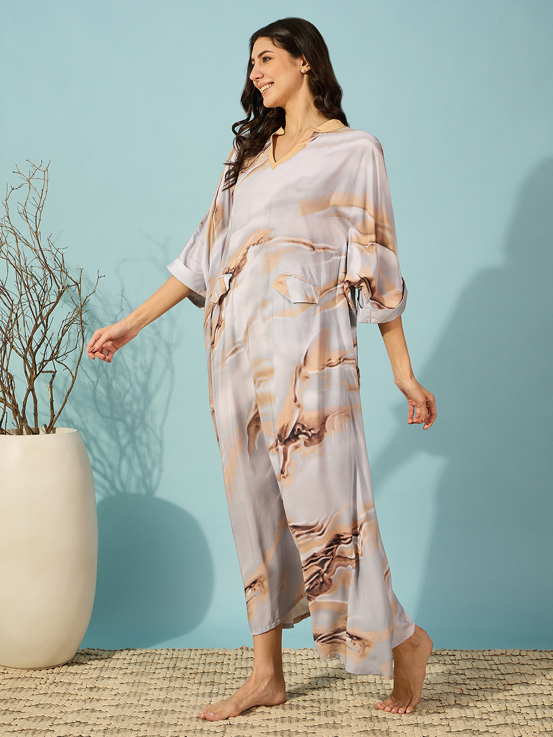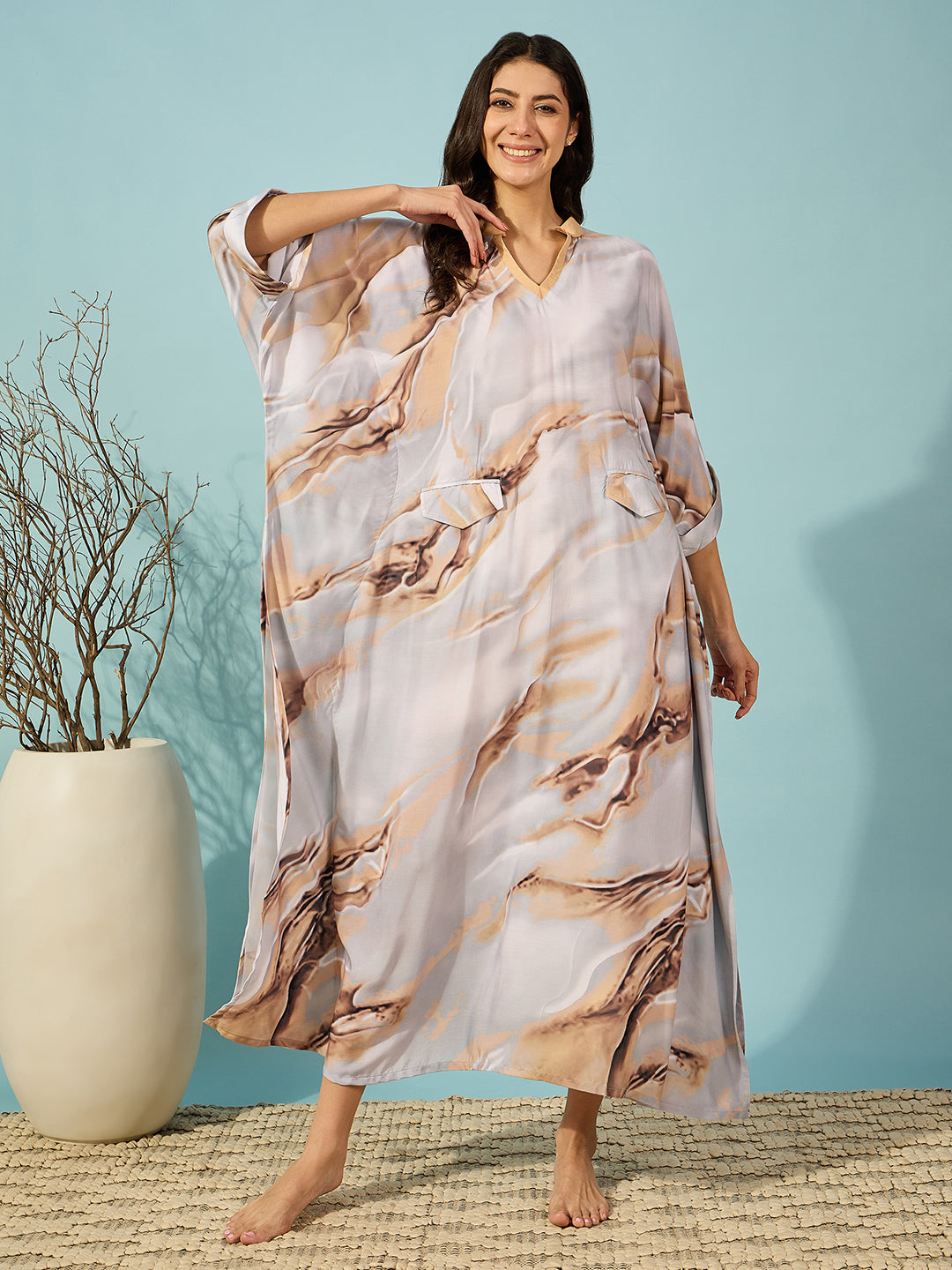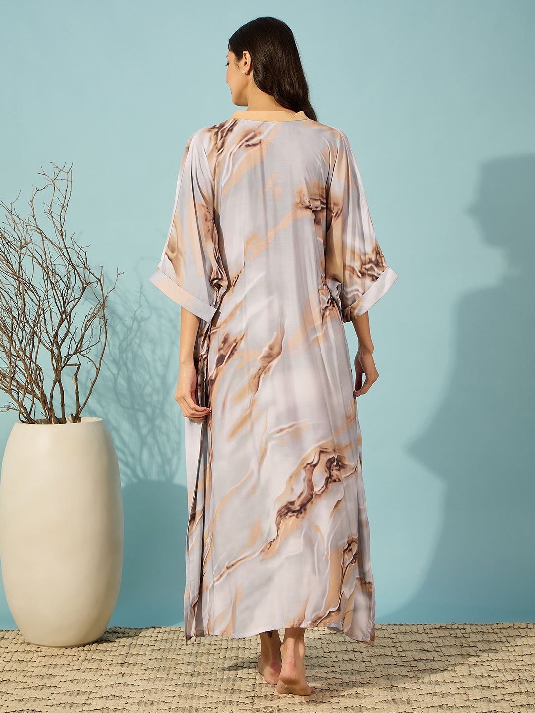Elevate Your Loungewear With Our Grey Marble Gradient Super Soft Kaftan. Featuring A Chic Contrast Collar And A Practical Flap Pocket, This Piece Seamlessly Blends Style And Comfort For An Effortlessly Sophisticated Look.