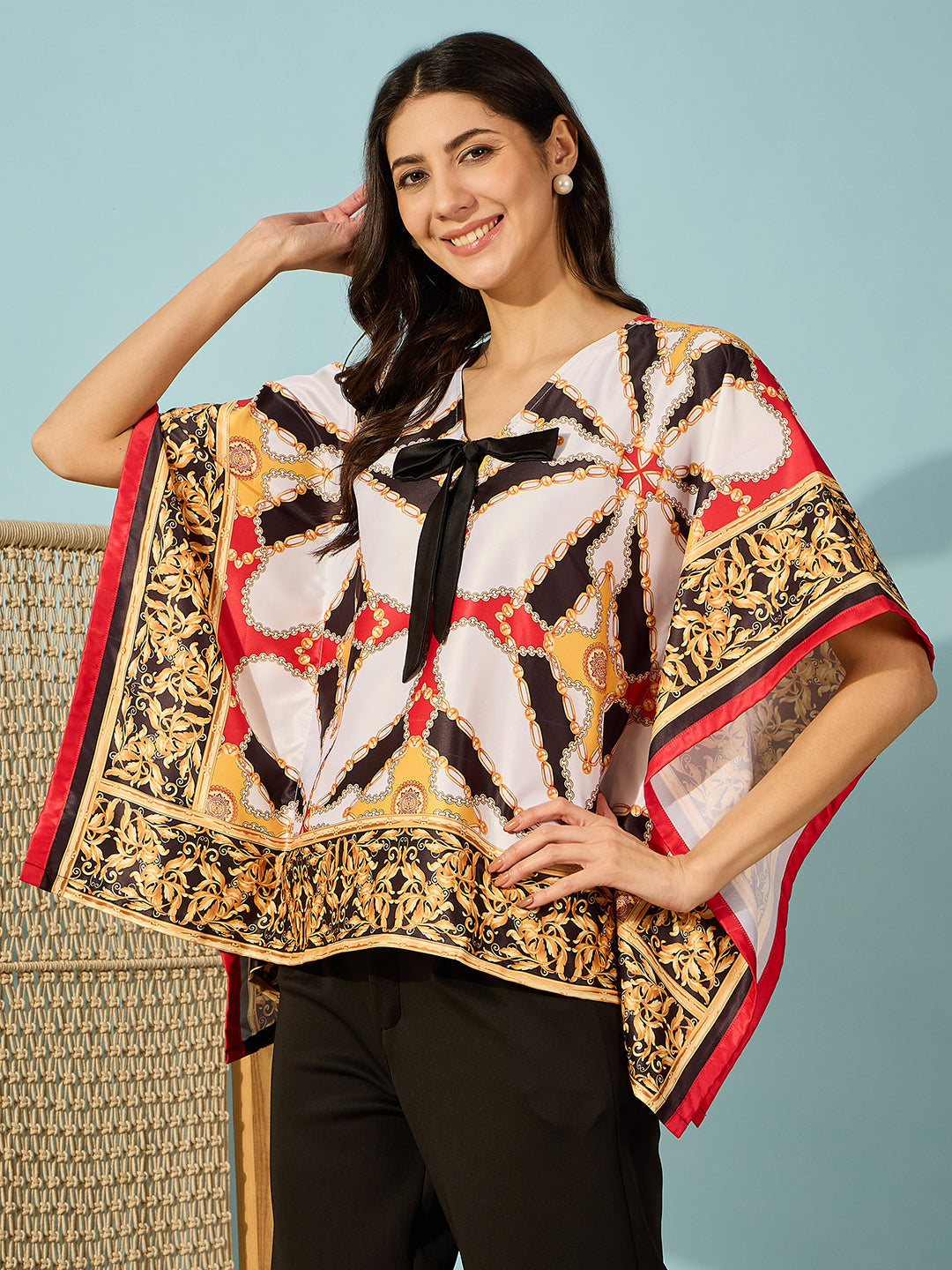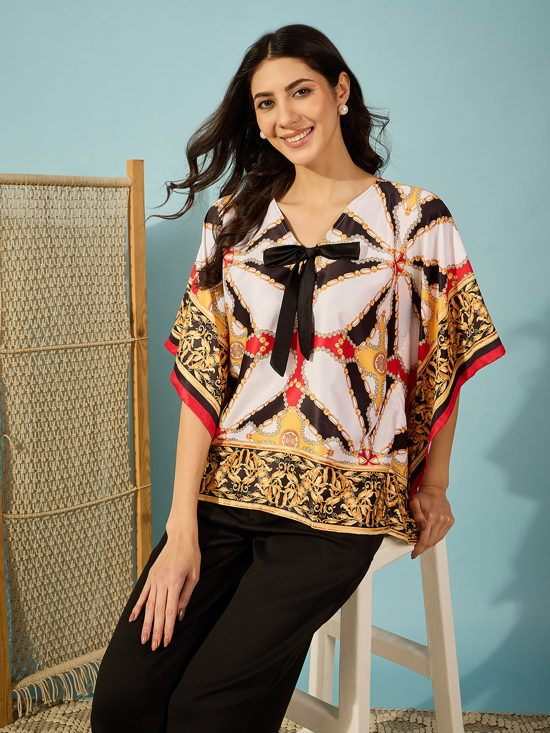 Turn Heads With Our Black Satin Kaftan Crop Top, Featuring Exquisite Baroque Patterns And A Chic Bow Detail. This Luxurious Piece Effortlessly Combines Elegance And A Touch Of Drama, Making It Perfect For Both Daytime And Evening Wear.