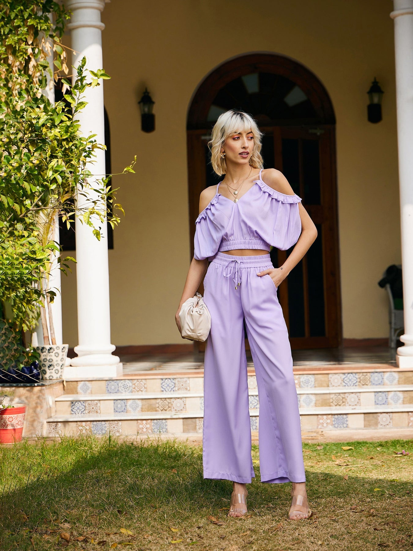 Lavender Strappy V-Neck Crop Top With Palazzos, in Heavy Georgette fabric, Unlined / Polyester Lining, Crop Length Top and Full Length Pants, Comfort Fit, No Closure /Slip On, Straight Hemline and features Tie Detail At Back