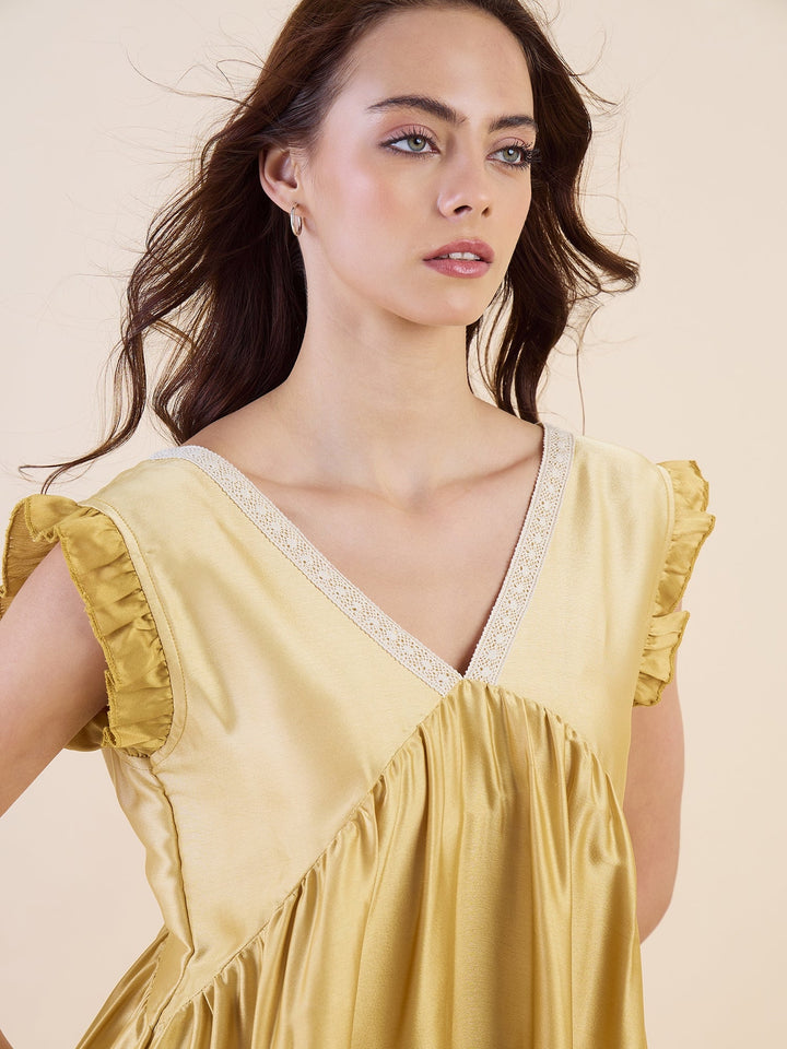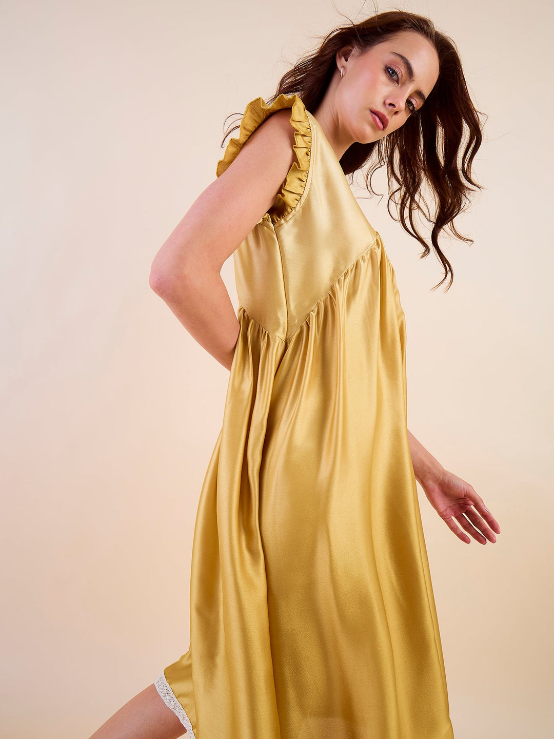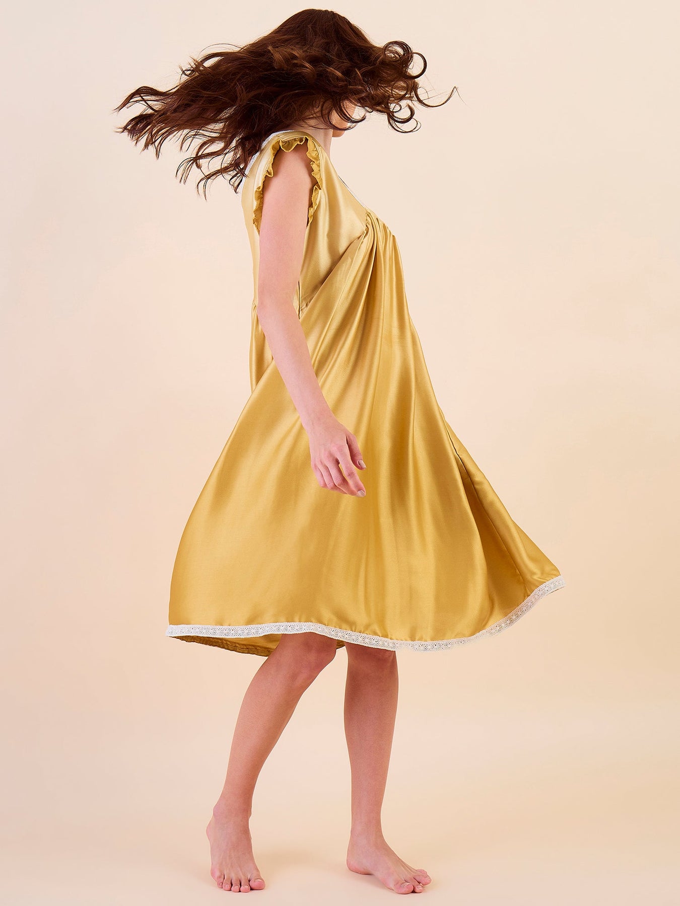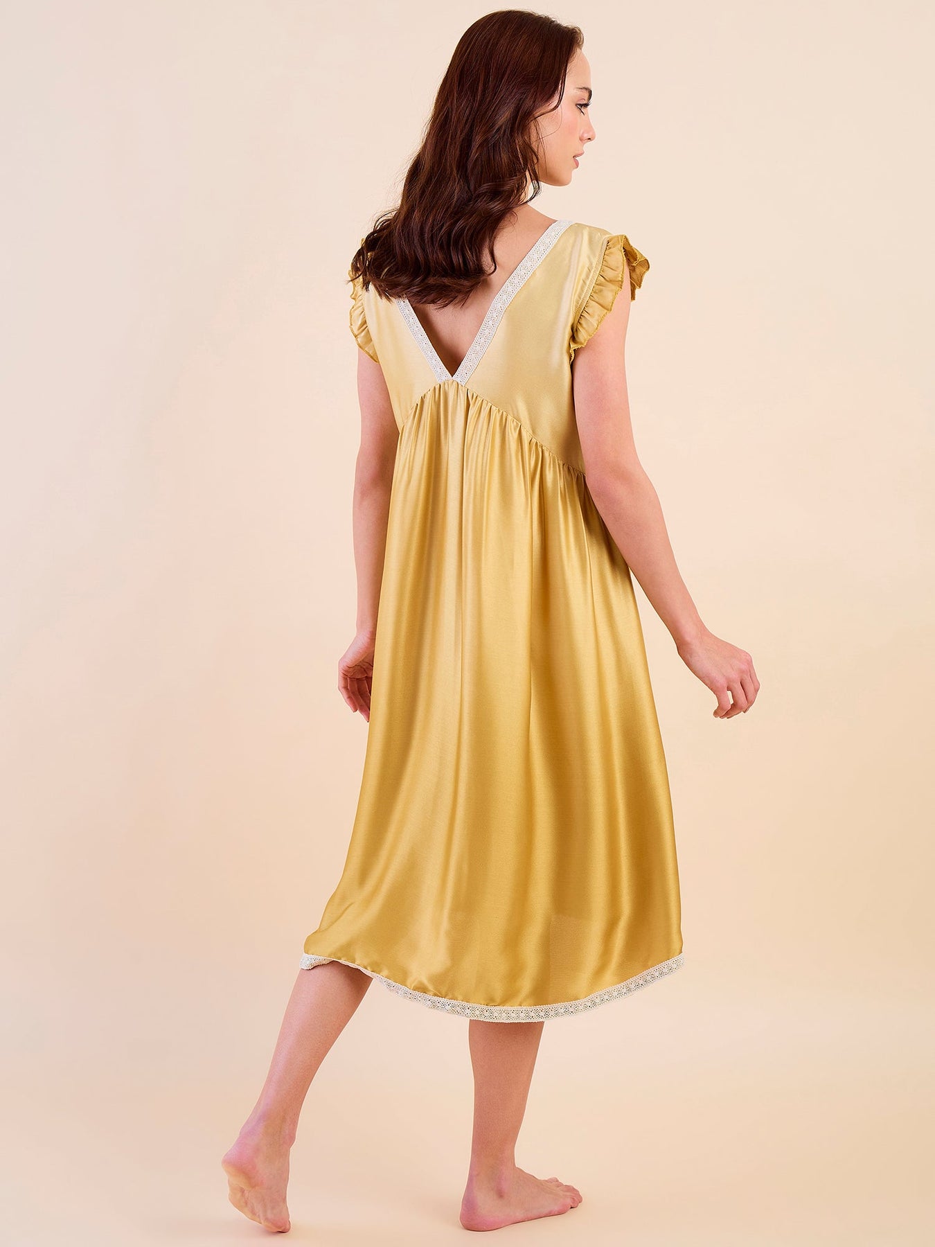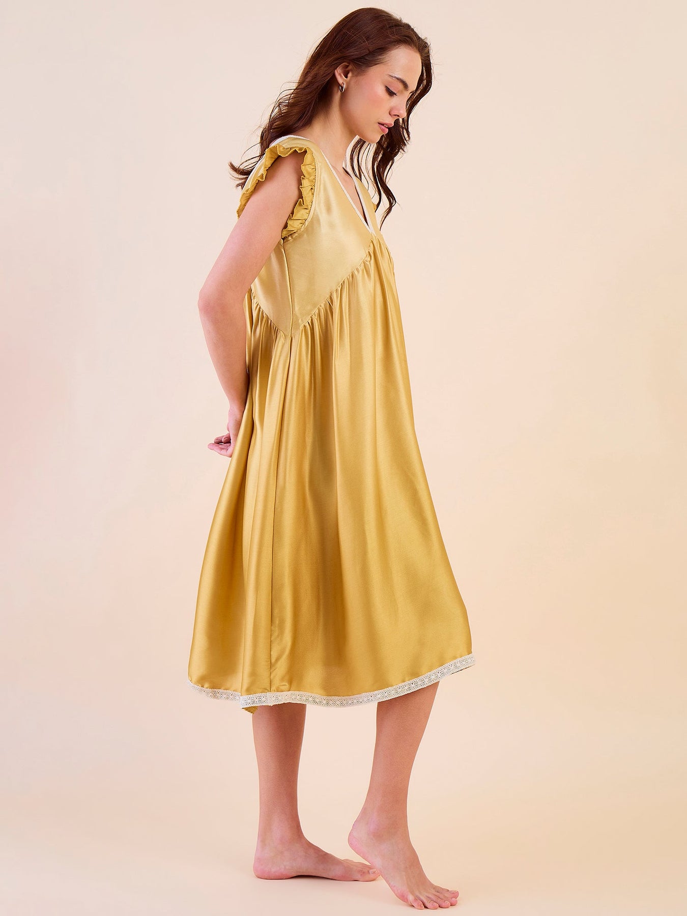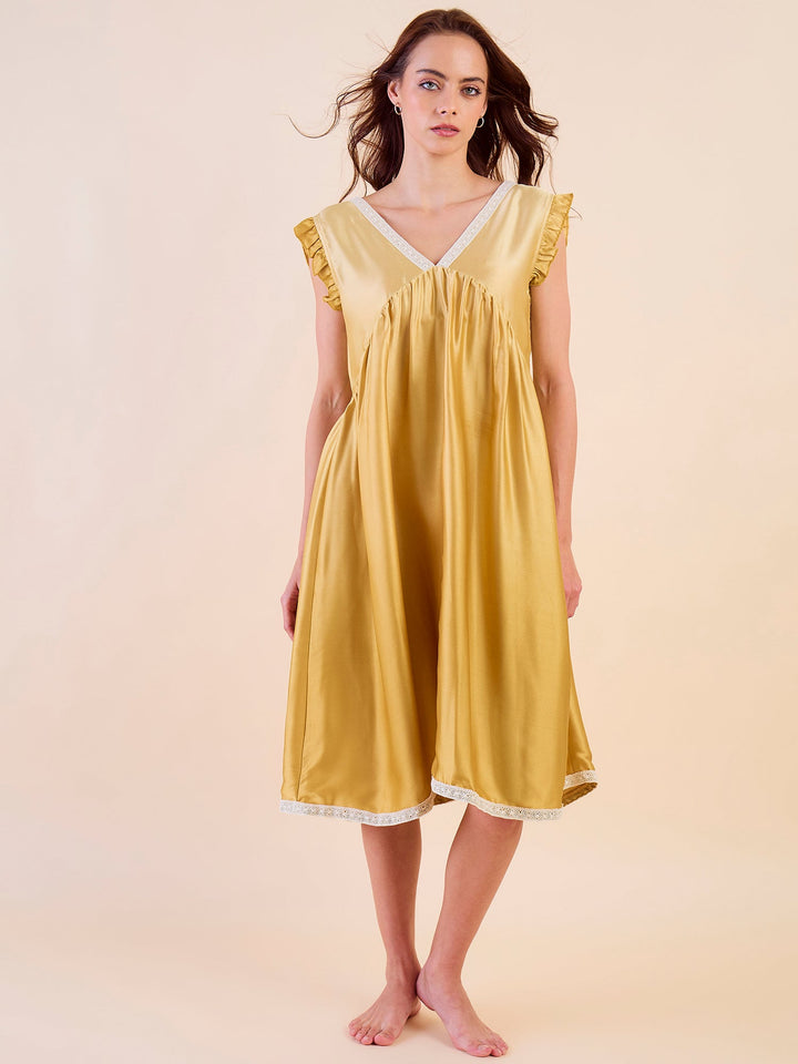 Glamorous Gold Ombre Satin Negligee With Lace-Detailed Neckline And Hem, A Cute Yoke Style, And Playful Frilled Sleeves.