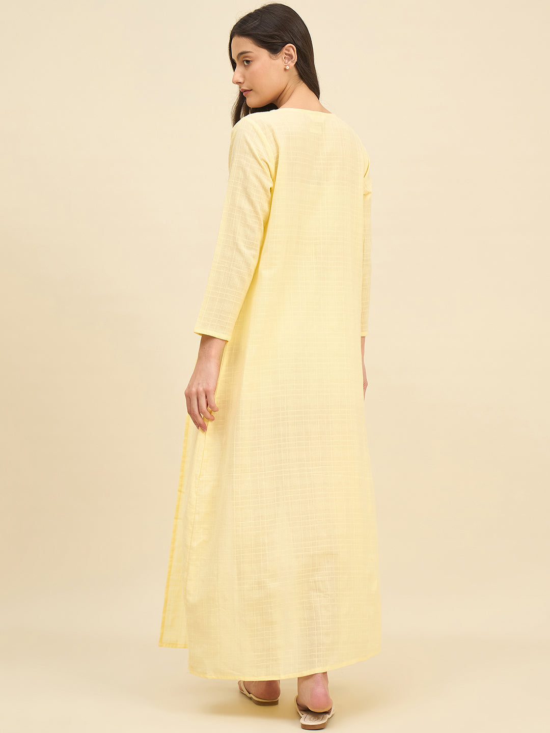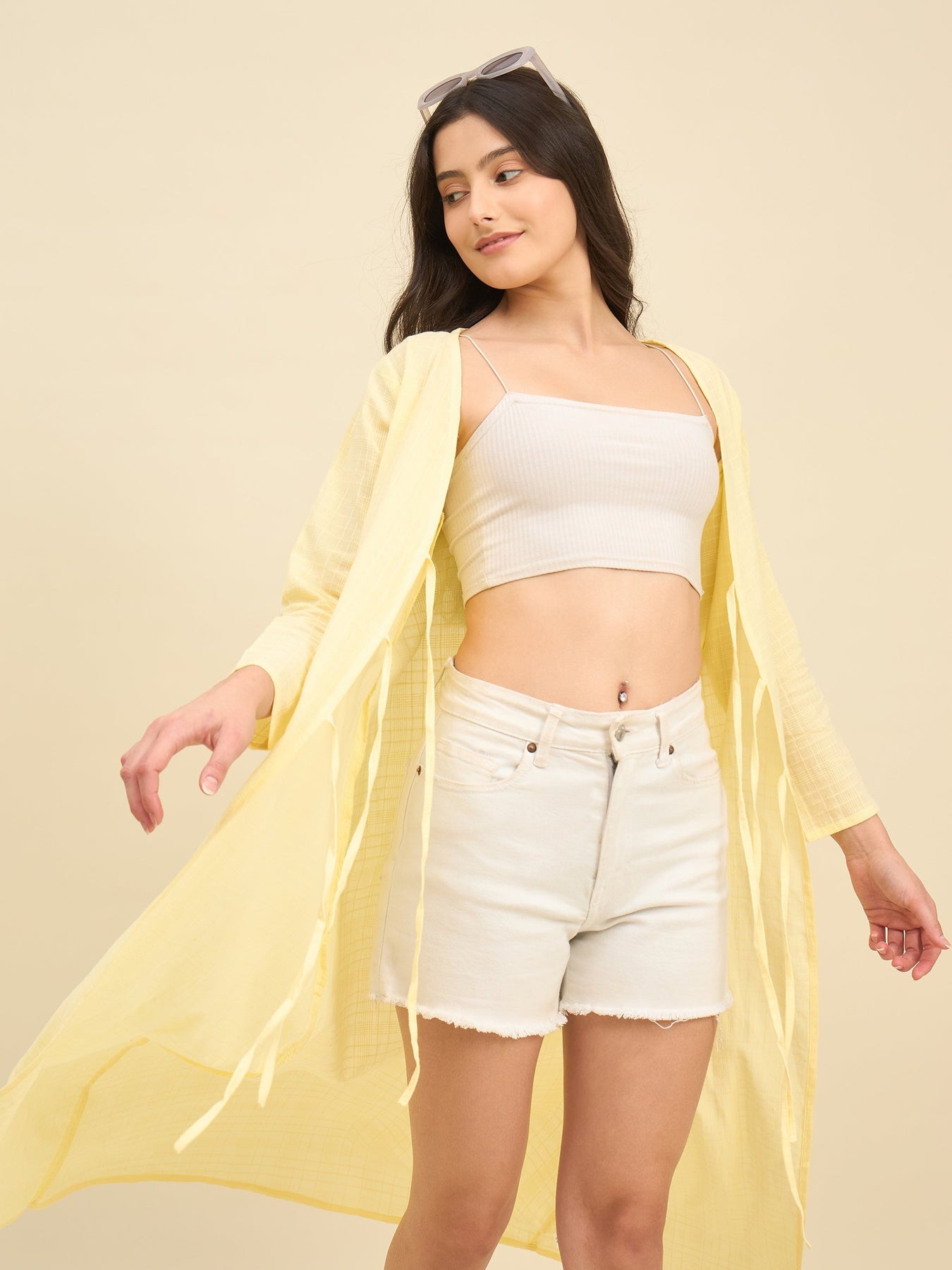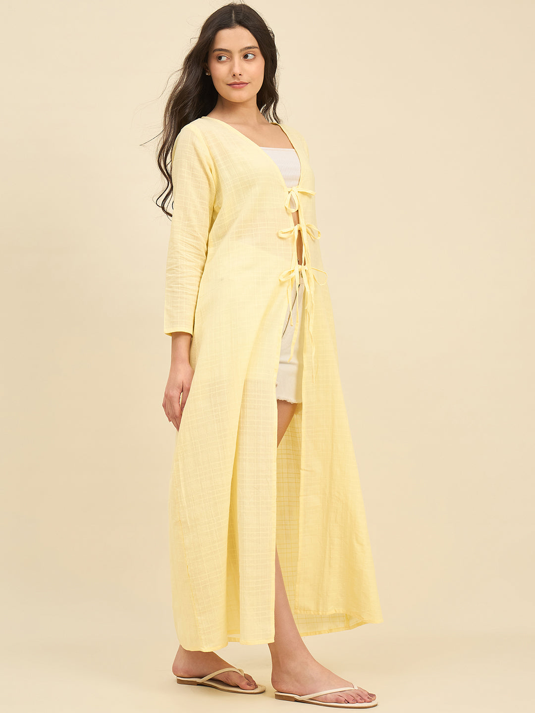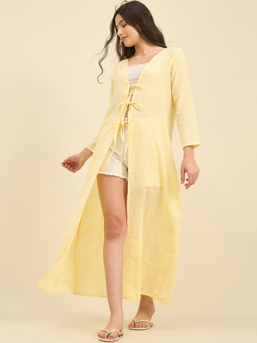 Yellow Self Texture Full Sleeve Resorty Cover Up With Cute Tie Up On The Front